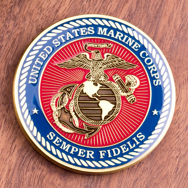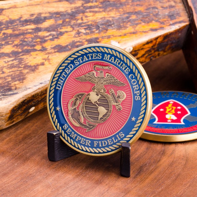 This 1.75″ antique brass challenge coin features the spearhead-shaped 10th Marines logo, in scarlet, gold and white, on a dark blue background. Below the logo are the raised words, “Camp Lejeune, NC,” and “Home of the Marine Expeditionary Forces in Readiness” finds it place at the bottom within a scarlet banner. The reverse side features a brass Eagle, Globe, and Anchor overtop of a sunburst and scarlet background. The text “United States Marine Corps” and “Semper Fidelis” flanks the EGA in a dark blue outer ring, and the entire side has a rope line edge. Both sides of this coin are covered with a protective clear epoxy coating.