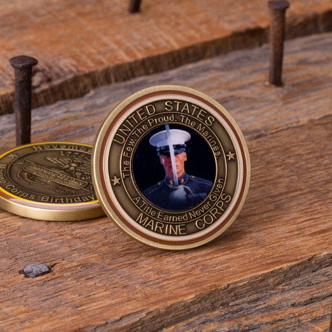 This beautiful 1.75″ antique brass challenge coin features a picture insert on the front side of a proud Marine and sword. The picture is encircled by the phrase: “The Few. The Proud. The Marines. A Title Earned Never Given.” The back of the coin features the date the Marine Corps was founded, November 10, 1775, and the Eagle, Globe, and Anchor displayed proudly with the words, “Celebrating 236 Years of Excellence.” Scarlet and gold rings add a finishing touch, and the coin has a protective clear epoxy coating on both sides.