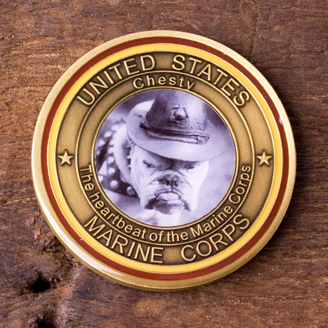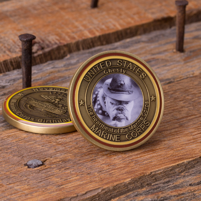 The 2013 Marine Corps Birthday challenge coin features a black and white picture insert of the Marine Corps mascot, Chesty. The front of the coin includes the words: “United States Marine Corps, Chesty, the heartbeat of the Marine Corps”. The back of the coin declares “Celebrating 238 Years of Excellence over the Eagle, Globe and Anchor”. The Marine Corps Birthday of November 10, 1775 is proudly displayed along the top. This antique brass coin is 1.75″ and has epoxy coating on both sides.
