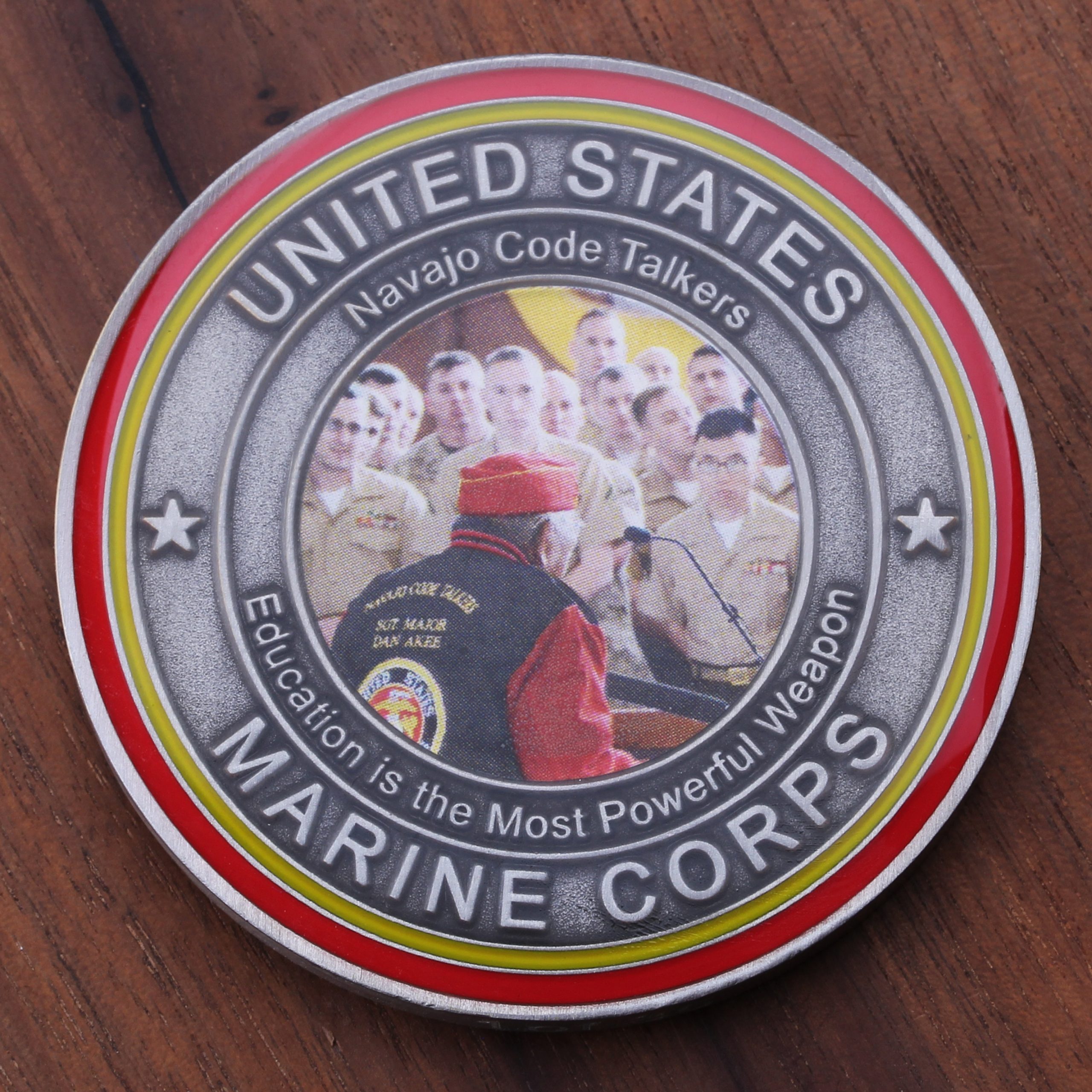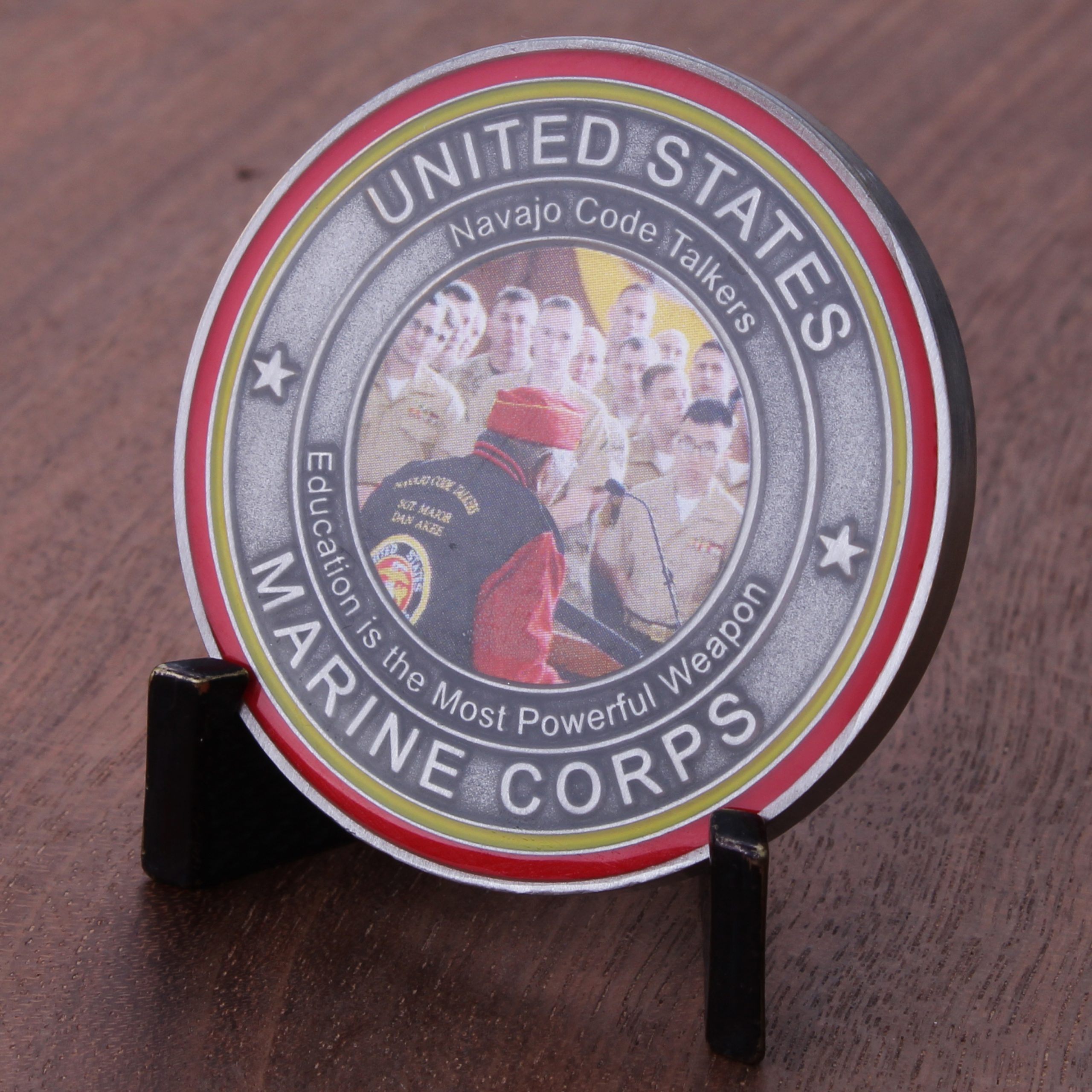 The front of the coin includes the words “United States Marine Corps,” “Navajo Code Talkers,” and “Education is the Most Powerful Weapon”