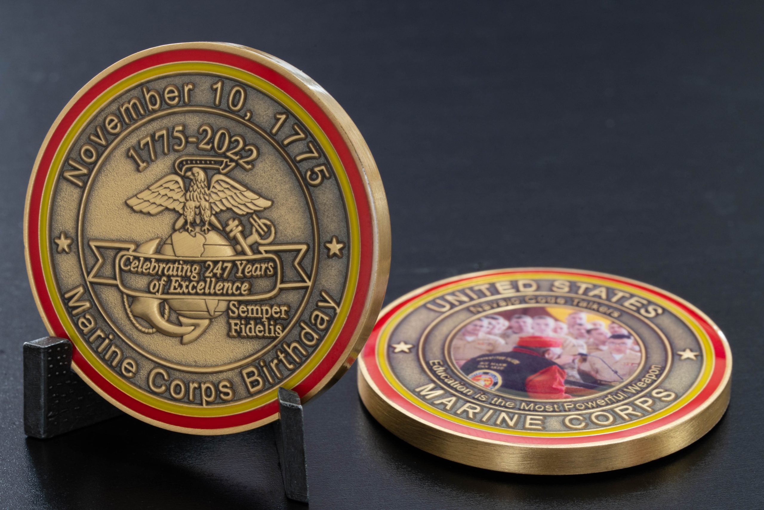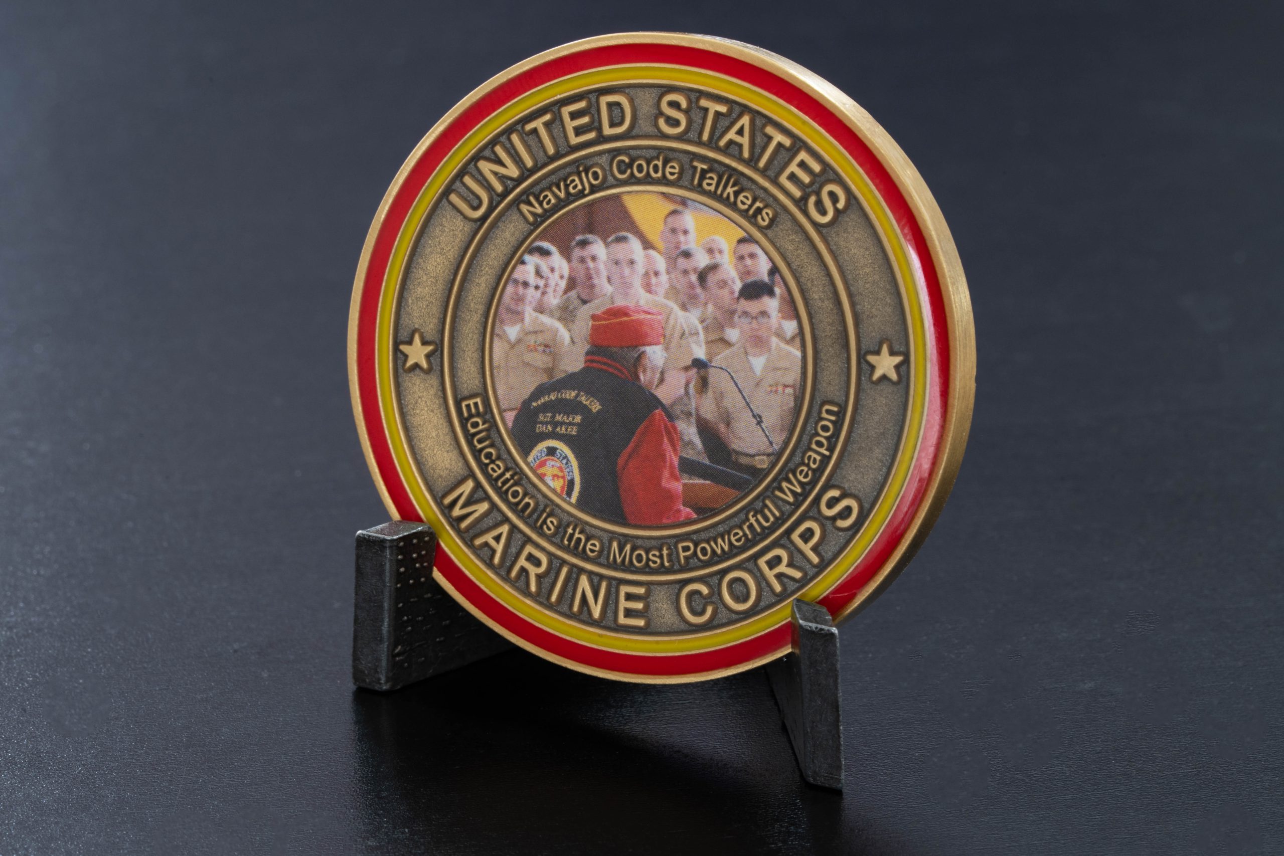 This 1.75″ antique brass 2022 Marine Birthday challenge coin features a color picture insert of Navajo Code Talker Sergeant Major Dan Akee giving a speech in front of various service members about his time in the Marine Corps. The front of the coin includes the words “United States Marine Corps,” “Navajo Code Talkers,” and “Education is the Most Powerful Weapon” The back of the coin declares, “Celebrating 247 Years of Excellence” over the Eagle, Globe and Anchor. The Marine Corps Birthday of November 10, 1775 is proudly displayed along the top. Scarlet and gold rings add a finishing touch, and the coin has a protective clear epoxy coating on both sides. Semper Fi!