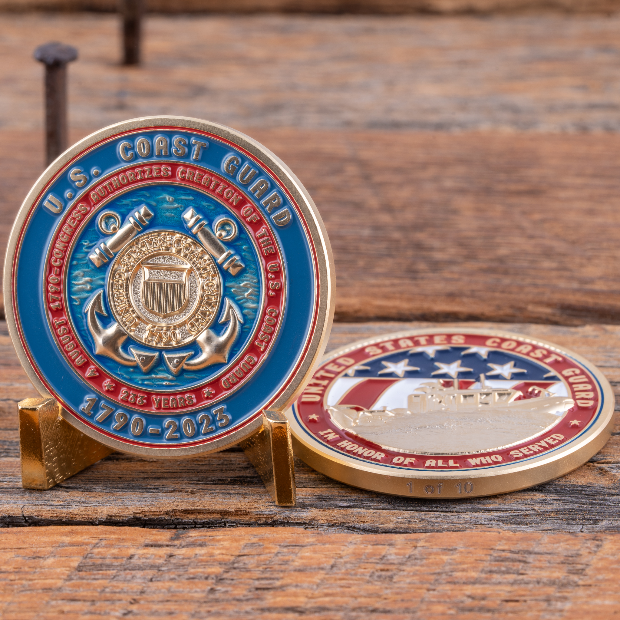 Celebrate 233 years of the United States Coast Guard with this magnificent Challenge Coin! Measuring at 1.75″, this coin boasts a satin gold finish. The front of the coin presents a detailed 3D relief of a Coast Guard ship, bravely navigating tumultuous seas. Behind this powerful image, the American flag waves in vibrant color, echoing the spirit of the nation. Encircling the outer ring of the coin’s front, the words “* United States Coast Guard * In Honor of All Who Served” are embossed, set against a vivid red background that enhances the coin’s visual appeal.