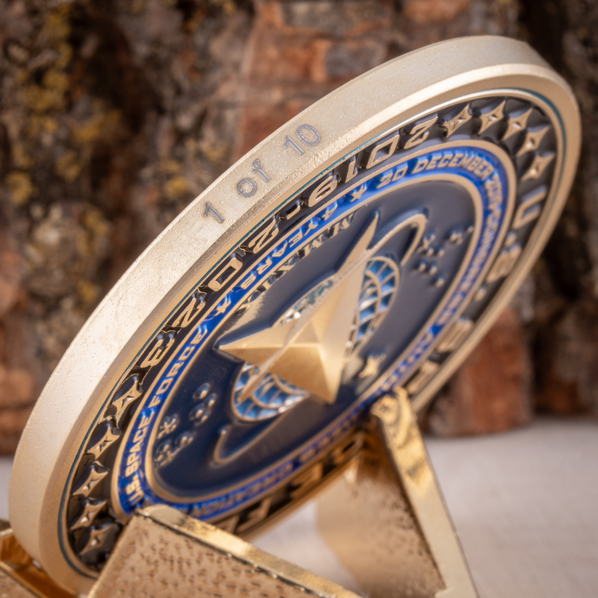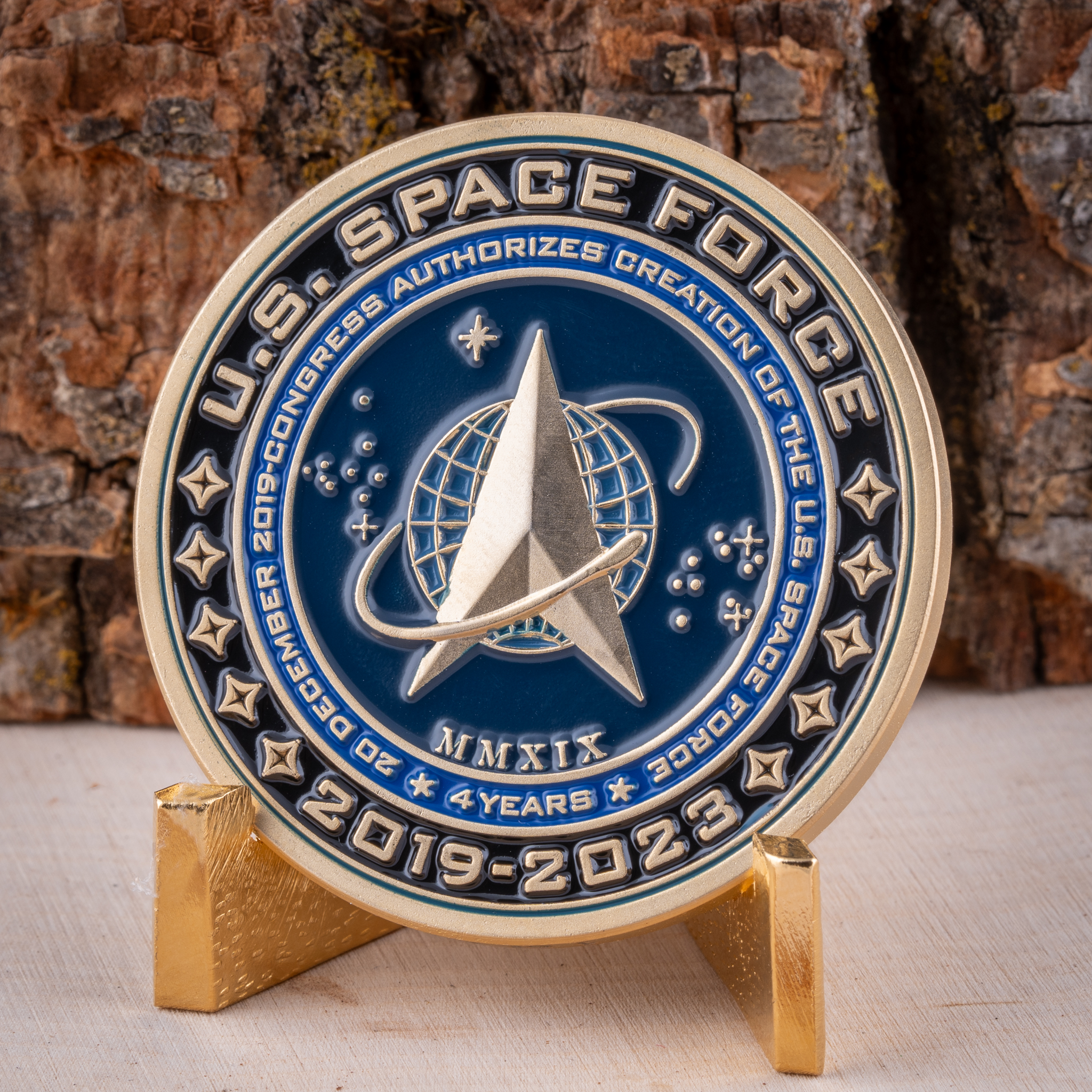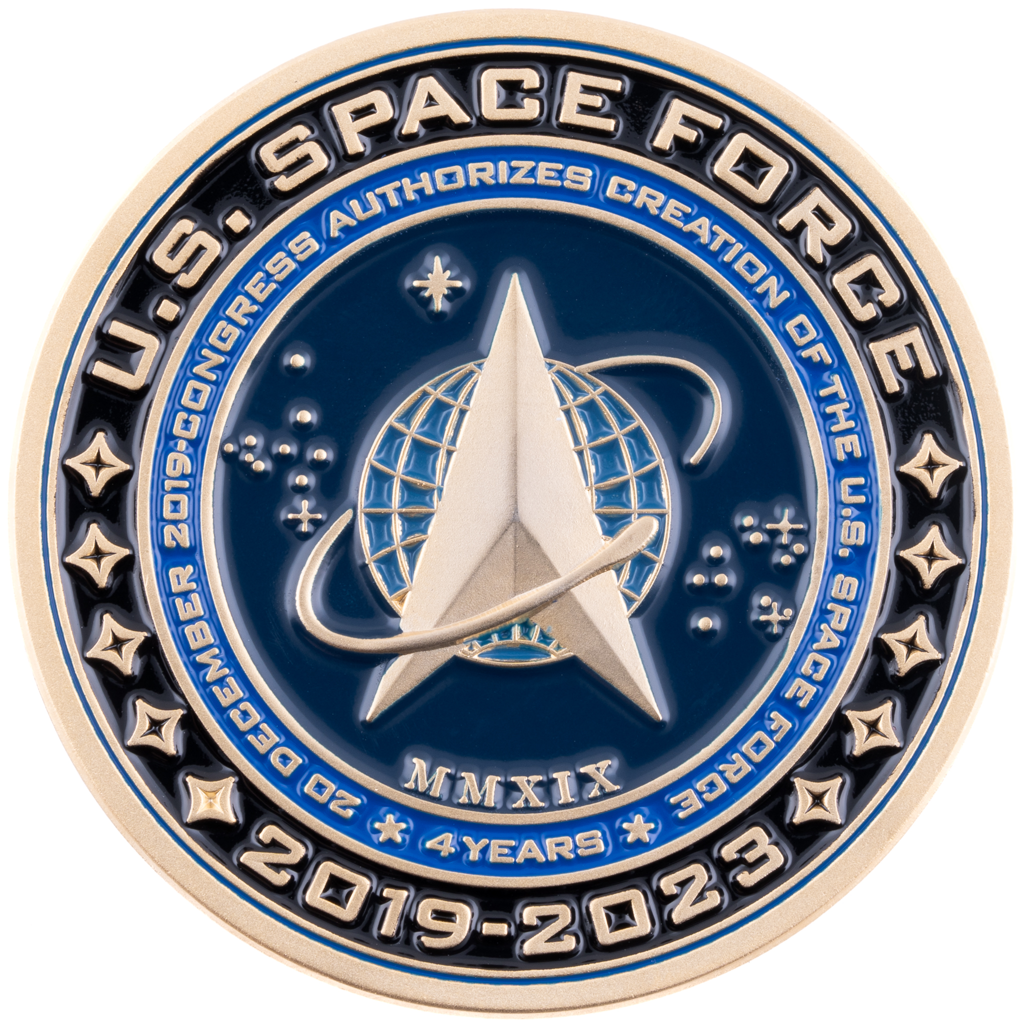 On the reverse side, the Space Force Logo stands out in raised satin gold, contrasted against a deep blue paint fill background. Surrounding the logo, the inscription “20 December 2019 – Congress Authorizes Creation of the U.S. Space Force * 4 Years *” is presented in raised satin gold, complemented by a light blue background. The coin’s outermost ring proudly proclaims “U.S. Space Force 2019-2023”, with the words raised in satin gold and set against a deep black paint fill background, providing a stark contrast and completing the coin’s distinguished design.