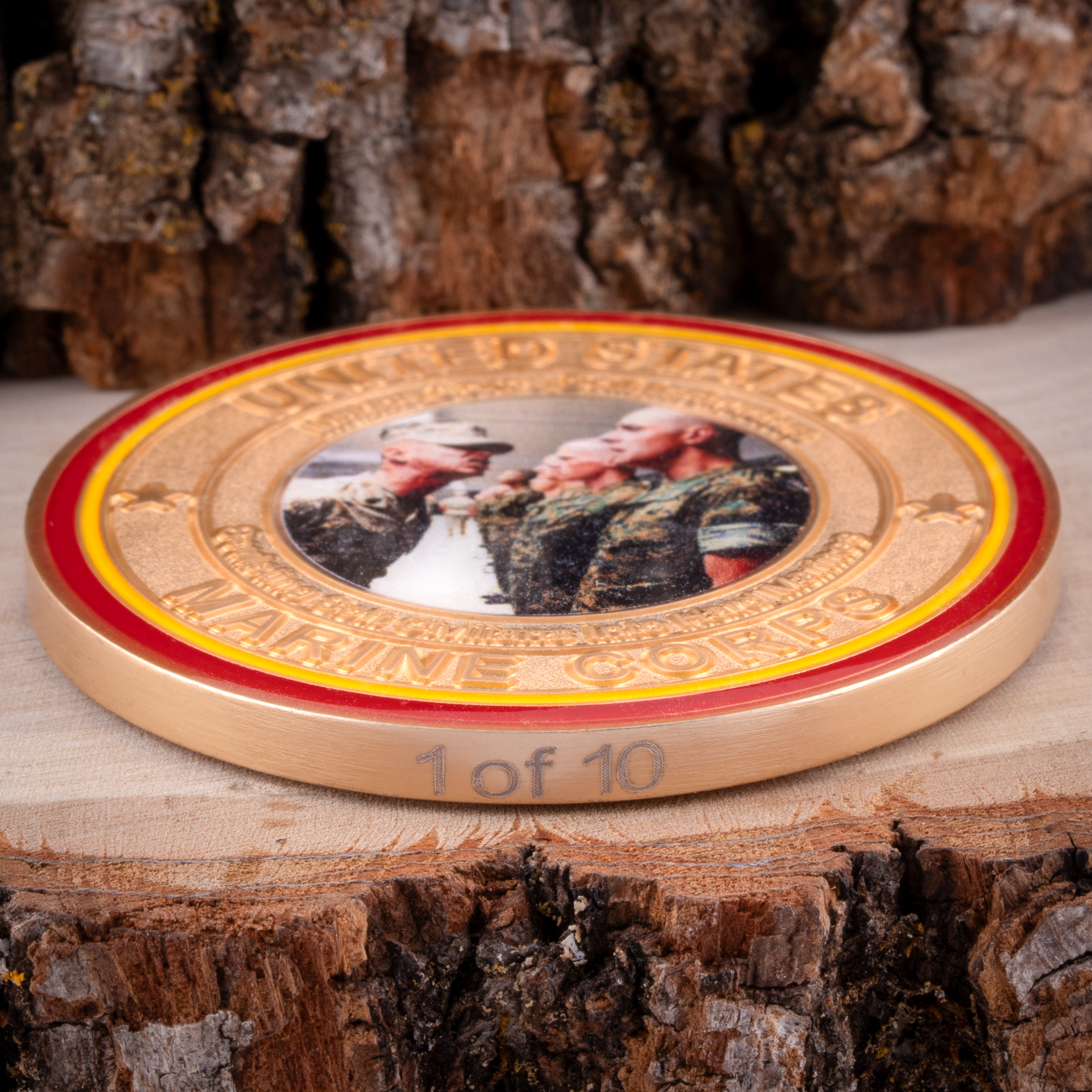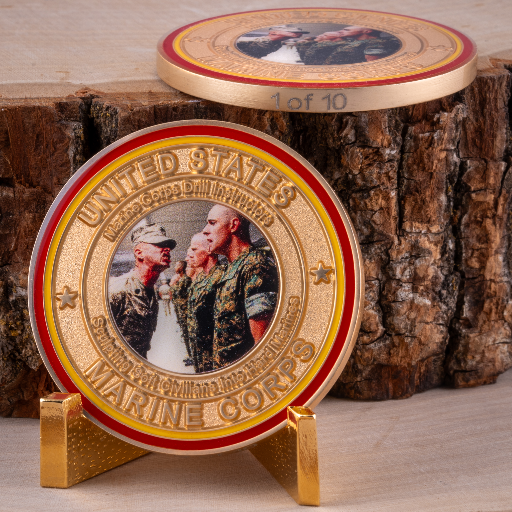 This 1.75″ satin gold 2023 Ultra Limited Edition Marine Birthday challenge coin takes things up a notch further with a stunning satin gold finish. It features a color picture insert of a Marine Corps Drill Instructor training new recruits, helping sculpt them into Marines. The front of the coin includes the words “United States Marine Corps,” “Drill Instructors” and “Sculpting Soft Civilians into Hard Marines” The back of the coin declares, “Celebrating 248 Years of Excellence” over the Eagle, Globe and Anchor. The Marine Corps Birthday of November 10, 1775 is proudly displayed along the top. Scarlet and gold rings add a finishing touch, and the coin has a protective clear epoxy coating on both sides. Each coin is laser etched with it’s number in the limited series of only 10 coins, and comes with a Certificate of Authenticity. Semper Fi!