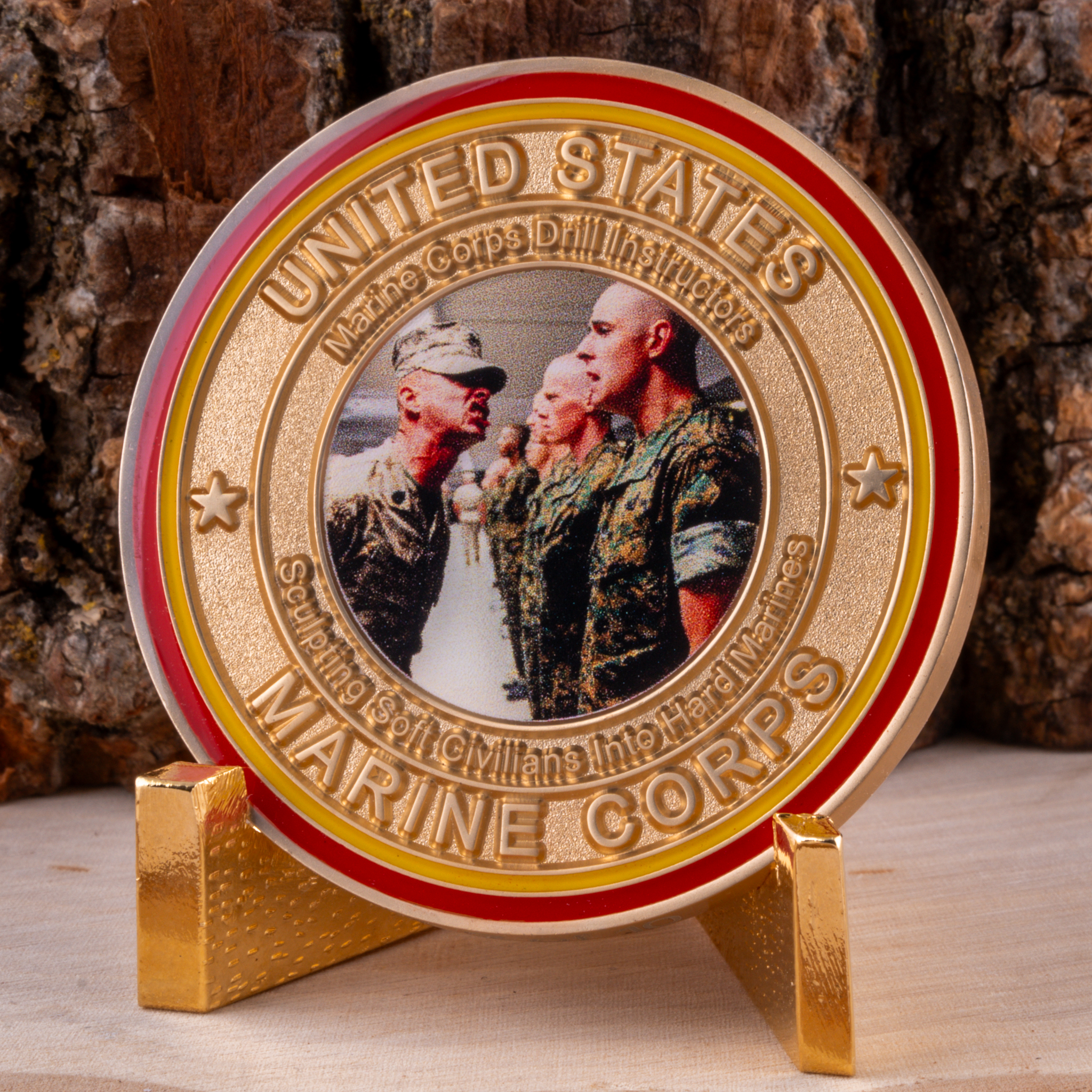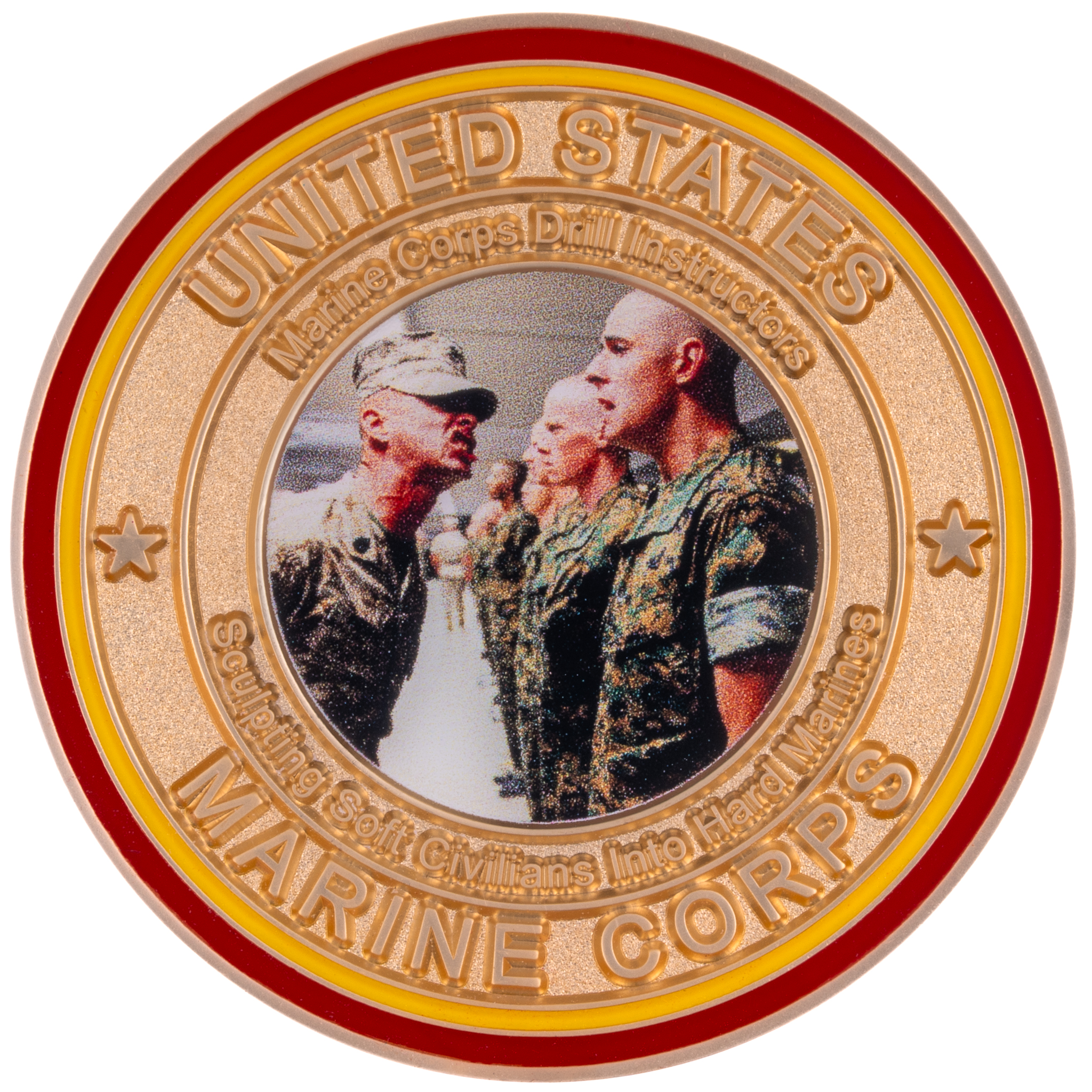 It features a color picture insert of a Marine Corps Drill Instructor training new recruits, helping sculpt them into Marines. The front of the coin includes the words “United States Marine Corps,” “Drill Instructors” and “Sculpting Soft Civilians into Hard Marines”