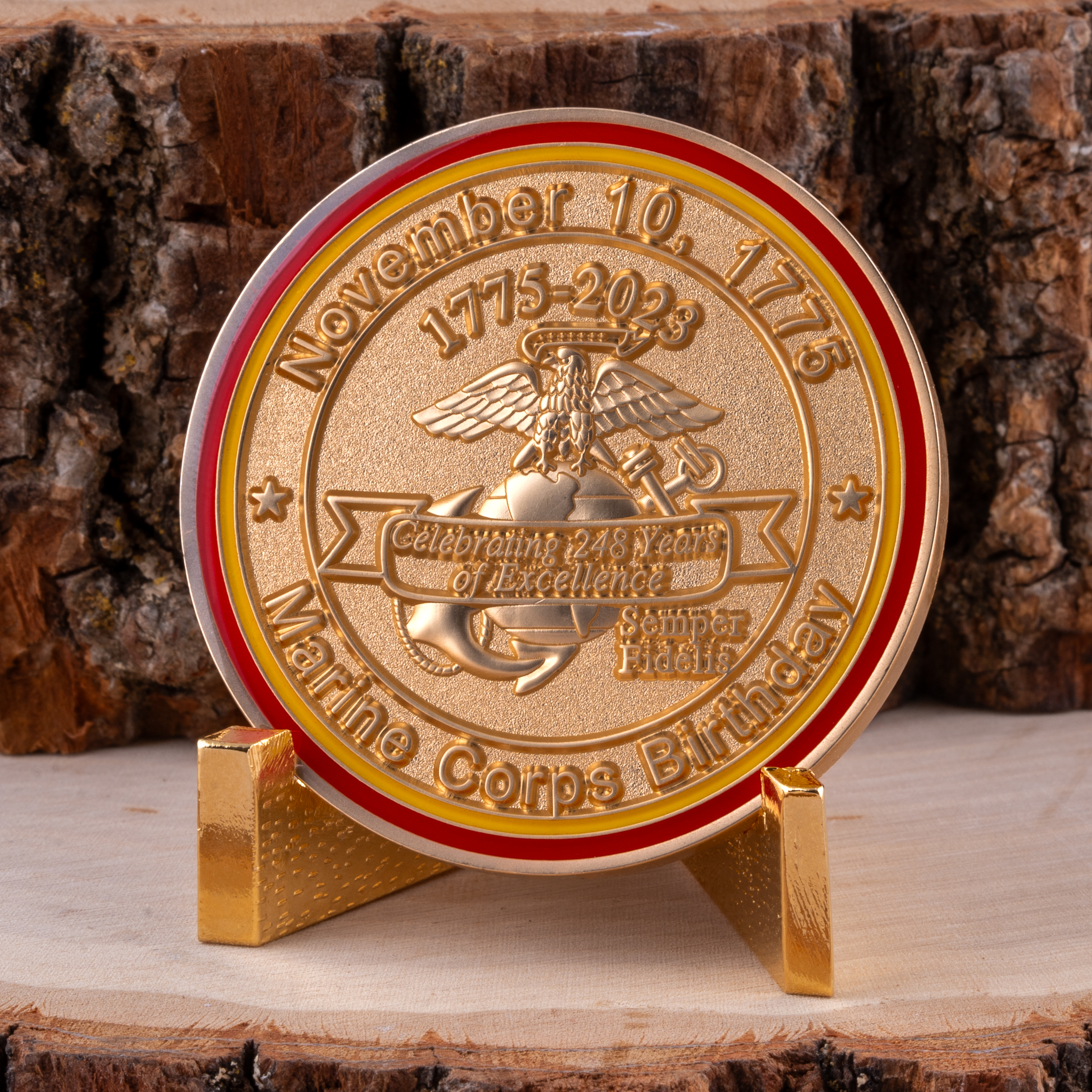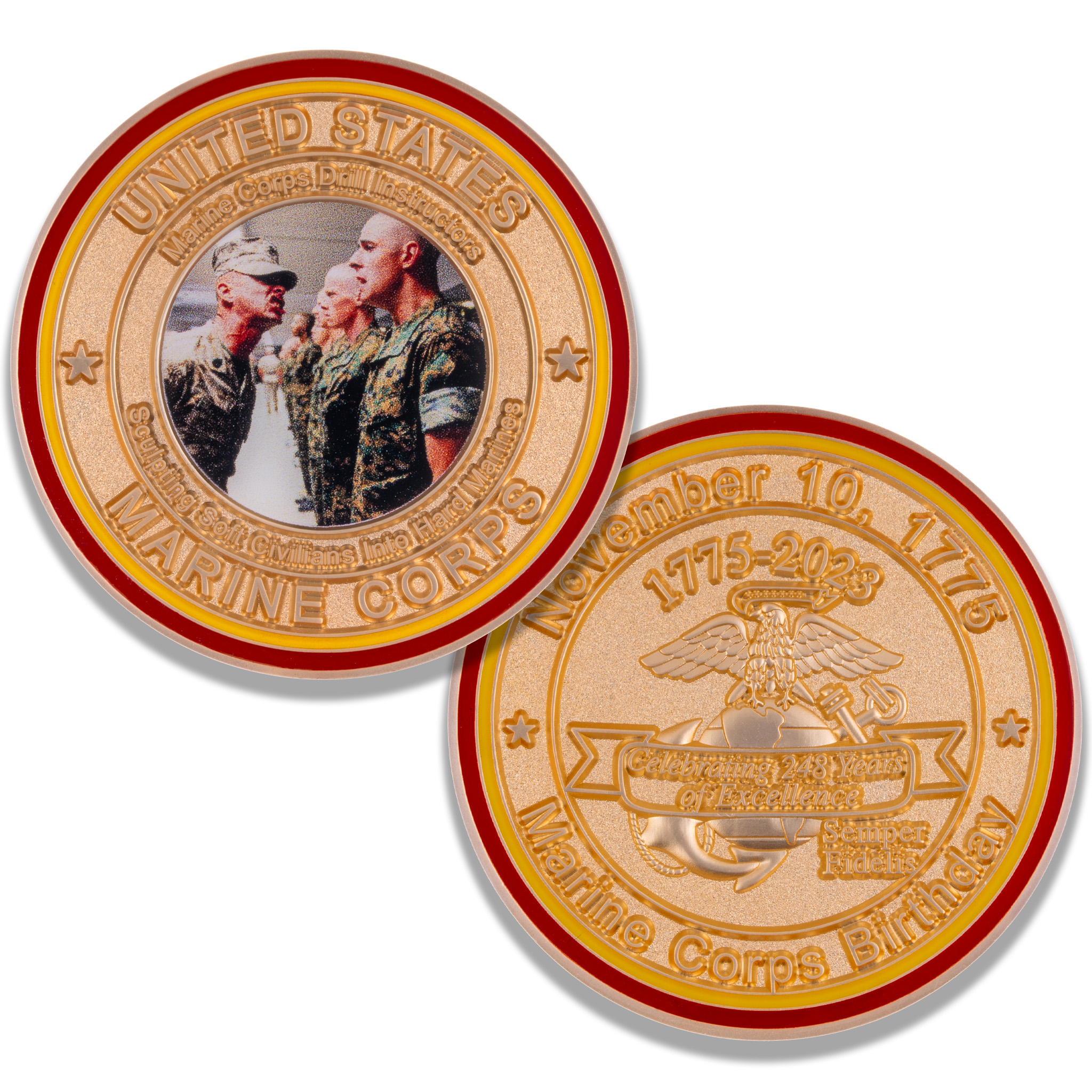The back of the coin declares, “Celebrating 248 Years of Excellence” over the Eagle, Globe and Anchor. The Marine Corps Birthday of November 10, 1775 is proudly displayed along the top. Scarlet and gold rings add a finishing touch, and the coin has a protective clear epoxy coating on both sides.