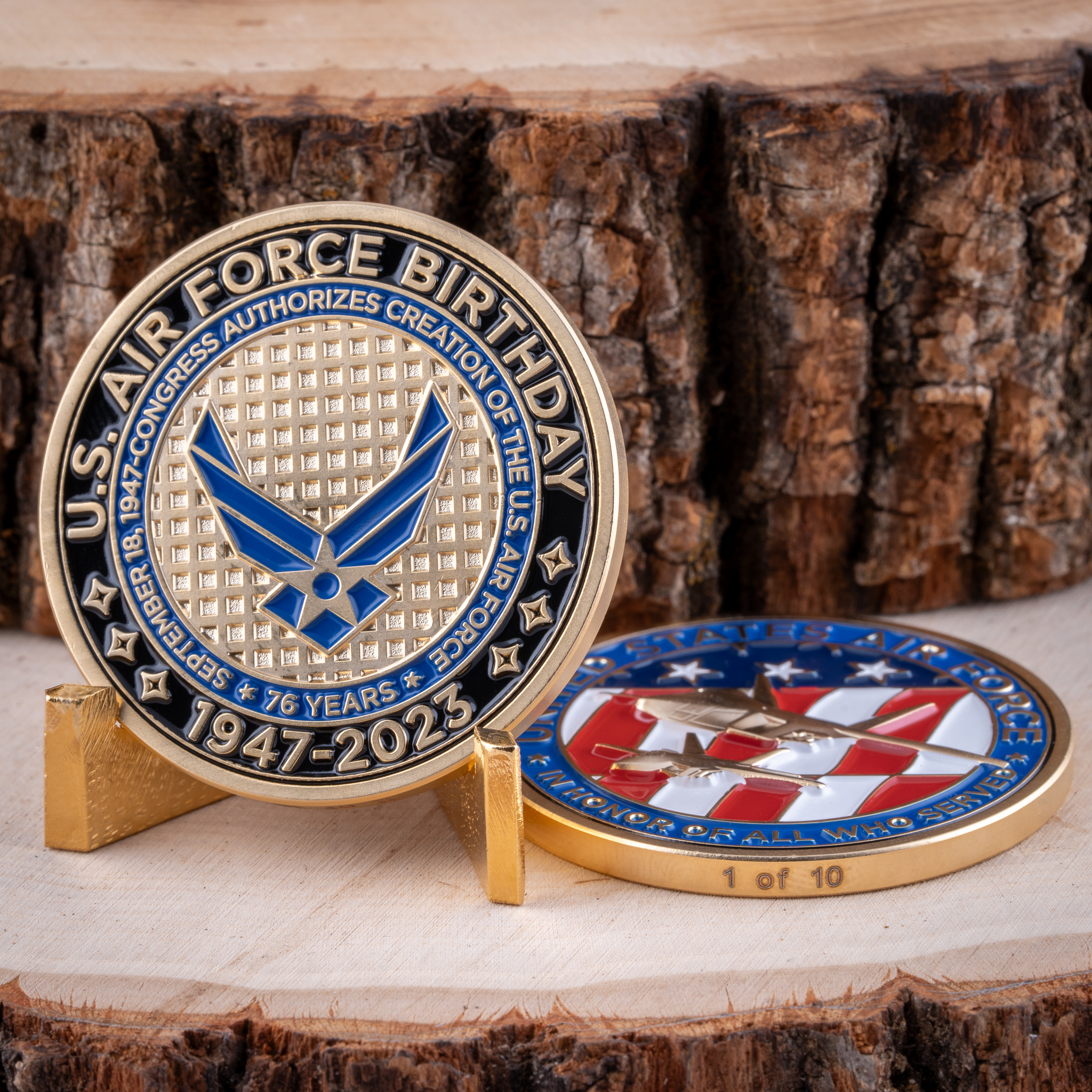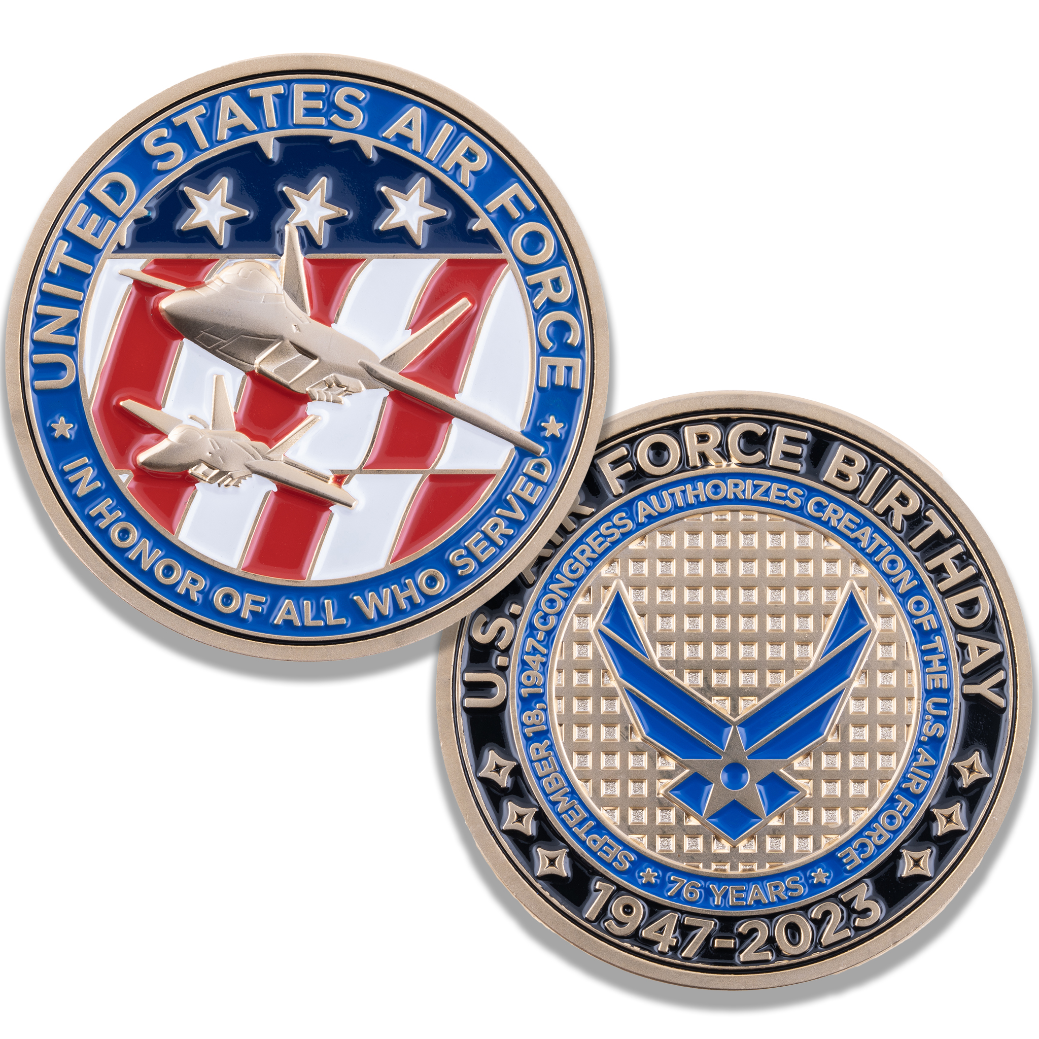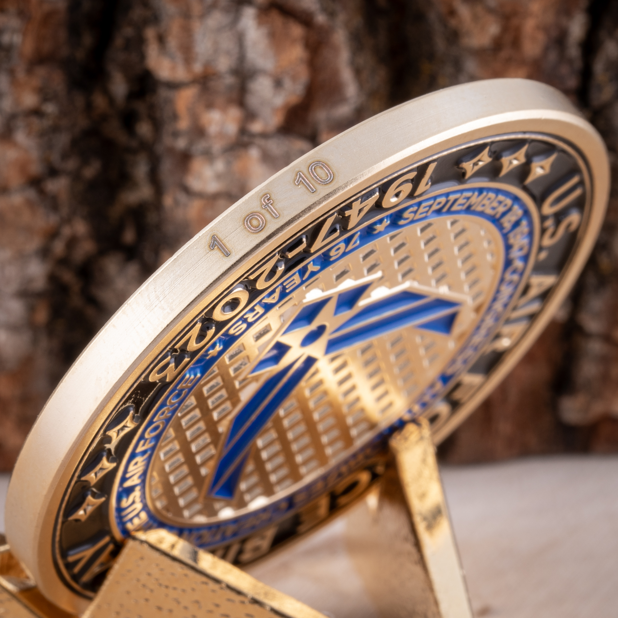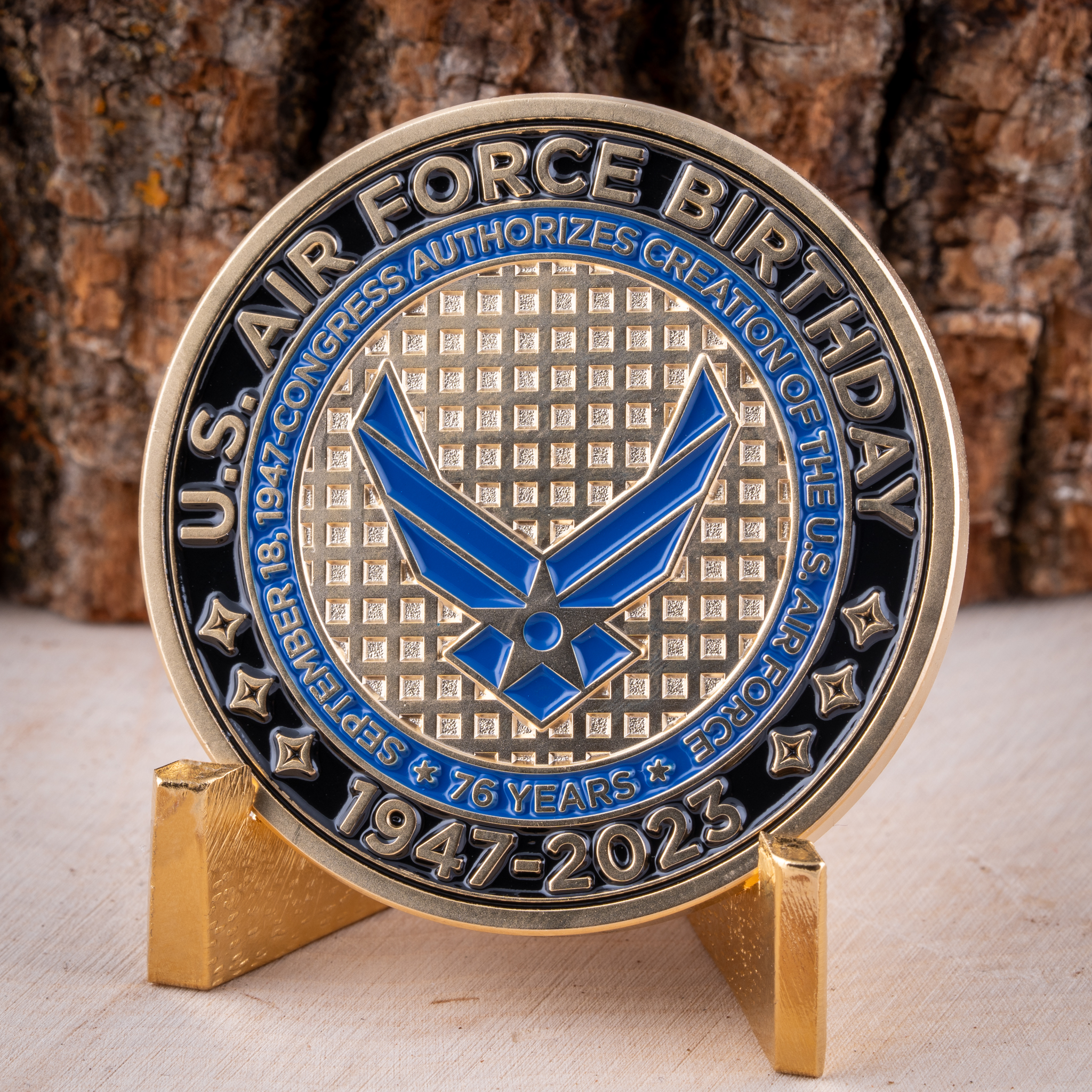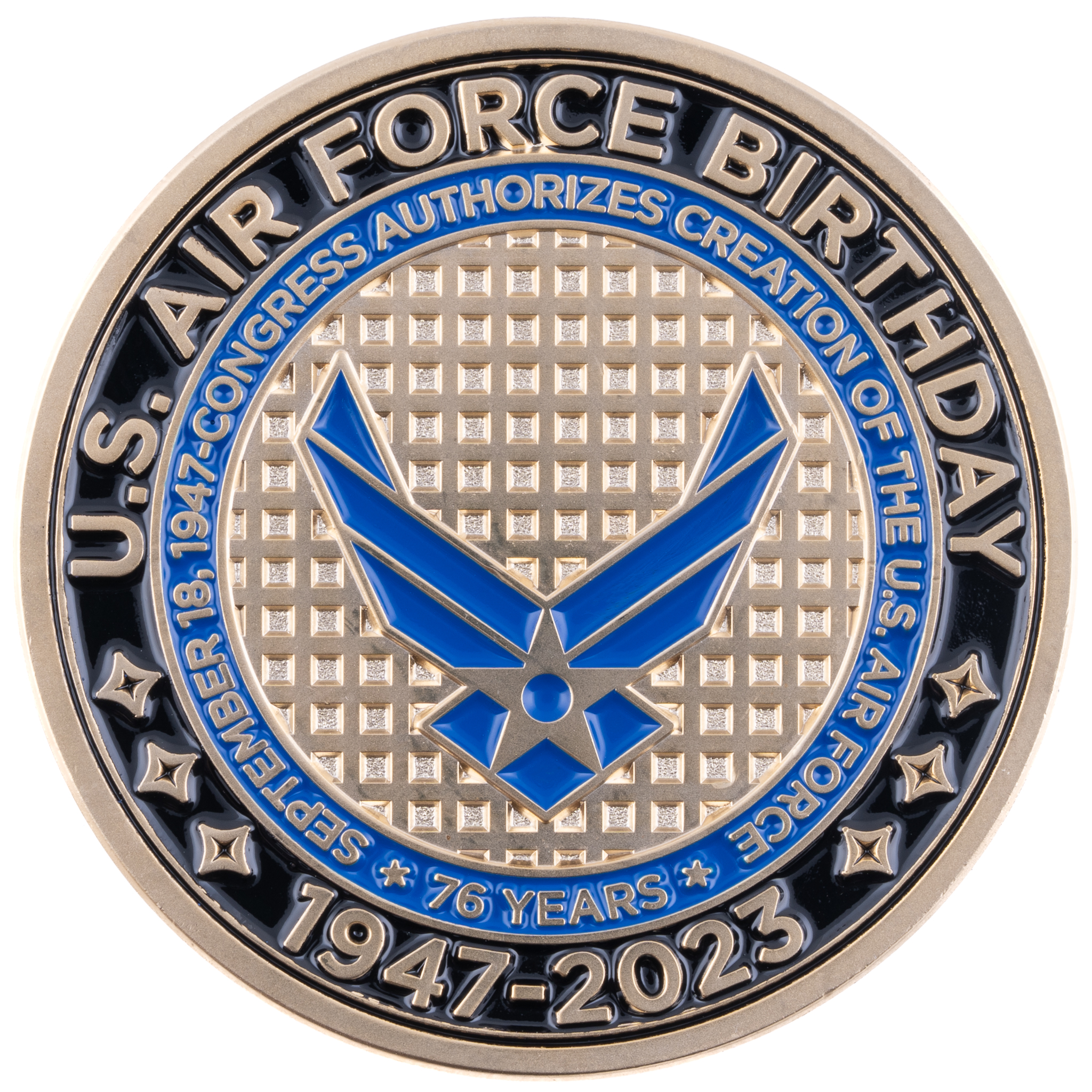On the reverse side, the Air Force insignia stands out in full color, set against an intricate 3D grid pattern in raised satin gold, adding depth and texture to the design. Encircling the insignia, the inscription “September 18, 1947 – Congress Authorizes Creation of the U.S. Air Force. 76 Years” is presented in raised antique silver, complemented by a striking blue background. The coin’s outermost ring proudly proclaims “U.S. Air Force Birthday 1947-2023”, with the words raised in satin gold and set against a deep black background, providing a stark contrast and completing the coin’s distinguished design.