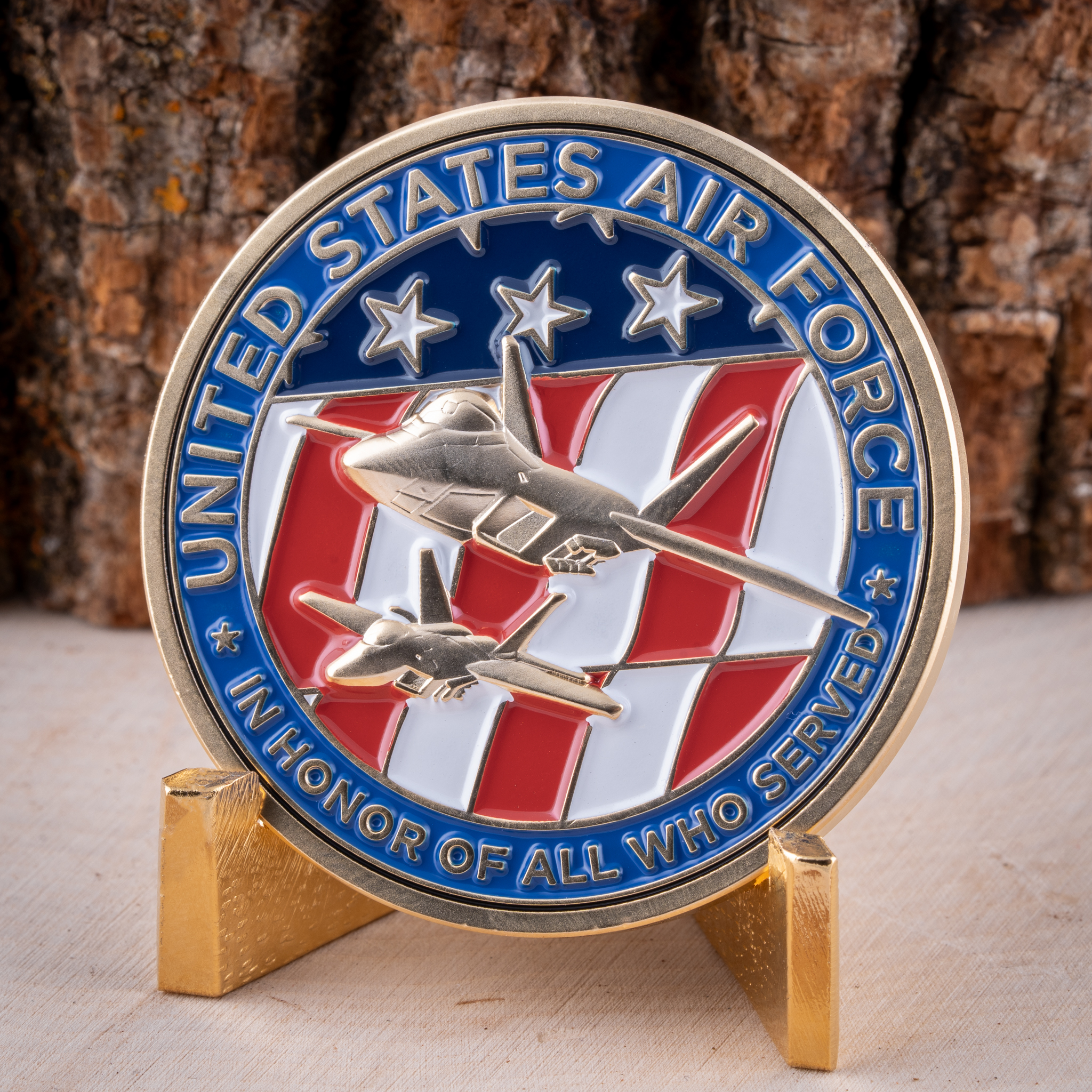 Celebrate 76 years of the United States Air Force with this exceptional Challenge Coin! Measuring at 1.75″, this coin is adorned with an satin gold finish that radiates the Air Force’s prestige. The front of the coin showcases two F-22 Raptor fighter jets, intricately detailed and poised for action. Behind these state-of-the-art aircraft, the American flag unfurls in vibrant color, symbolizing the nation’s pride and the Air Force’s commitment to its defense. Surrounding the outer ring of the coin’s front, the words “* United States Air Force * In Honor of All Who Served *” are embossed in raised satin gold, set against a backdrop of vibrant blue that enhances the coin’s visual appeal.