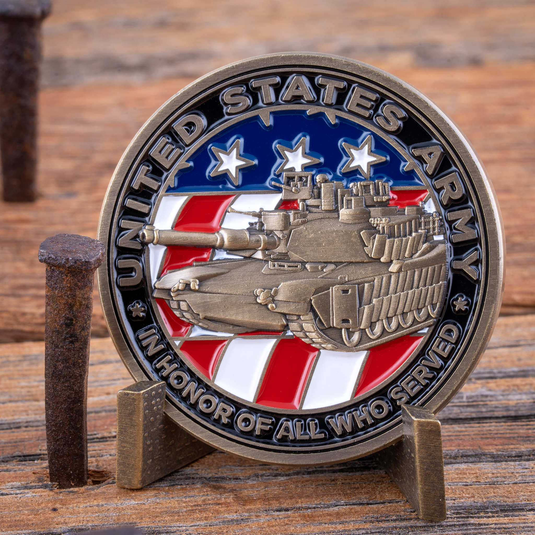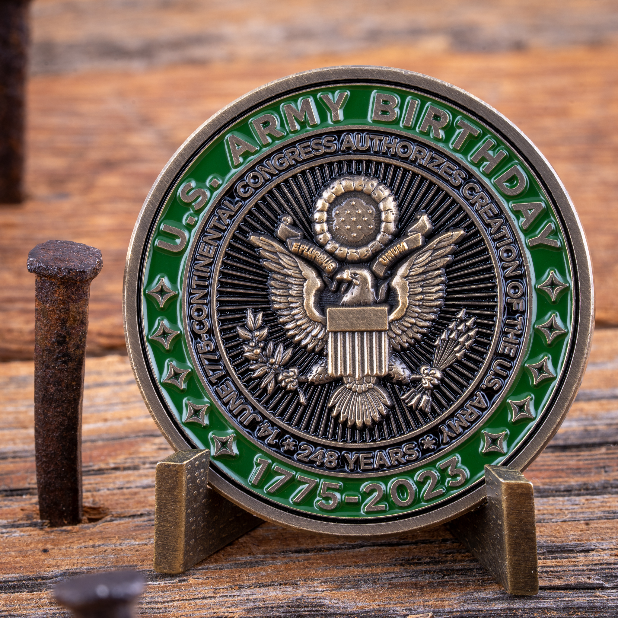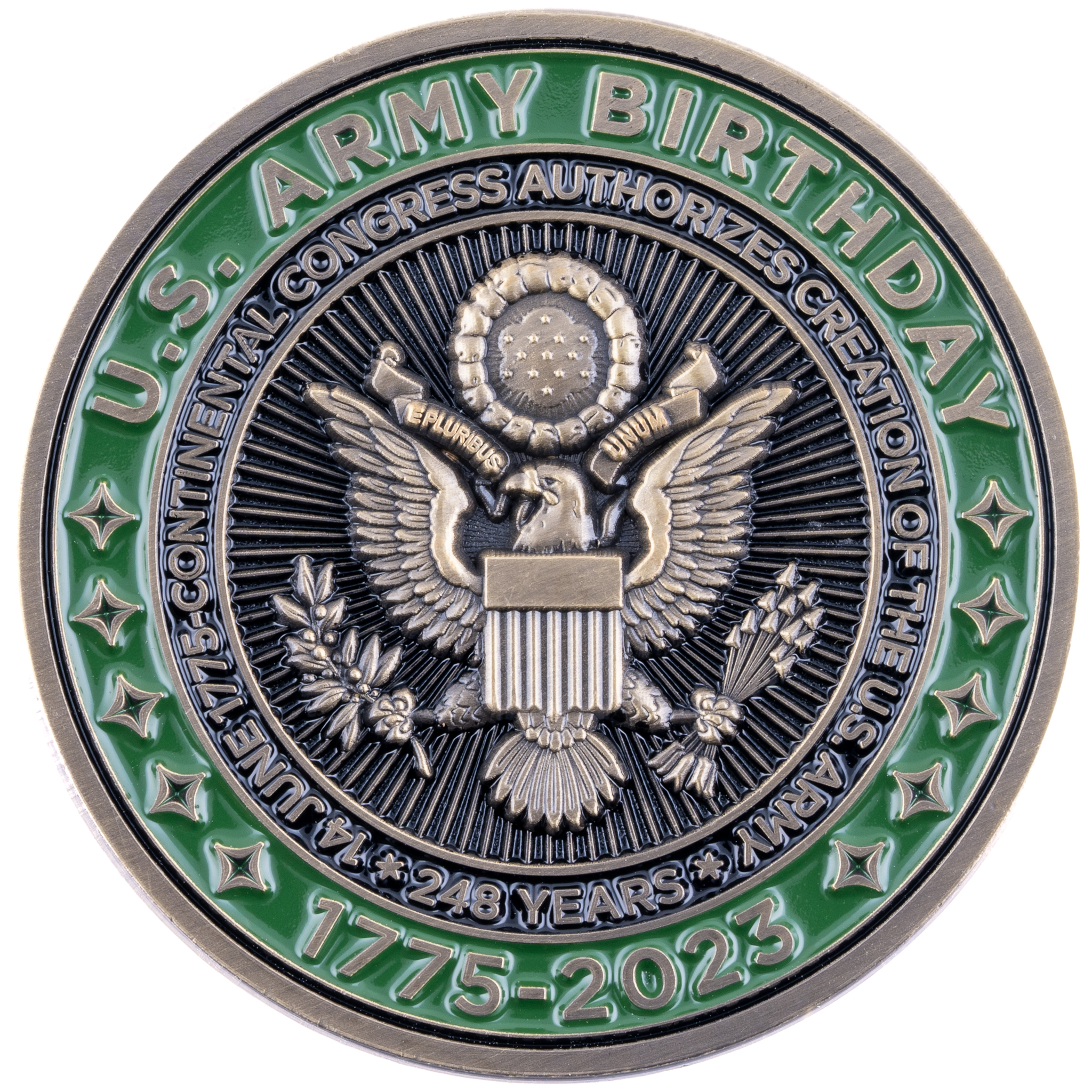Celebrate 248 years of the United States Army with this exquisite coin! This 1.75″ coin, with its antique bronze finish, stands out with a 3D relief of an M1 Army Tank on the front. Behind the tank, the American flag is displayed in vibrant color, symbolizing the nation’s pride and history. The words “United States Army In Honor of All Who Served” are embossed in raised antique brass letters, set against a striking black paint fill background, encircling the outer ring of the coin’s front. The reverse side of the coin showcases the iconic army seal in antique brass, contrasted against a deep black background. Encircling the seal, the inscription reads “14 June 1775 – Continental Congress Authorizes Creation of the U.S. Army * 248 Years *”. The outermost ring of the coin proudly proclaims “U.S. Army Birthday 1775-2023”, marking another year of dedication, service, and honor.