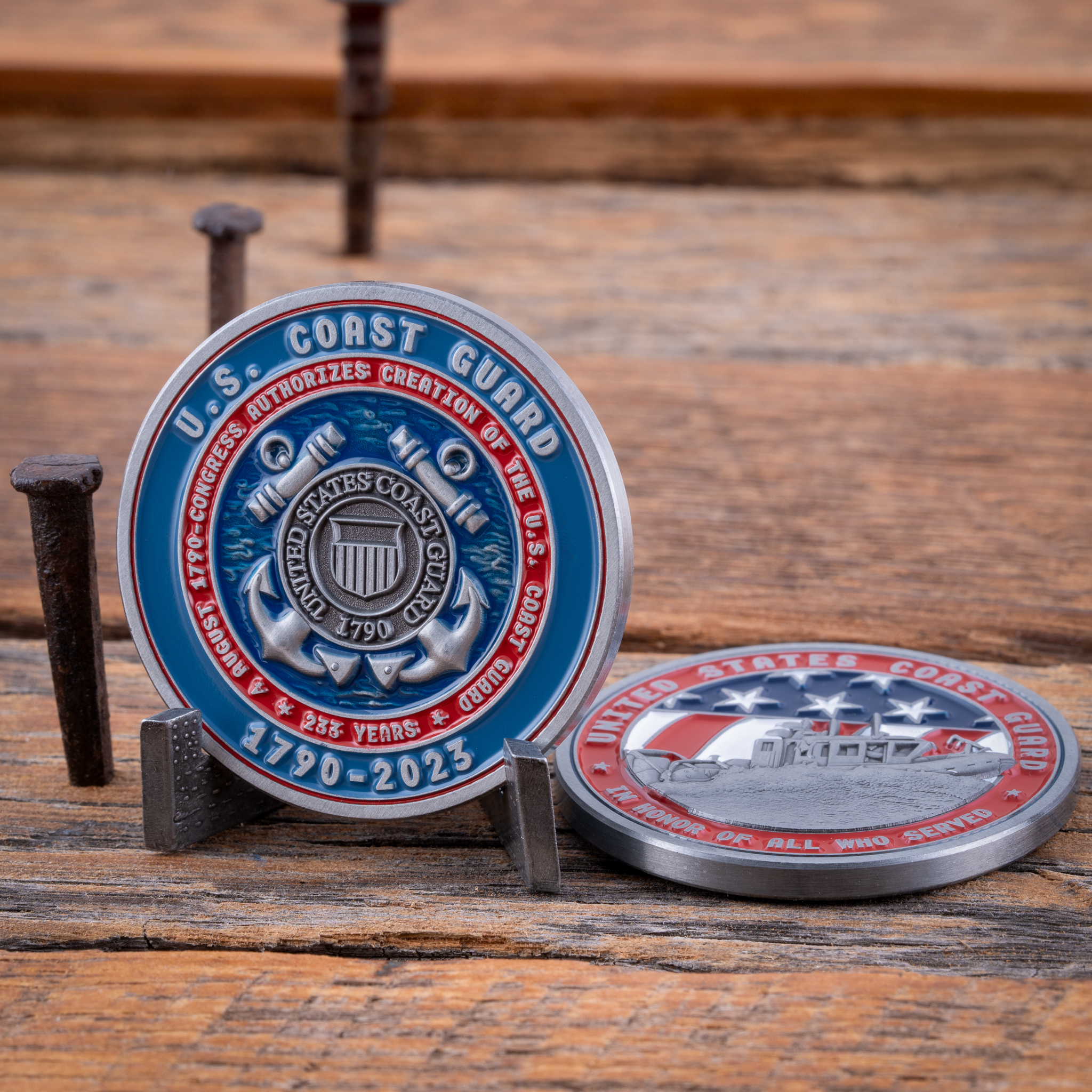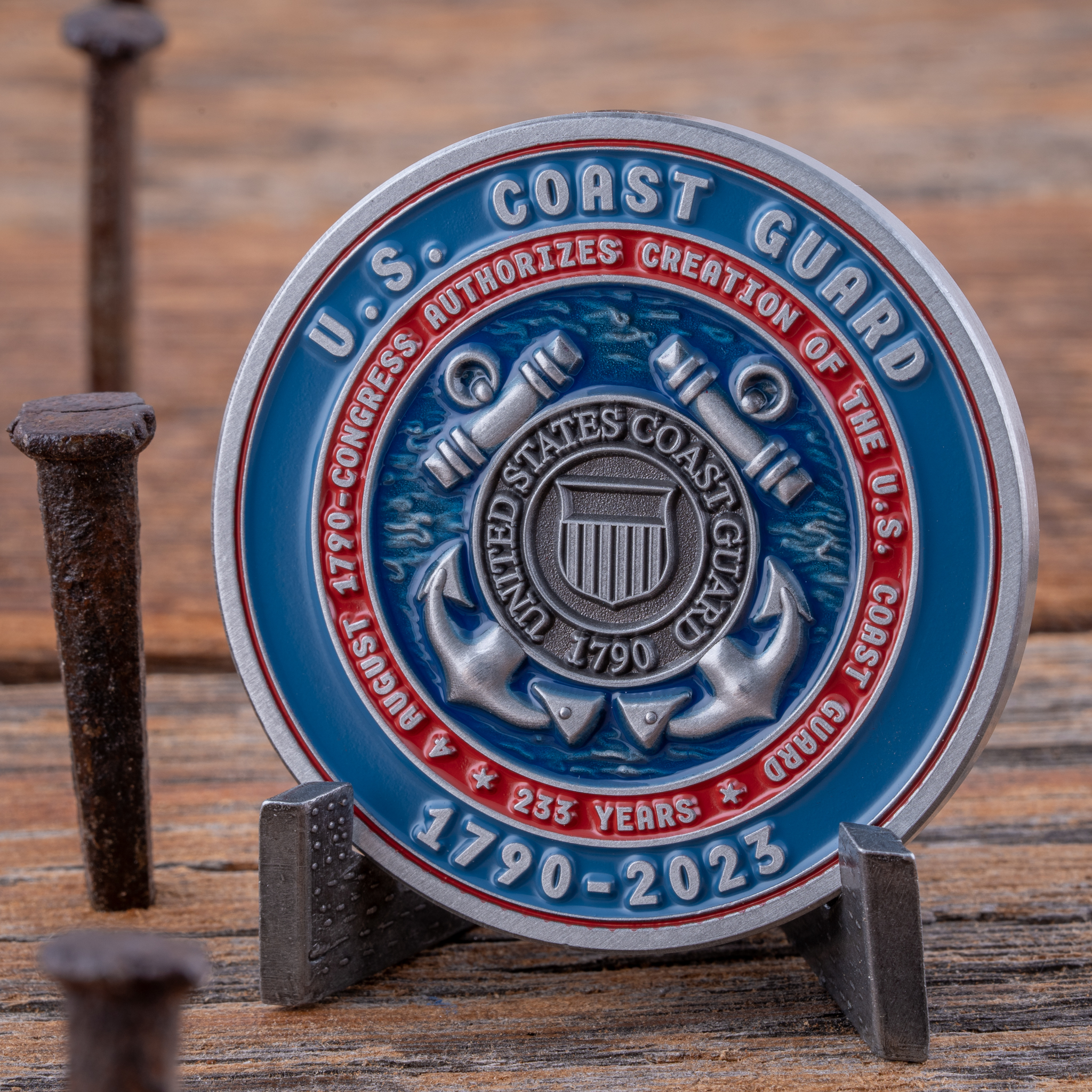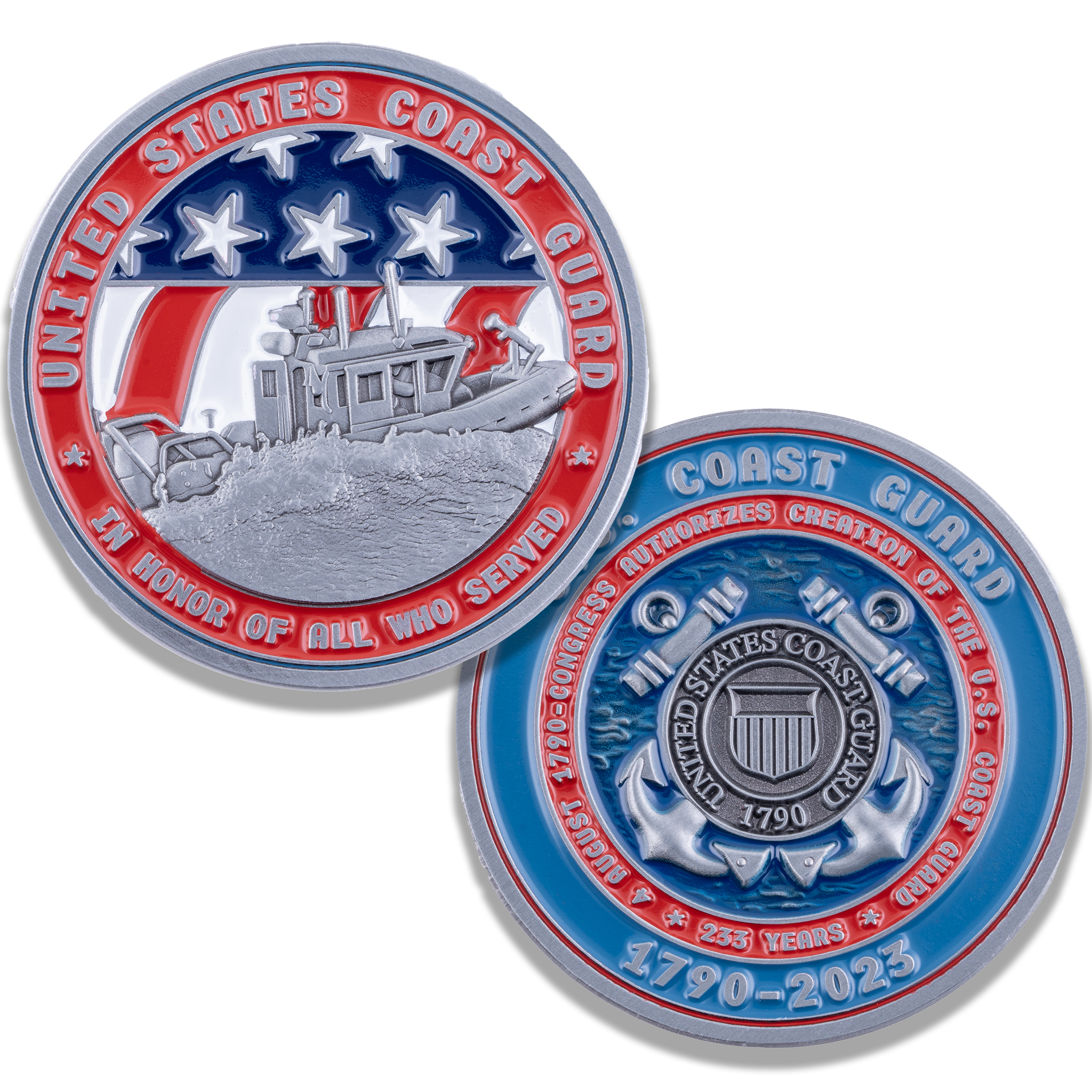 Turning to the reverse side, the Coast Guard seal stands proudly in raised antique silver. This emblem is set against a backdrop of ocean waves, depicted in 3D relief and covered with a translucent blue paint fill, evoking the vastness and depth of the seas the Coast Guard patrols. Surrounding the seal, the inscription “4 August 1790 – Congress Authorizes Creation of the U.S. Coast Guard * 233 Years*” is presented in raised antique silver, complemented by a striking red background. The coin’s outermost ring proudly states “U.S. Coast Guard 1790-2023”, with the words raised in antique silver and set against a deep blue background.