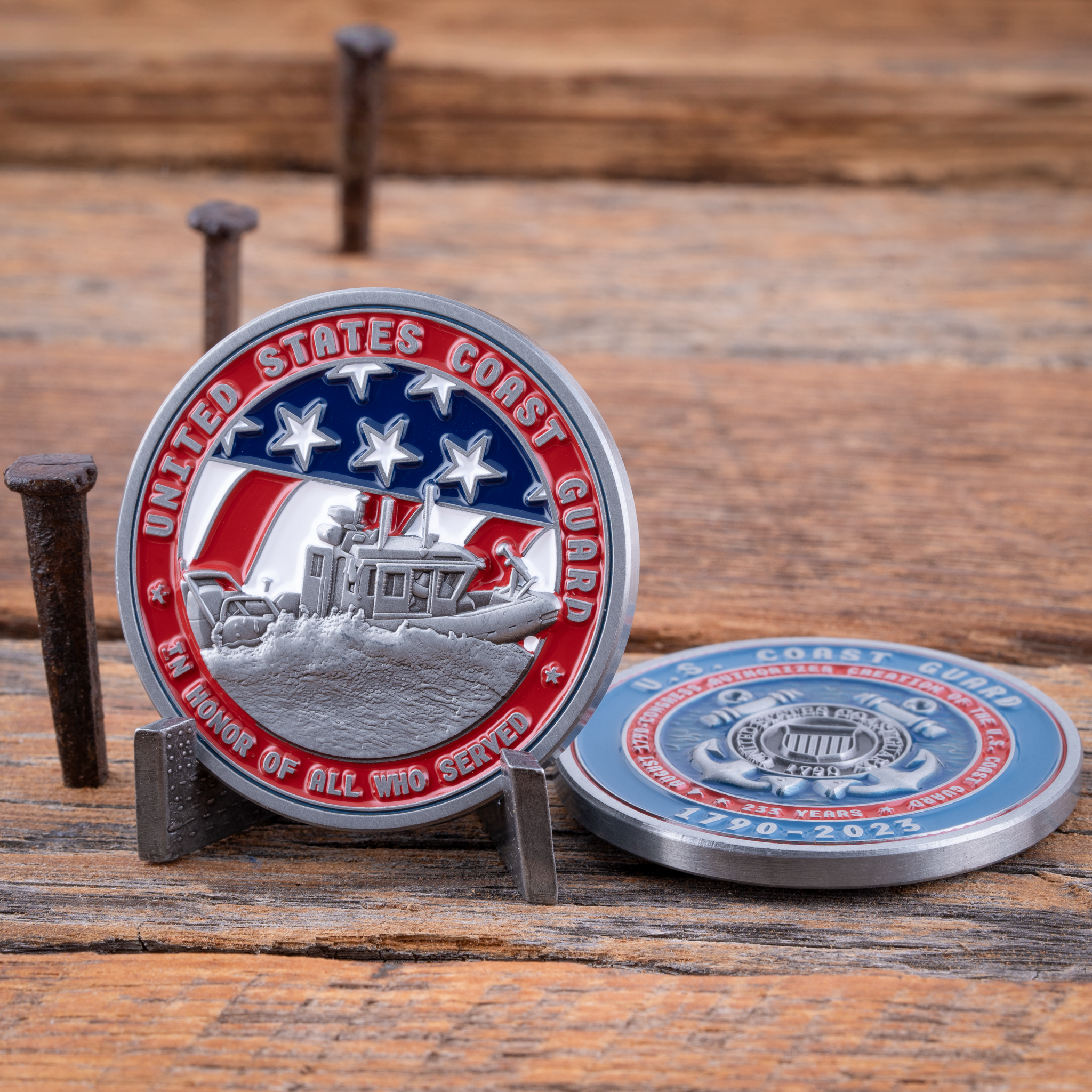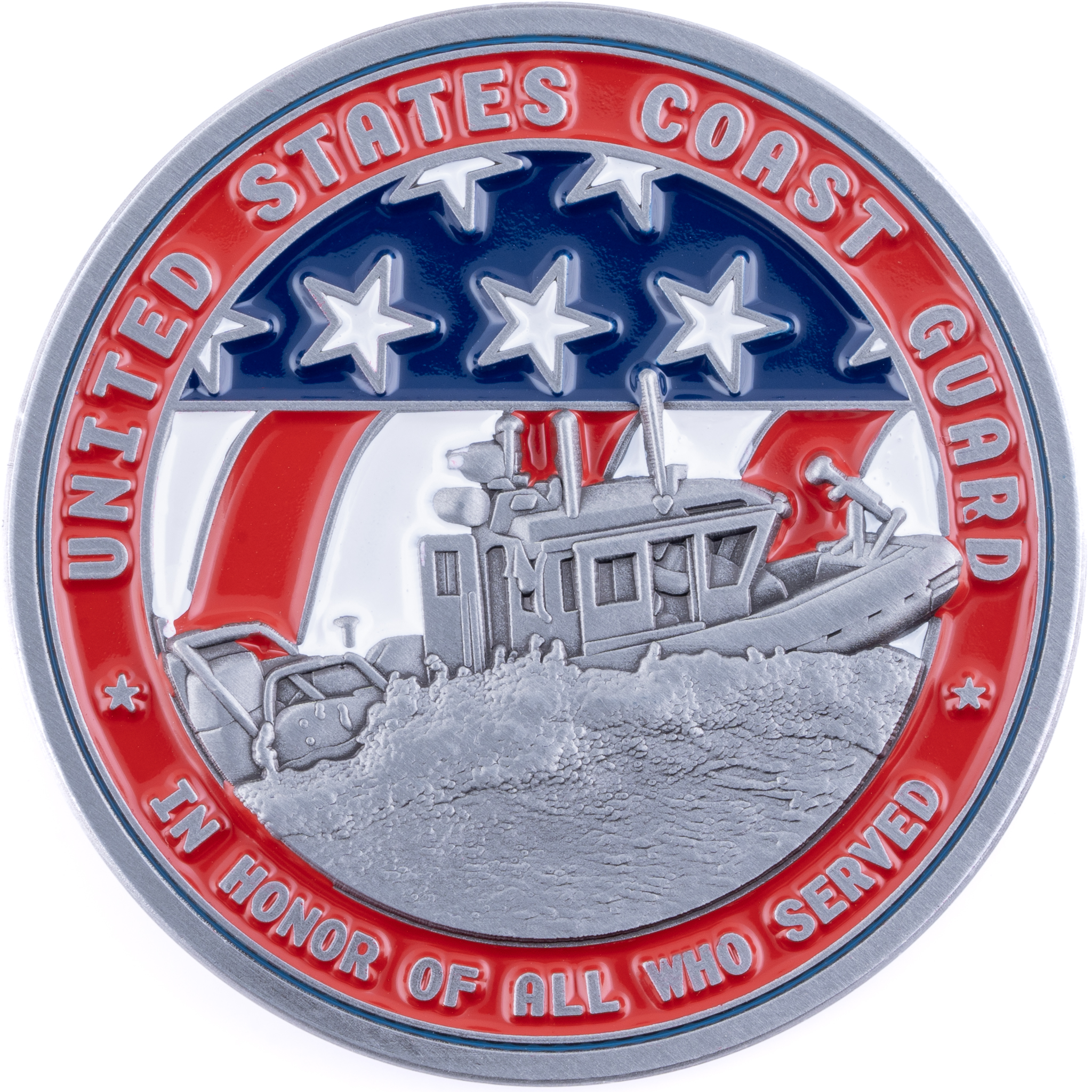 Celebrate 233 years of the United States Coast Guard with this magnificent Challenge Coin! Measuring at 1.75″, this coin boasts an antique silver finish. The front of the coin presents a detailed 3D relief of a Coast Guard ship, bravely navigating tumultuous seas. Behind this powerful image, the American flag waves in vibrant color, echoing the spirit of the nation. Encircling the outer ring of the coin’s front, the words “* United States Coast Guard * In Honor of All Who Served” are embossed, set against a vivid red background that enhances the coin’s visual appeal.