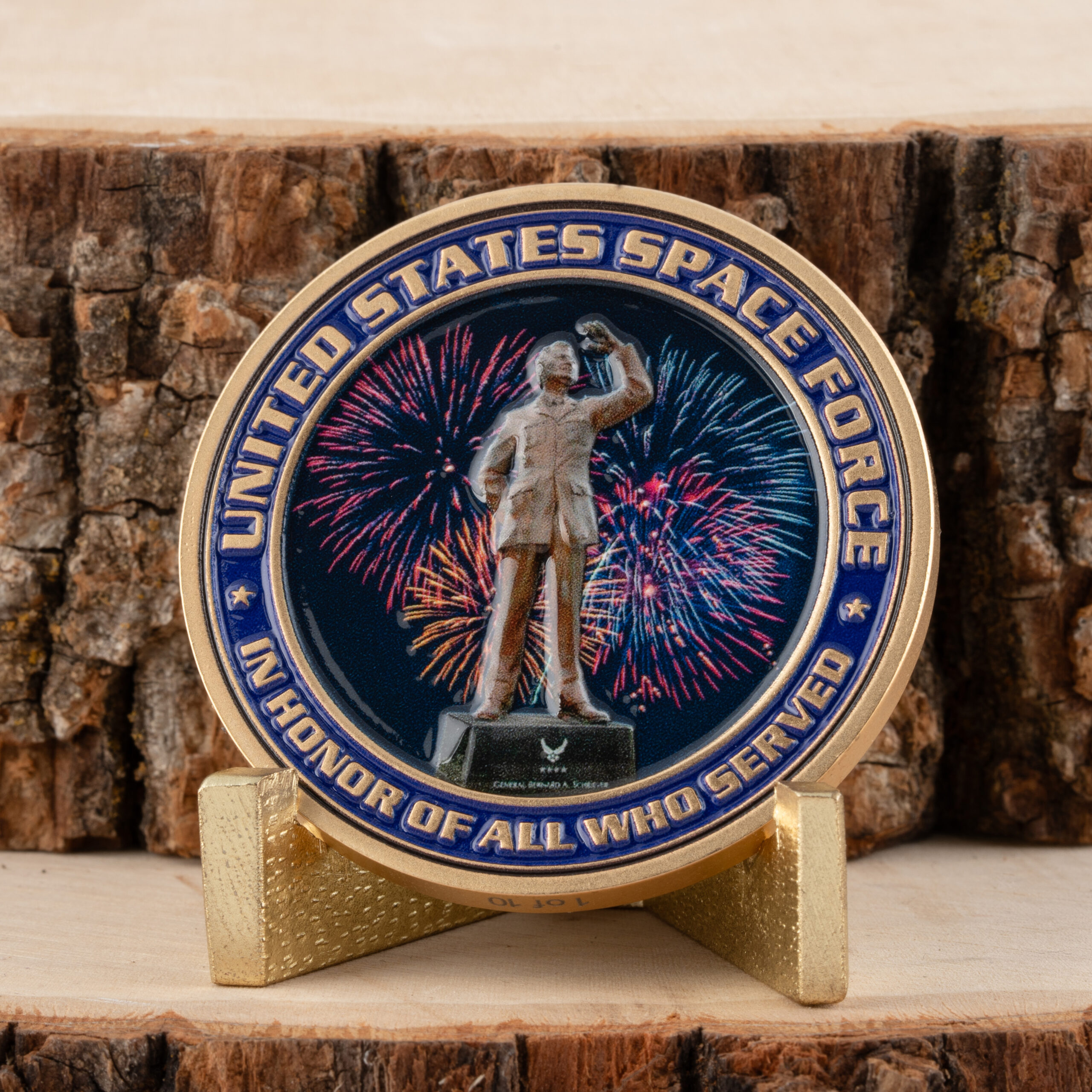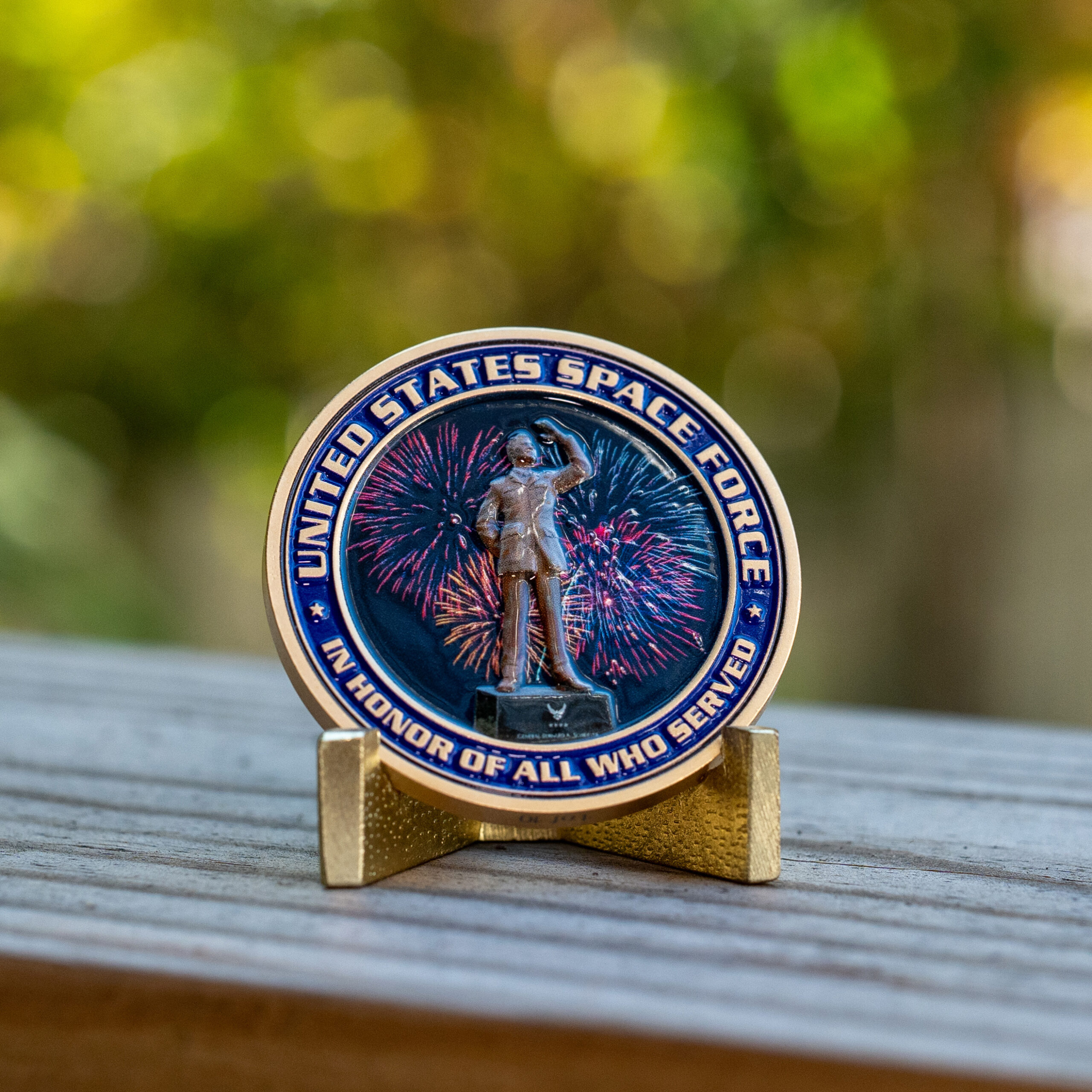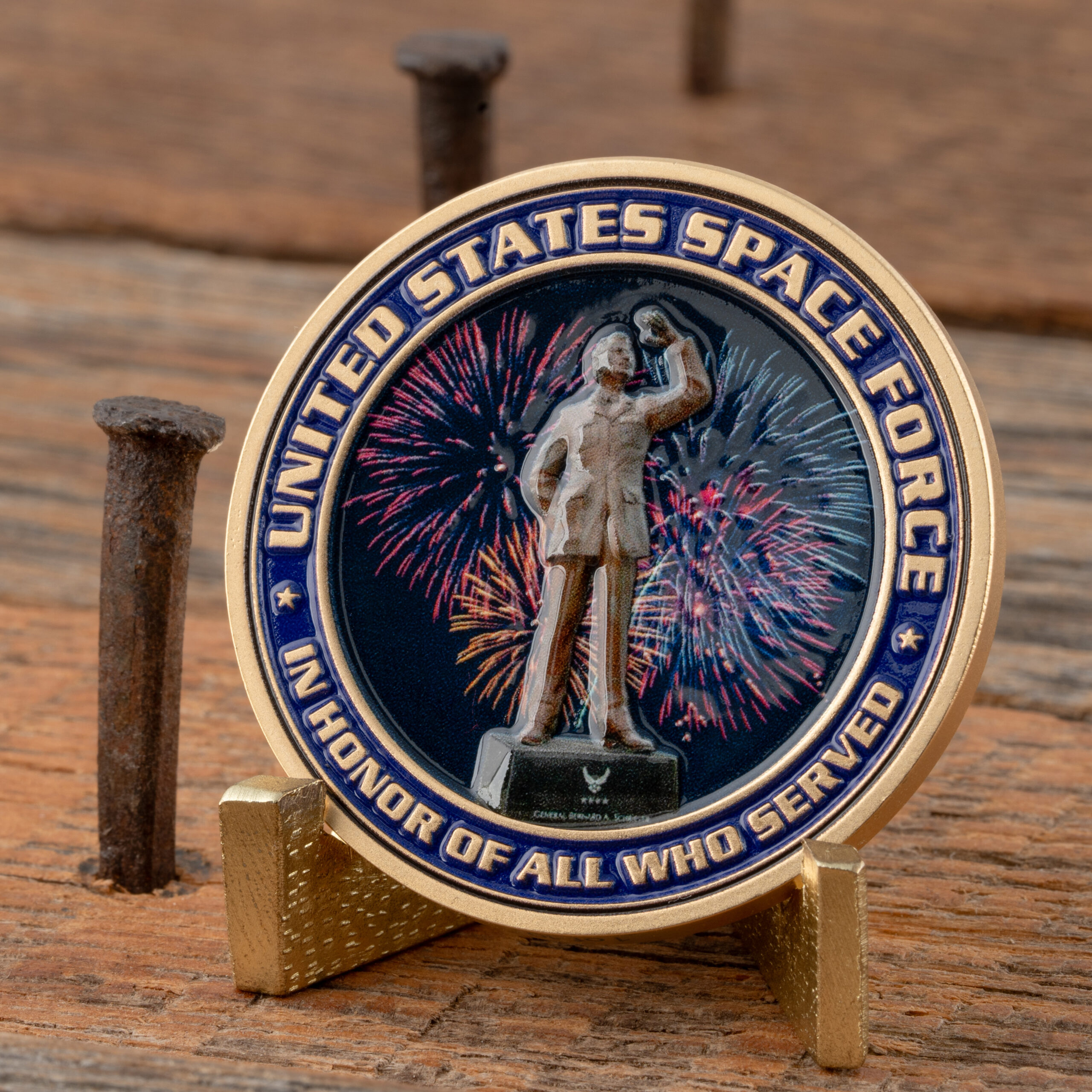 On the reverse, a fireworks display lights up behind the statue of General Bernard Schriever, framed by the words "United States Space Force" and "In Honor of All Who Served", saluting the commitment of Space Force personnel.