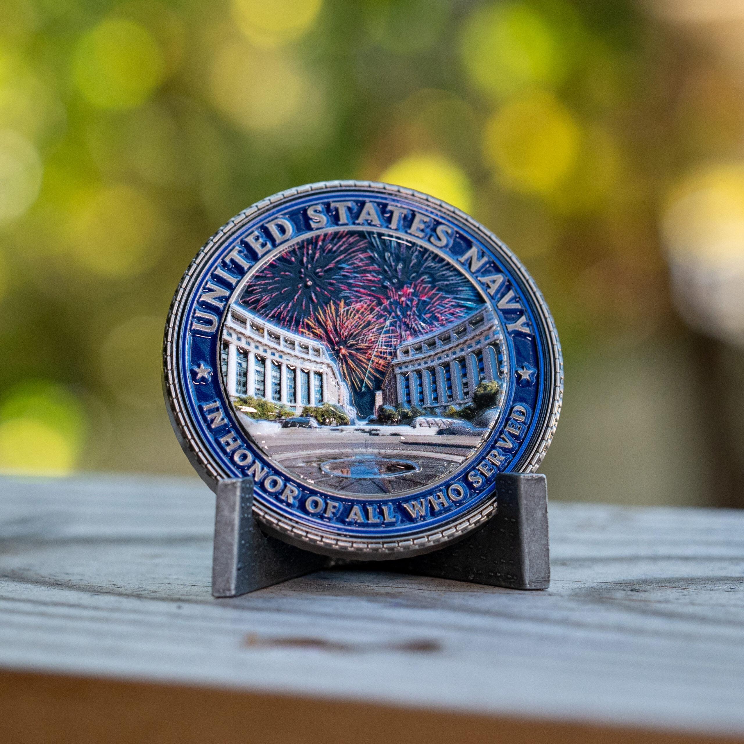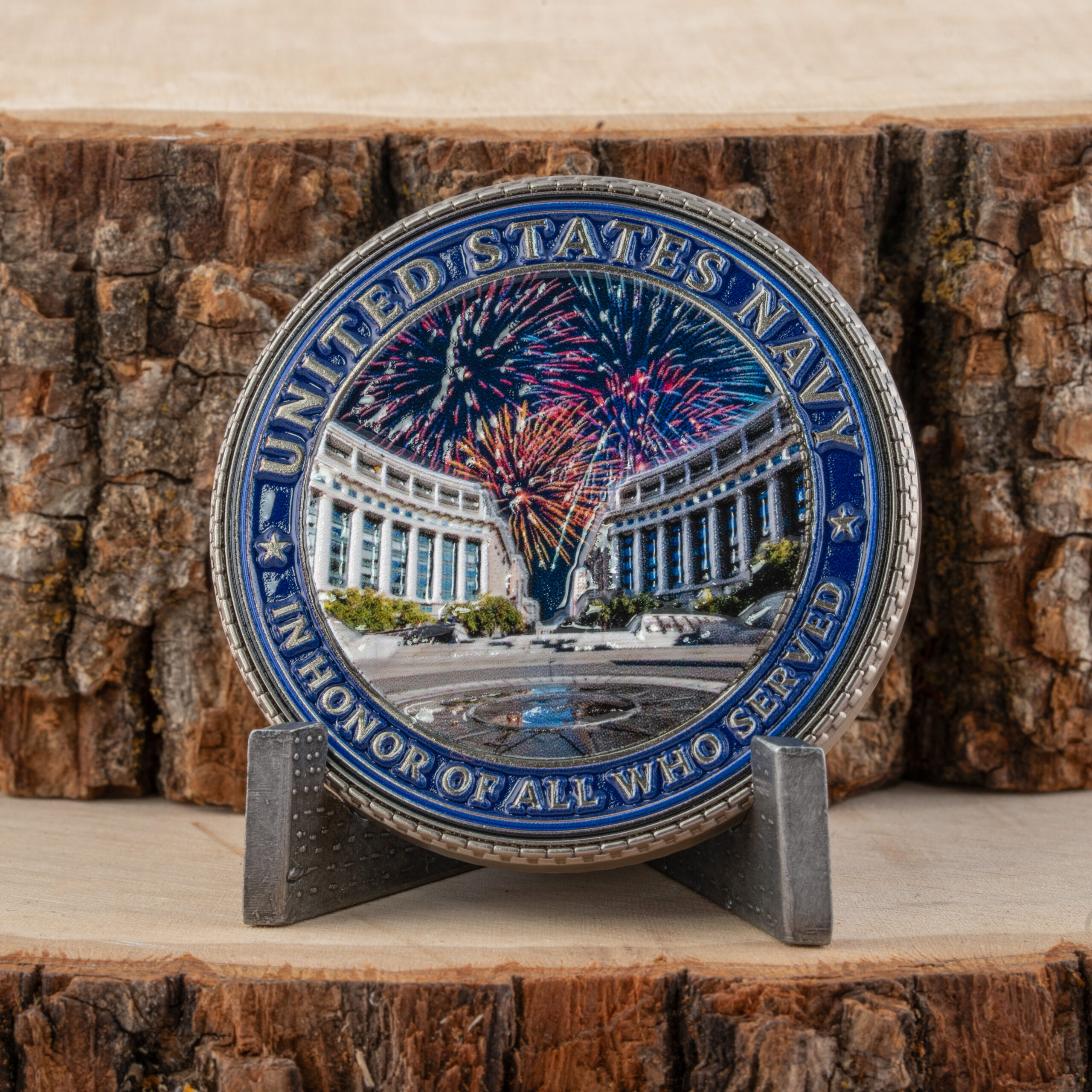The reverse side showcases a vibrant fireworks display over the Navy Memorial, encircled by “United States Navy” and “In Honor of All Who Served”. This design honors the sacrifices and commitment of Navy personnel past and present.