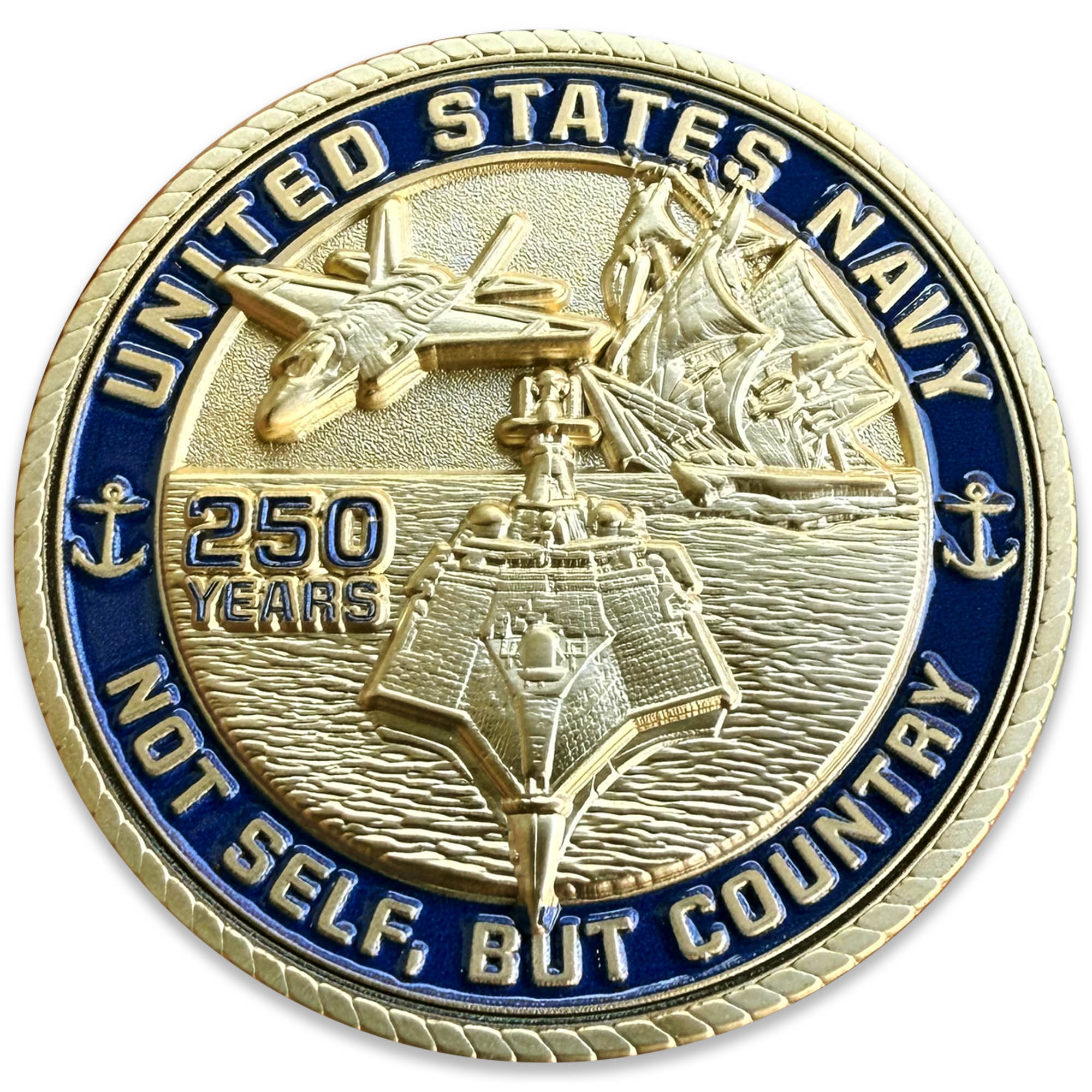On the reverse, a modern ship with a sailing ship behind it, framed by the words “United States Navy” and “Not Self, But Country”. This design commemorates the sacrifices and dedication of Navy personnel throughout history.