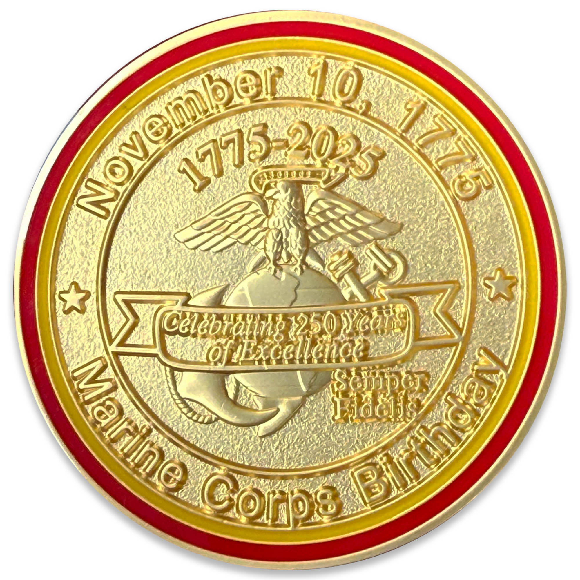 This coin limited to only 10 produced! It’s a 1.75″ limited edition 2025 Marine Birthday challenge coin showcases a striking satin gold finish, embodying the timeless spirit of the Marine Corps. The coin’s front features a vivid picture insert of the first U.S. Marine Captain Samuel Nicholas, symbolizing where 250 years of tradition began.