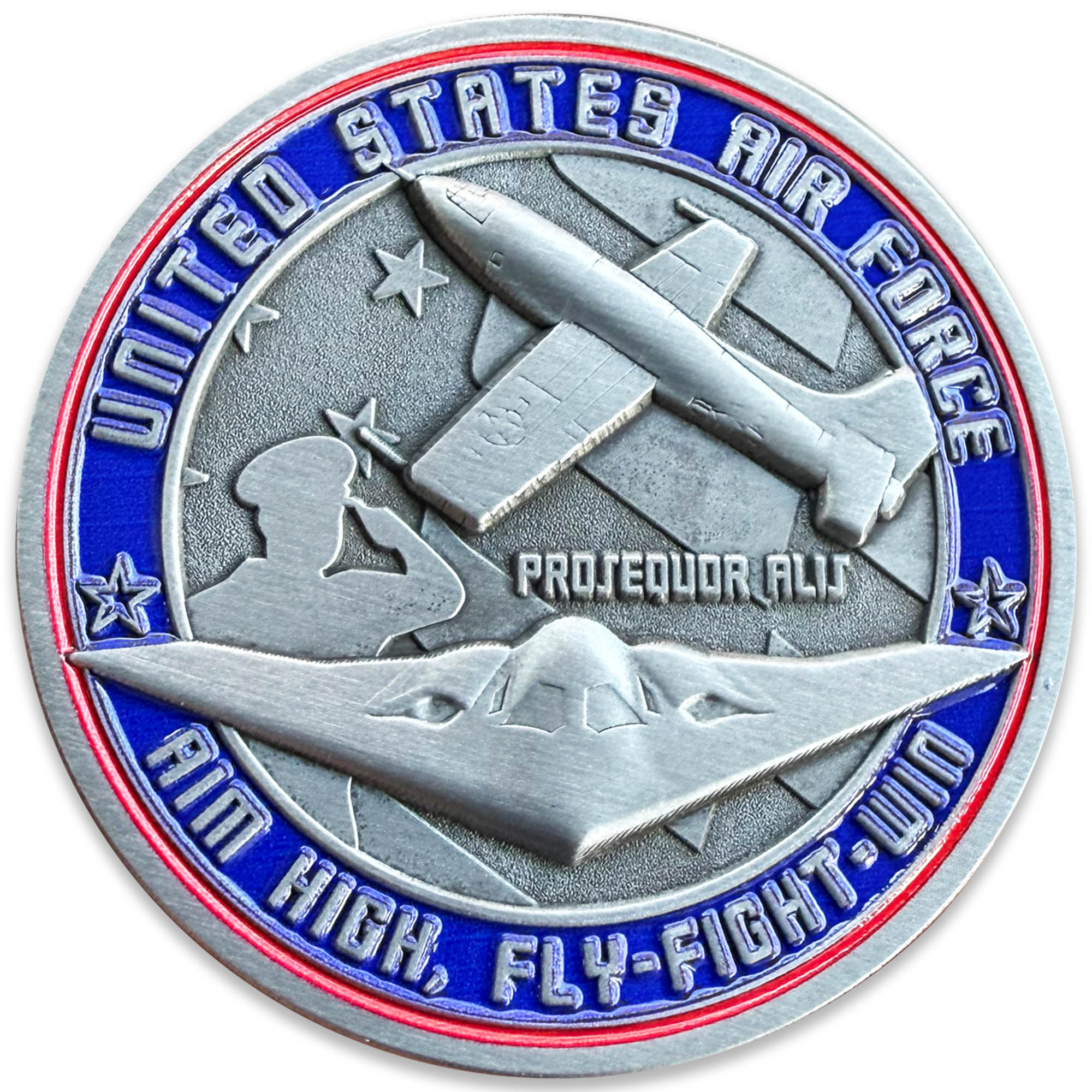 The reverse side features the new bomber and unmanned air craft, framed by the words “United States Air Force” and “Aim HIgh, Fly-Fight-Win”-a tribute to the courage and commitment of every Airman.