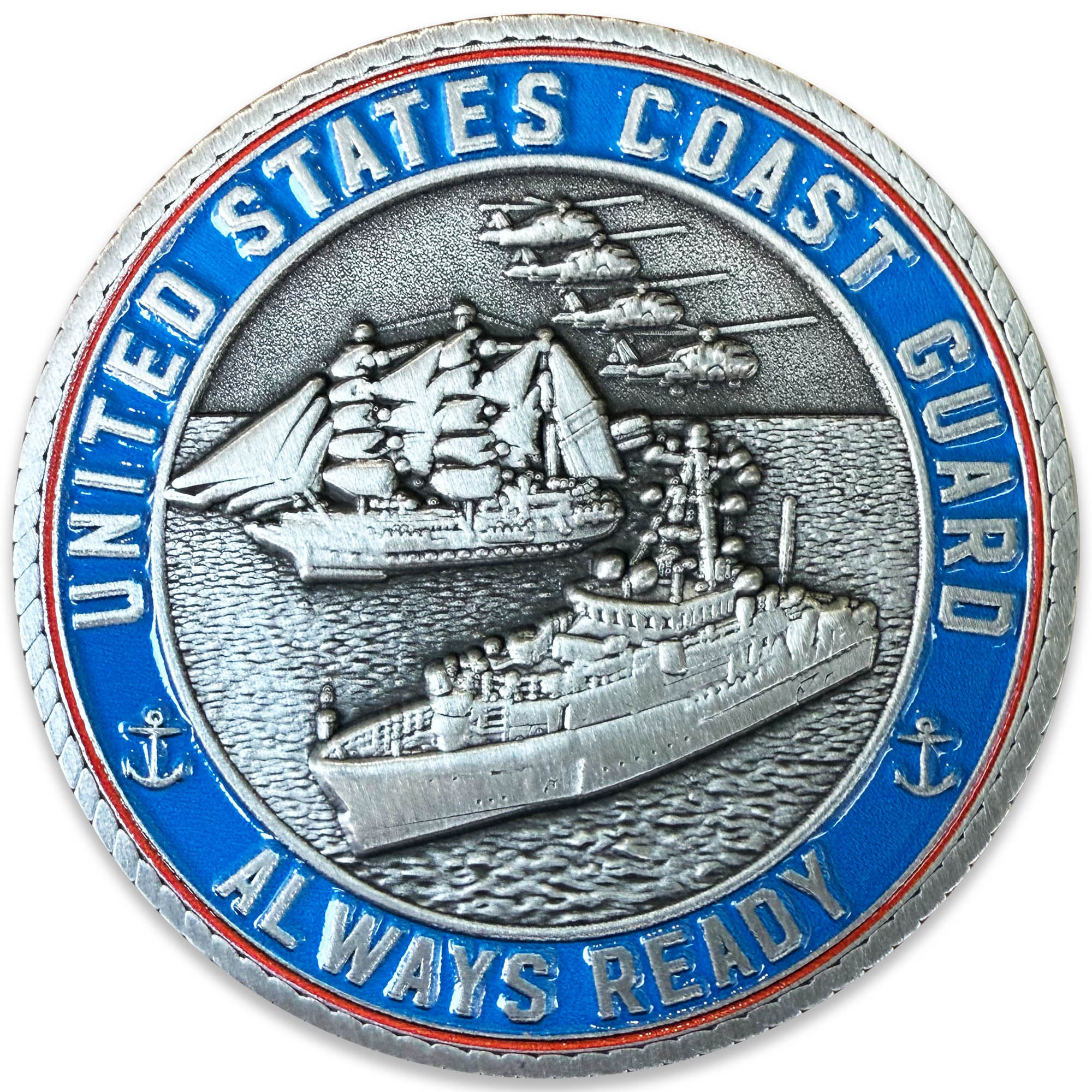 The reverse side showcases a squad of helicopters with old and new ships, framed by the words “United States Coast Guard” and “Always Ready”. This vibrant scene pays homage to the sacrifices and dedication of Coast Guard members past and present.