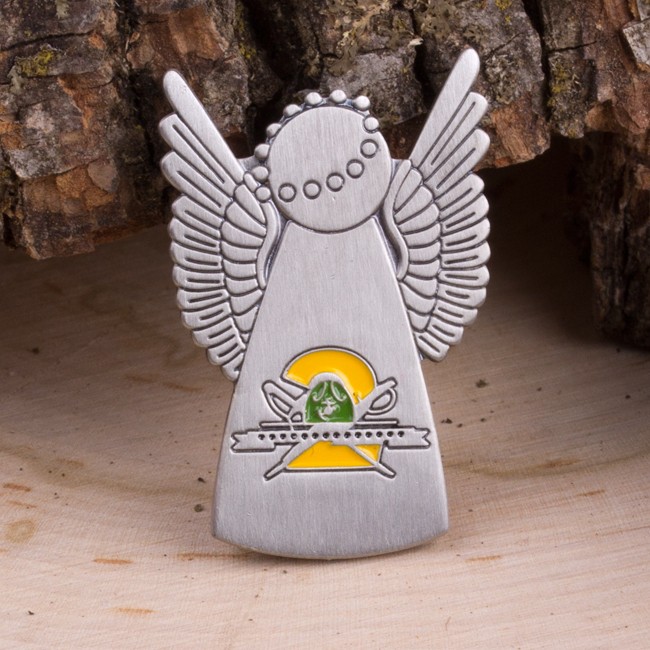 This 1.25″ tall antique silver lapel pin is in the shape of an angel, and features the crest of the 2nd Recruit Training Battalion for MCRD Parris Island and MCRD San Diego. It comes complete with a butterfly clutch backing.