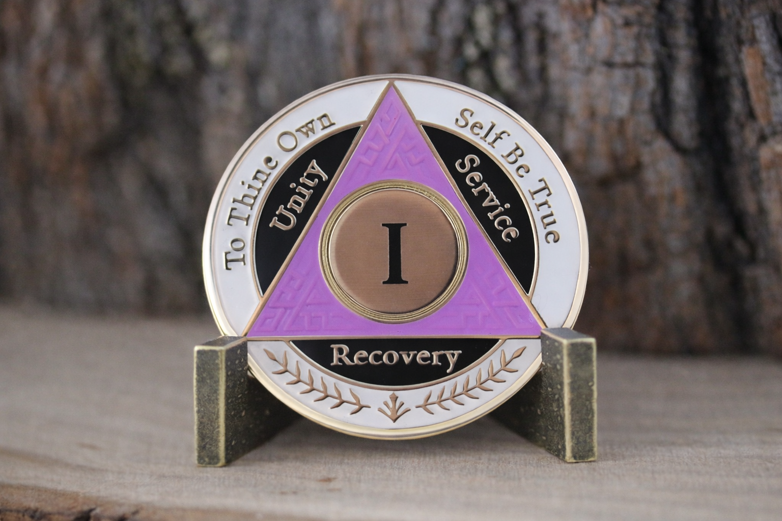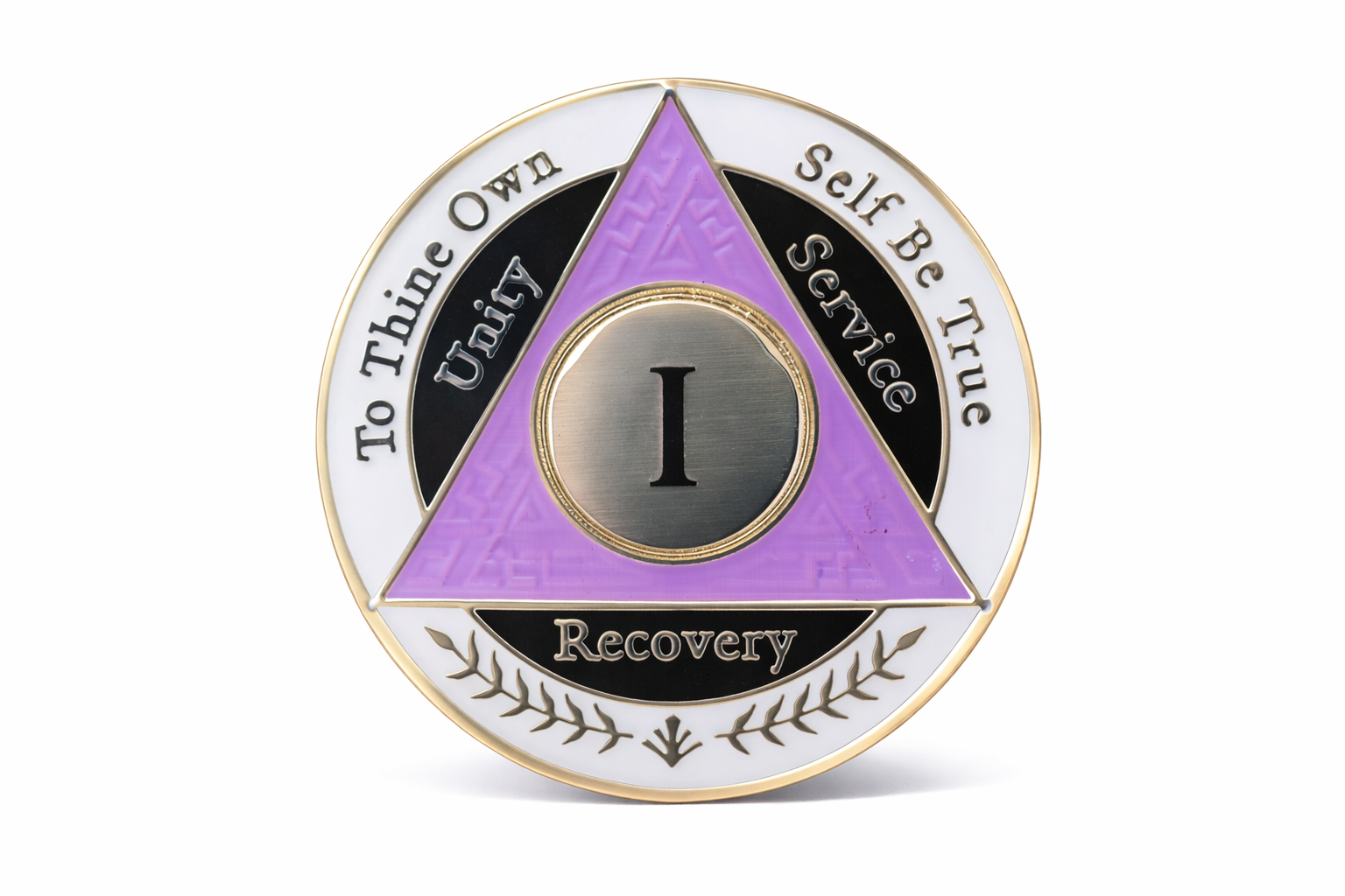 Celebrate your one-year milestone of sobriety with this striking AA coin featuring an elegant purple, white, and black color scheme. This commemorative token serves as a meaningful symbol of your dedication to recovery and personal growth. The coin's distinctive tri-color design makes it easy to distinguish among other milestone markers in your collection. Perfect for carrying as a daily reminder of your journey or displaying alongside other recovery mementos. The durable construction ensures this meaningful token will last as you continue moving forward on your path. A thoughtful gift for someone marking their first year or a personal keepsake to honor your own achievement. This coin represents not just time passed, but strength gained and wisdom earned through 365 days of commitment.