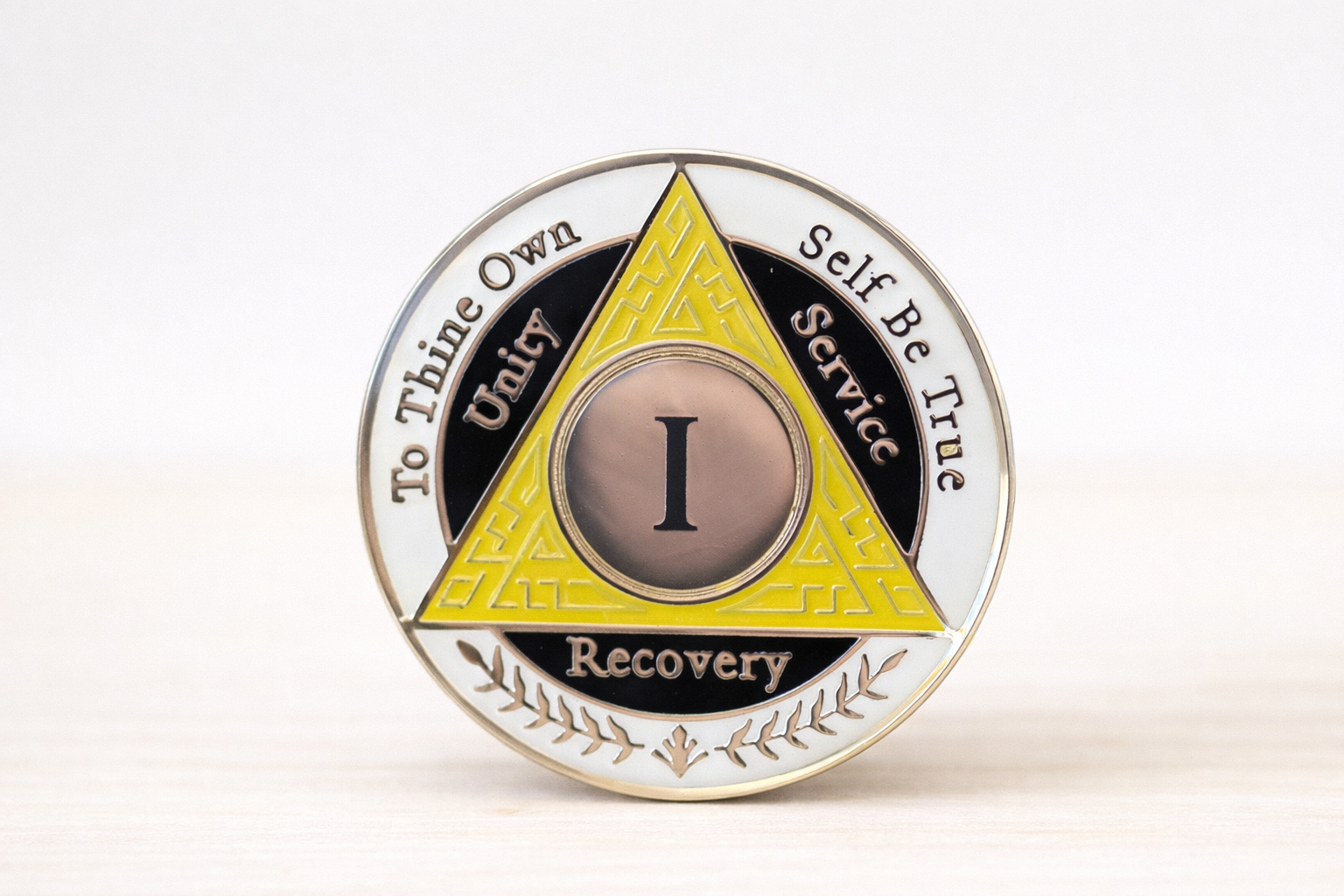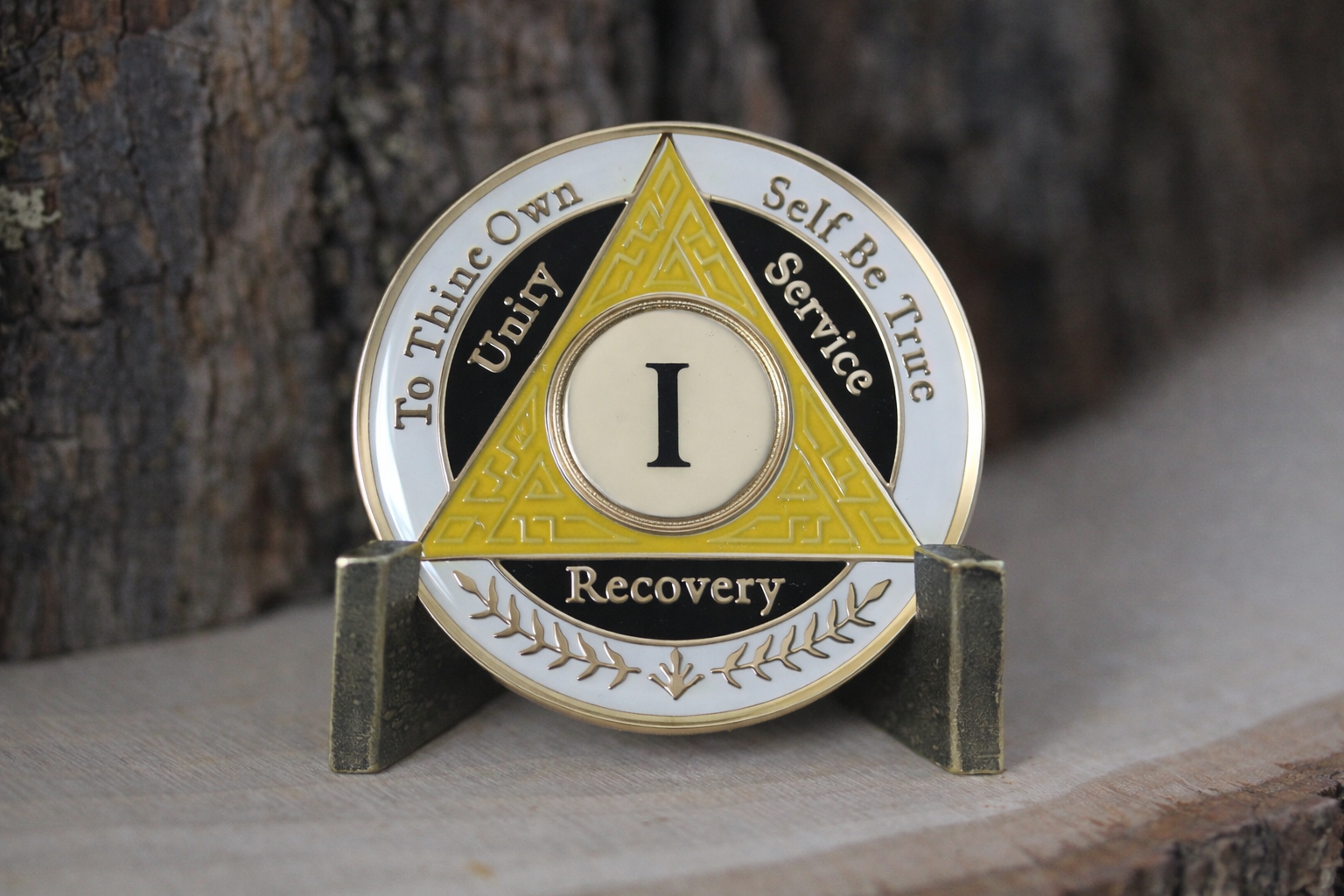 Celebrate a decade of sobriety with this meaningful 1-year AA recovery coin featuring a striking yellow, white, and black color scheme. This commemorative medallion serves as a powerful symbol of dedication and perseverance on the journey to recovery. The tri-color design makes this coin both visually appealing and deeply significant, perfect for marking this important milestone. Each coin is crafted with attention to detail, making it a cherished keepsake for both the recipient and those who support them. The coin's size makes it convenient to carry as a daily reminder of commitment and strength. Whether displayed proudly or kept close as a personal touchstone, this AA coin represents 1 year of transformation and hope.