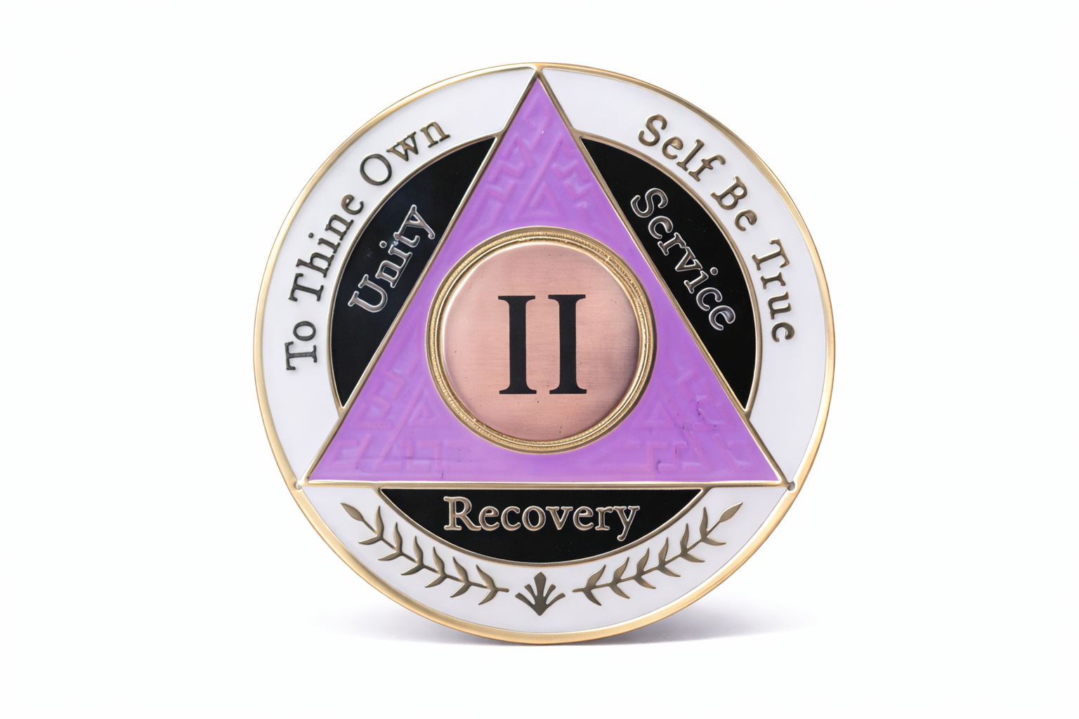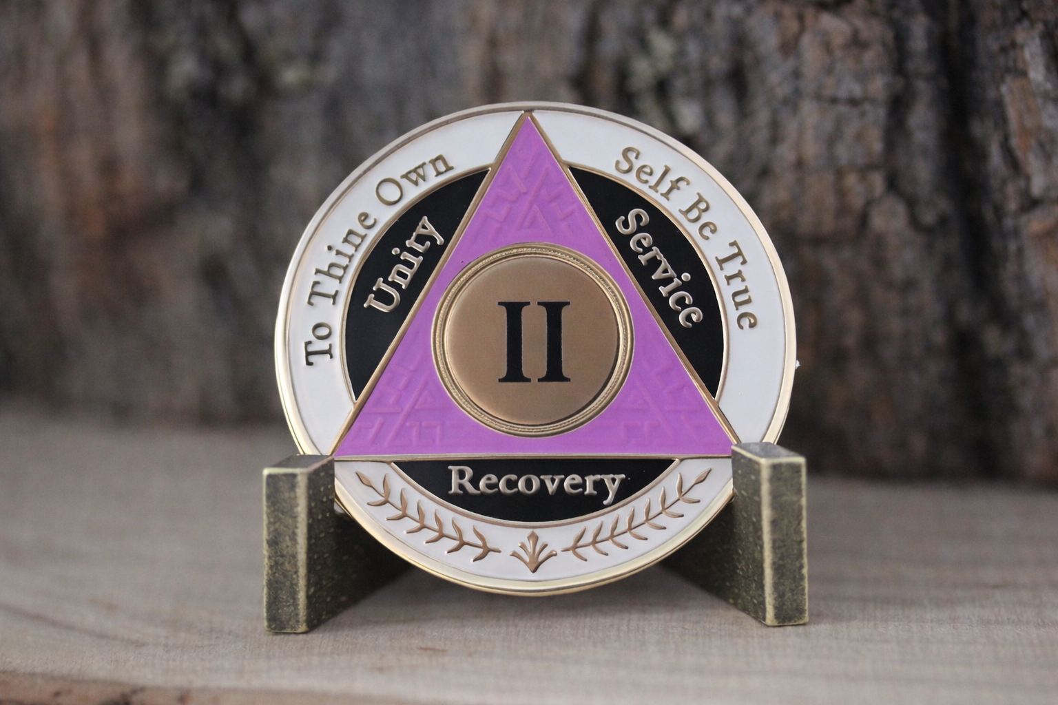 Celebrate your two-year milestone of sobriety with this striking AA coin featuring an elegant purple, white, and black color scheme. This commemorative token serves as a meaningful symbol of your dedication to recovery and personal growth. The coin's distinctive tri-color design makes it easy to distinguish among other milestone markers in your collection. Perfect for carrying as a daily reminder of your journey or displaying alongside other recovery mementos. The durable construction ensures this meaningful token will last as you continue moving forward on your path. A thoughtful gift for someone marking their second year or a personal keepsake to honor your own achievement. This coin represents not just time passed, but strength gained and wisdom gained through 365 days of commitment.