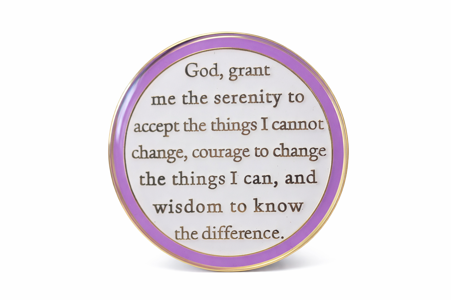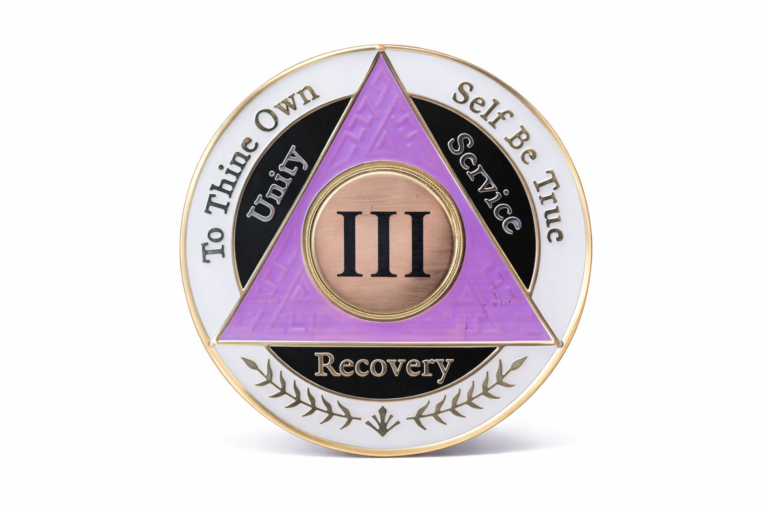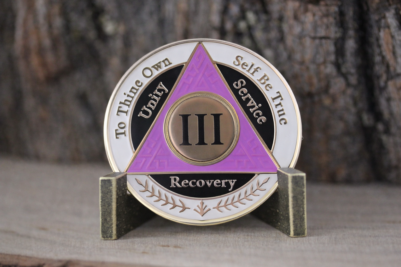 Celebrate your three-year milestone of sobriety with this striking AA coin featuring an elegant purple, white, and black color scheme. This commemorative token serves as a meaningful symbol of your dedication to recovery and personal growth. The coin's distinctive tri-color design makes it easy to distinguish among other milestone markers in your collection. Perfect for carrying as a daily reminder of your journey or displaying alongside other recovery mementos. The durable construction ensures this meaningful token will last as you continue moving forward on your path. A thoughtful gift for someone marking their third year or a personal keepsake to honor your own achievement. This coin represents not just time passed, but strength gained and wisdom earned through 365 days of commitment.