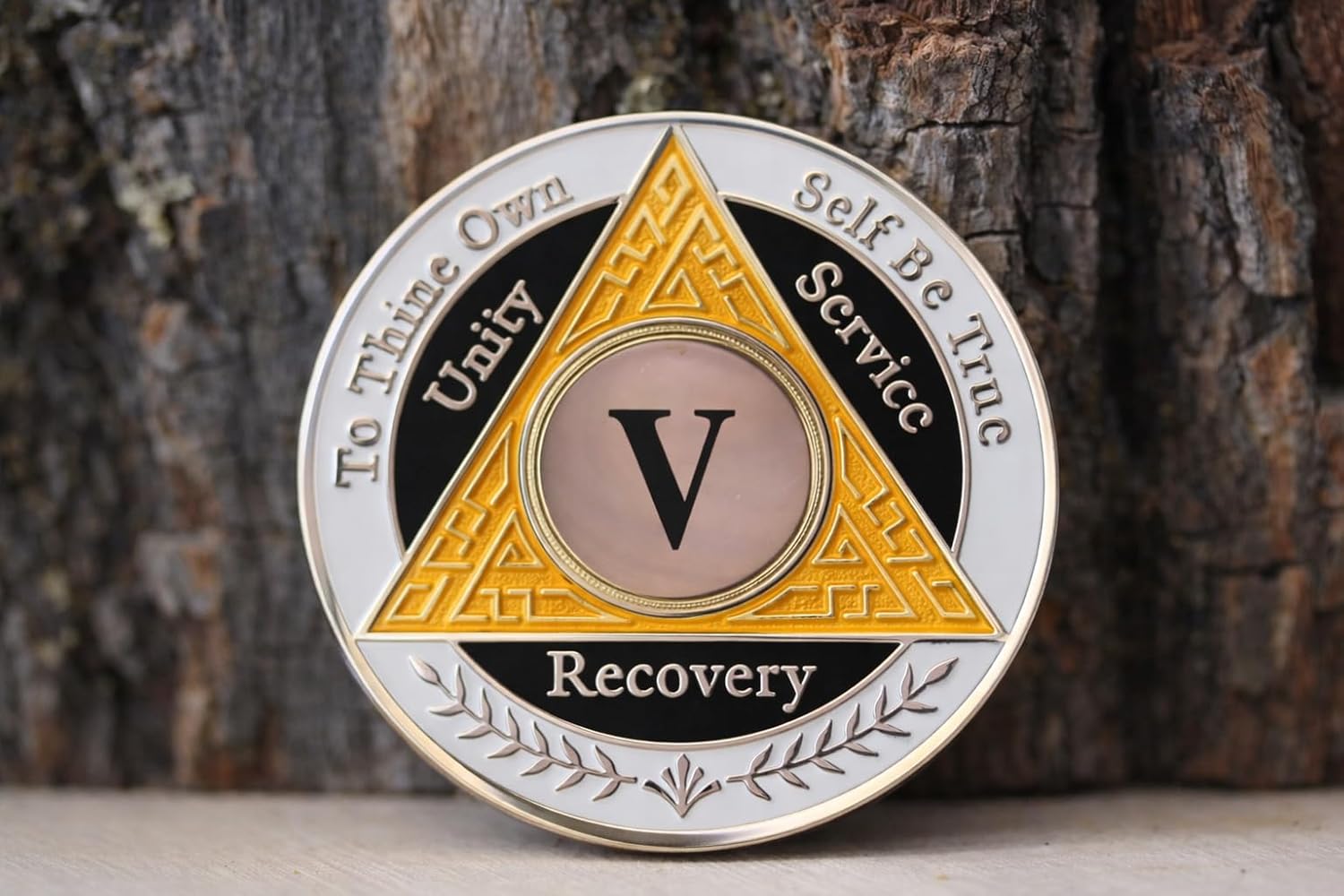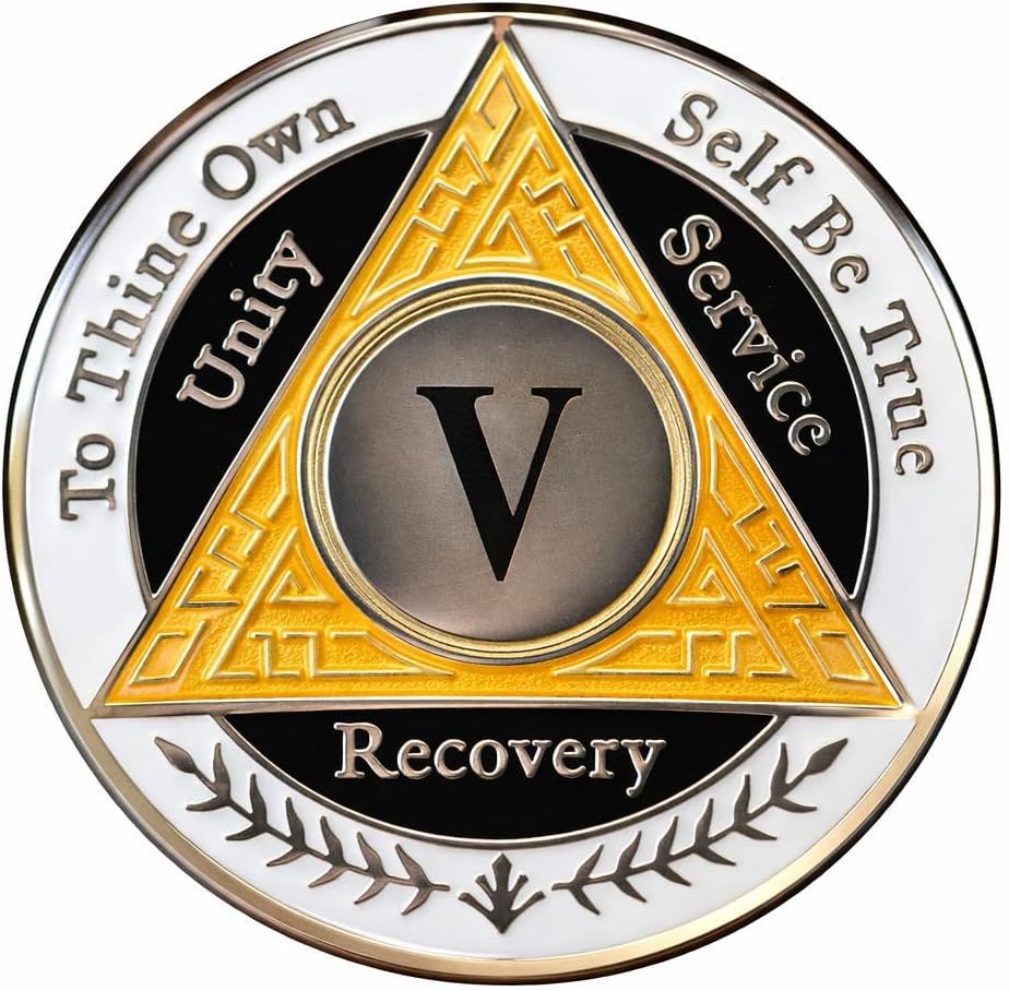 Celebrate your remarkable 5-year milestone in recovery with this striking AA coin featuring a distinctive orange, white, and black color scheme. This commemorative token serves as a powerful symbol of dedication and perseverance on your sobriety journey. The tri-color design makes this coin a meaningful keepsake that you can carry as a daily reminder of your commitment and strength. Perfect for personal reflection or sharing at meetings, this coin represents 1,825 days of transformation and hope. The durable construction ensures this meaningful memento will last for years to come, while its pocket-sized format allows for easy carrying. Whether displayed proudly or kept close as a personal touchstone, this AA coin marks an incredible achievement in your recovery path.