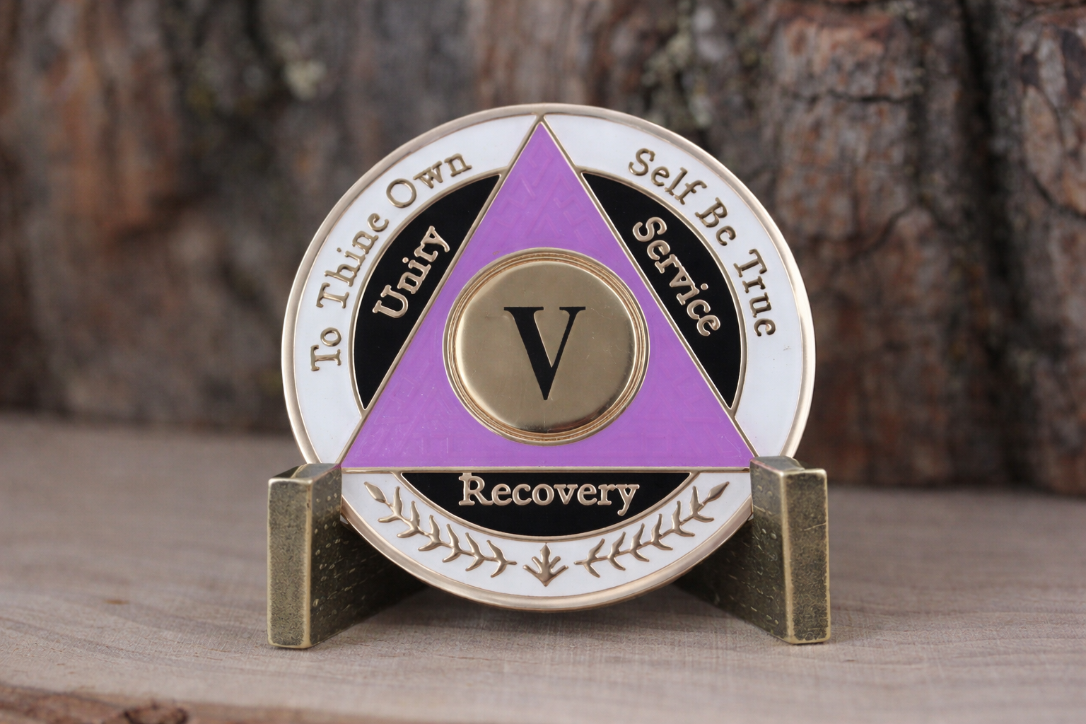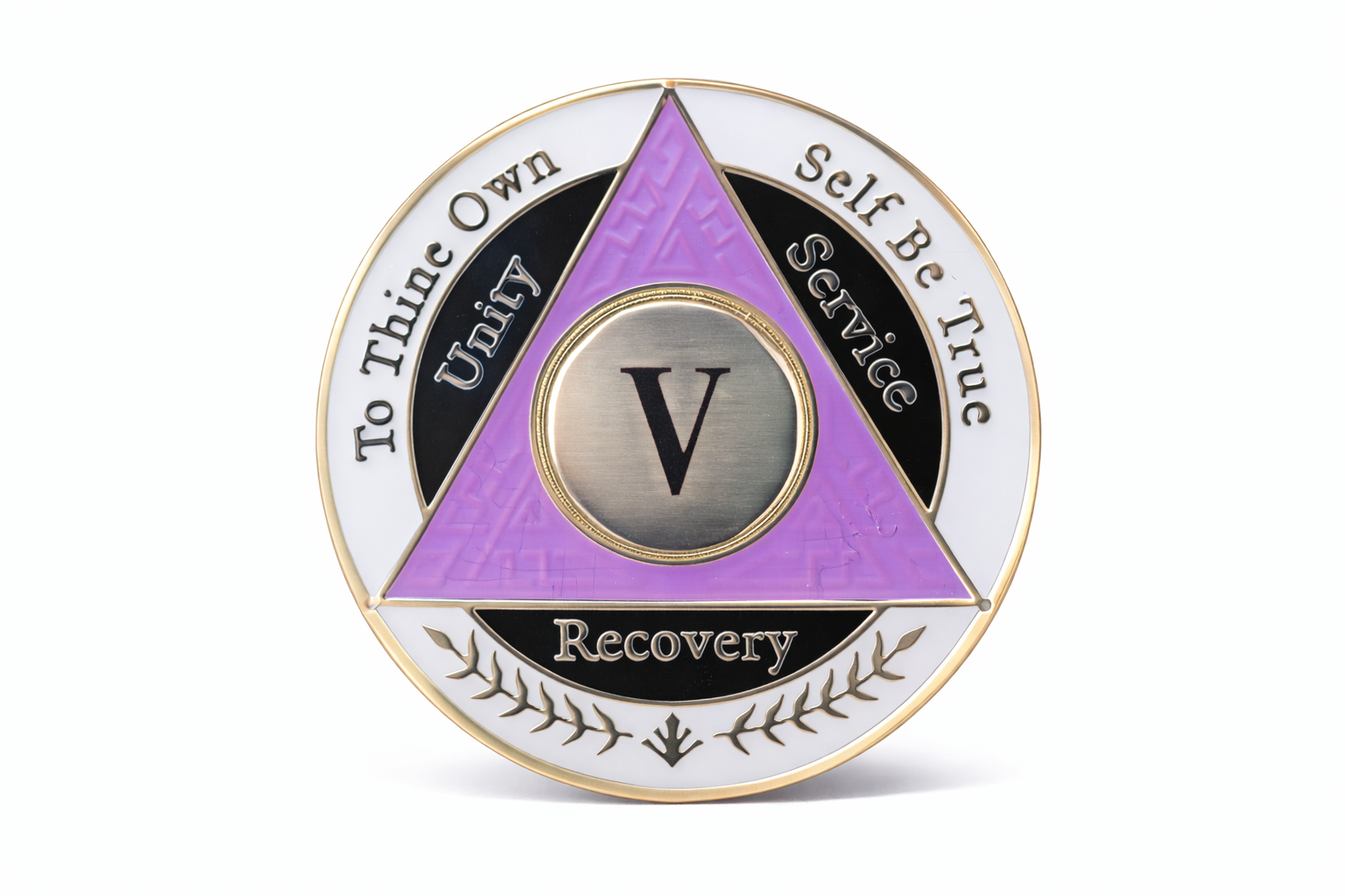 Celebrate your fifth-year milestone of sobriety with this striking AA coin featuring an elegant purple, white, and black color scheme. This commemorative token serves as a meaningful symbol of your dedication to recovery and personal growth. The coin's distinctive tri-color design makes it easy to distinguish among other milestone markers in your collection. Perfect for carrying as a daily reminder of your journey or displaying alongside other recovery mementos. The durable construction ensures this meaningful token will last as you continue moving forward on your path. A thoughtful gift for someone marking their fifth year or a personal keepsake to honor your own achievement. This coin represents not just time passed, but strength gained and wisdom earned through 365 days of commitment.