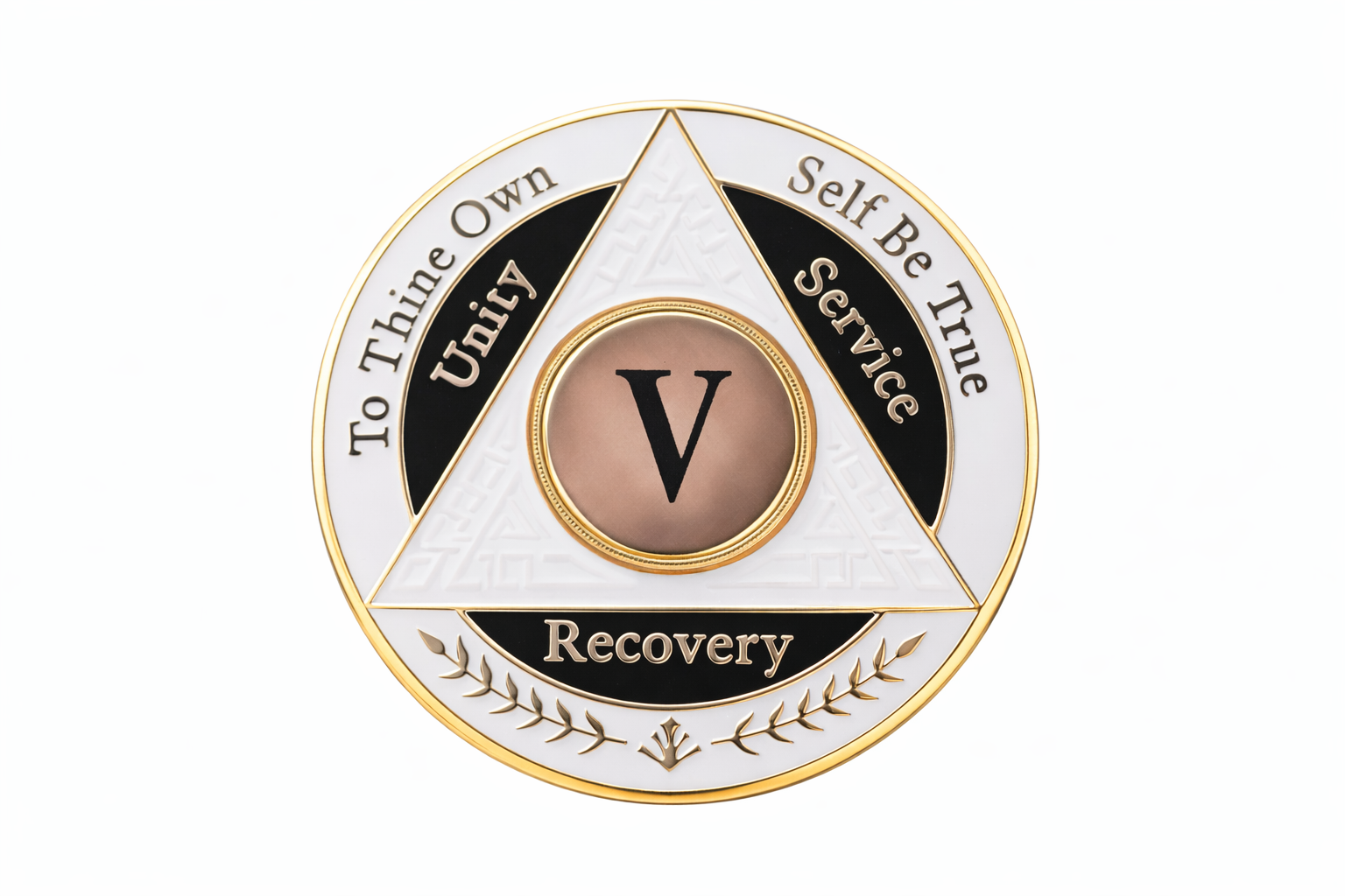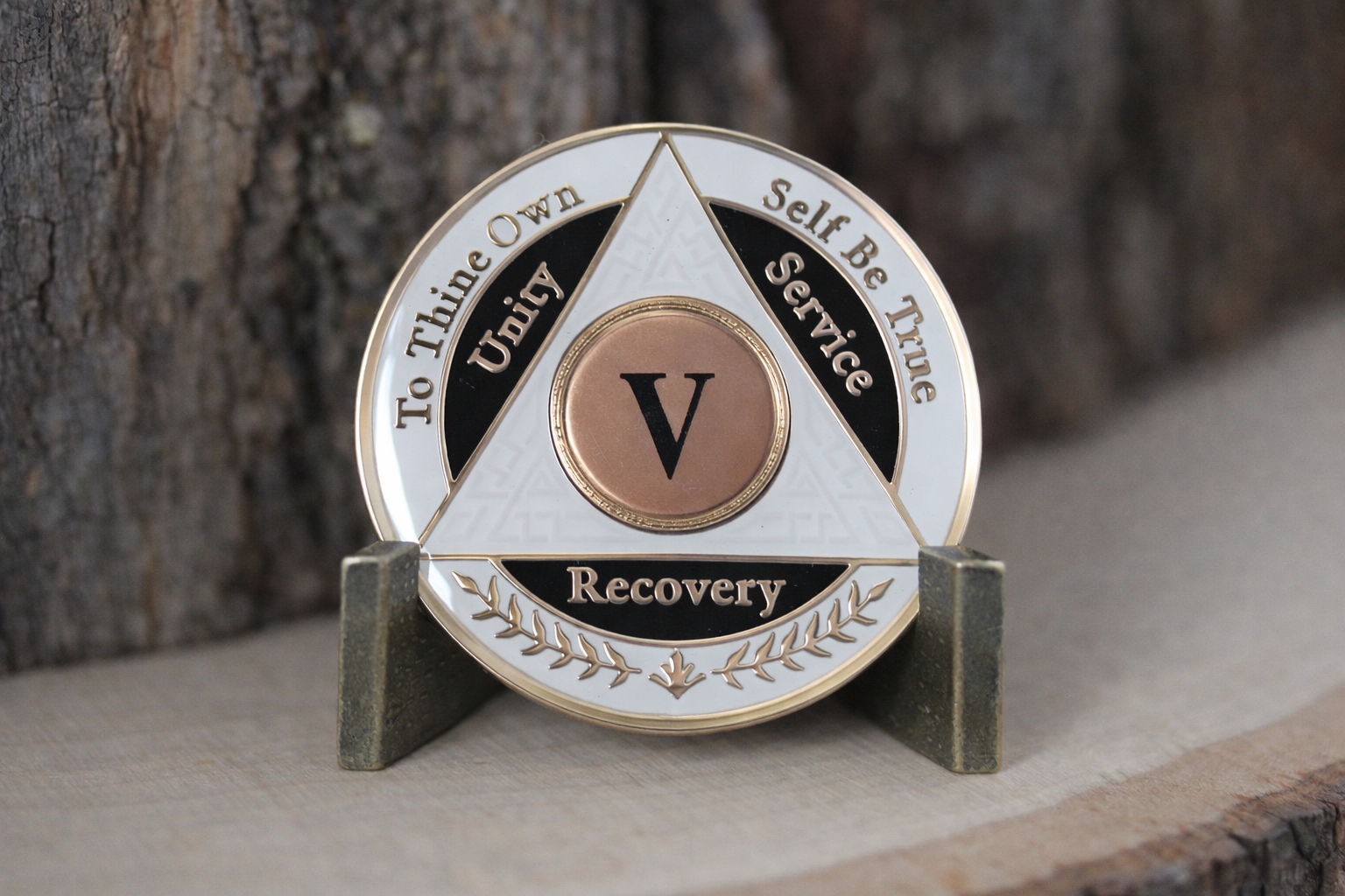 Celebrate a decade of sobriety with this meaningful 5-year AA recovery coin featuring a striking white and black color scheme. This commemorative medallion serves as a powerful symbol of dedication and perseverance on the journey to recovery. The tri-color design makes this coin both visually appealing and deeply significant, perfect for marking this important milestone. Each coin is crafted with attention to detail, making it a cherished keepsake for both the recipient and those who support them. The coin's size makes it convenient to carry as a daily reminder of commitment and strength. Whether displayed proudly or kept close as a personal touchstone, this AA coin represents five years of transformation and hope.