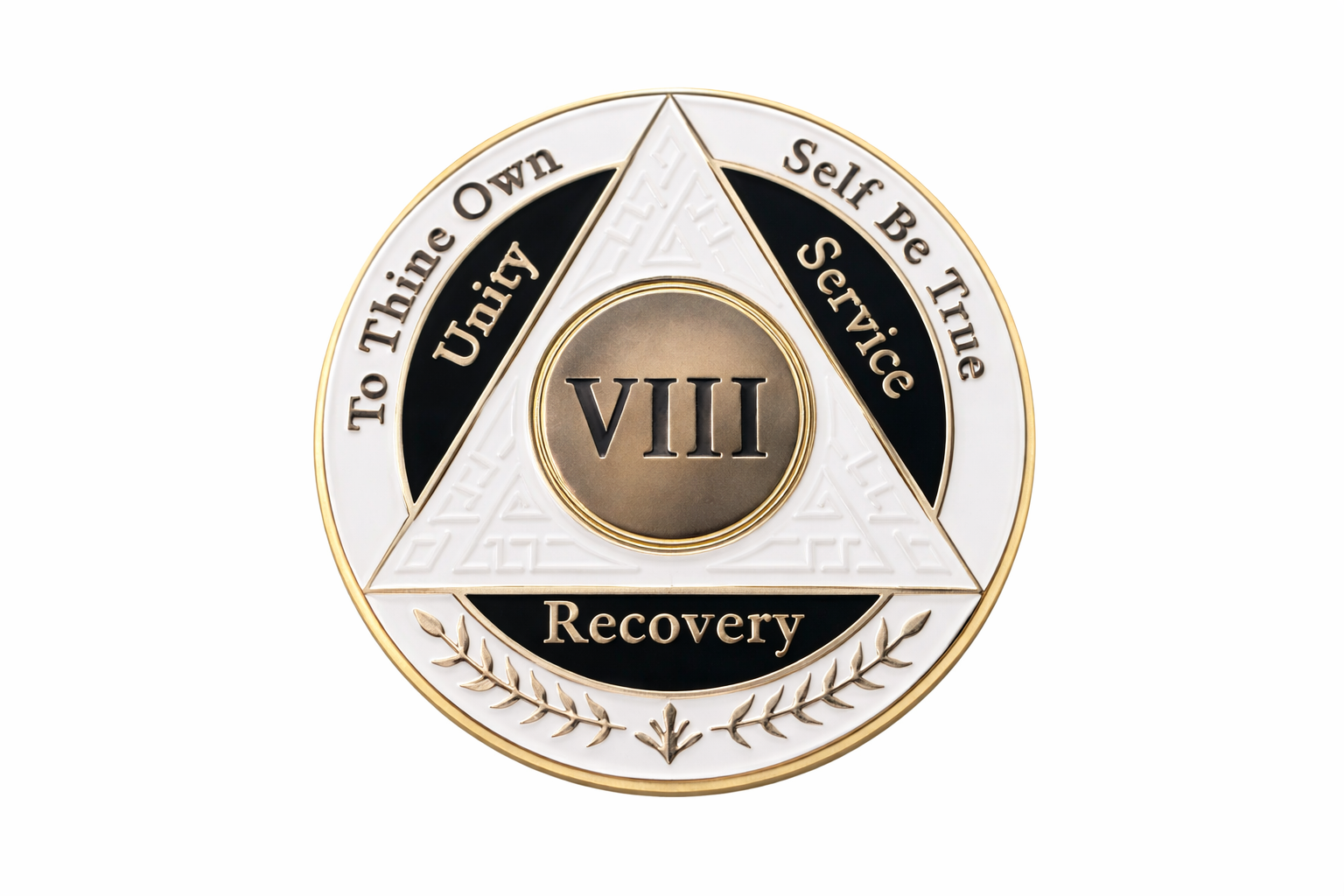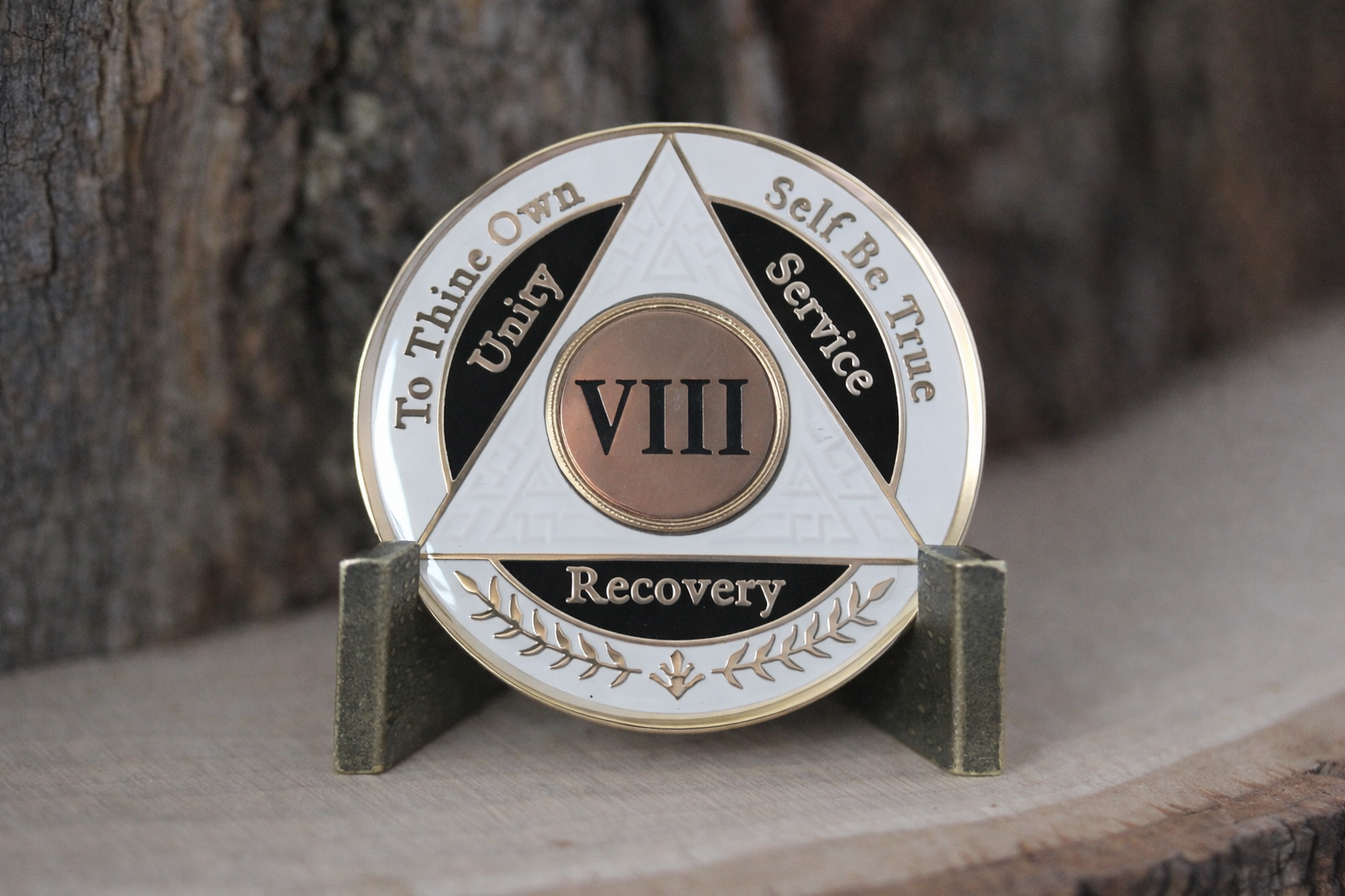 Celebrate a decade of sobriety with this meaningful 8-year AA recovery coin featuring a striking white and black color scheme. This commemorative medallion serves as a powerful symbol of dedication and perseverance on the journey to recovery. The tri-color design makes this coin both visually appealing and deeply significant, perfect for marking this important milestone. Each coin is crafted with attention to detail, making it a cherished keepsake for both the recipient and those who support them. The coin's size makes it convenient to carry as a daily reminder of commitment and strength. Whether displayed proudly or kept close as a personal touchstone, this AA coin represents 8 years of transformation and hope.