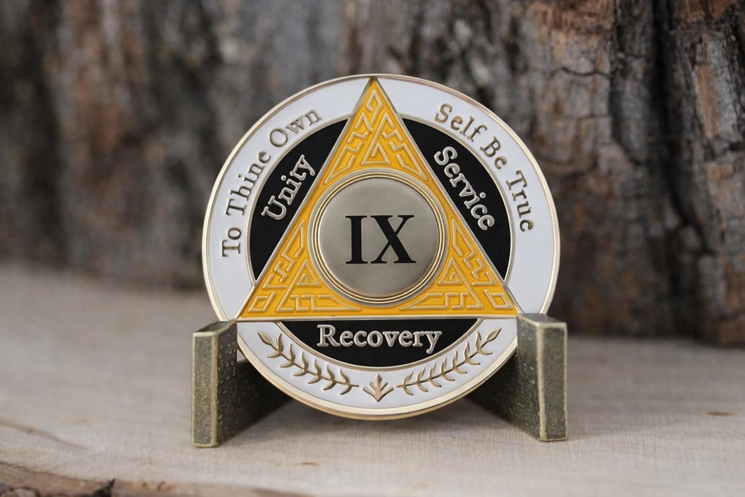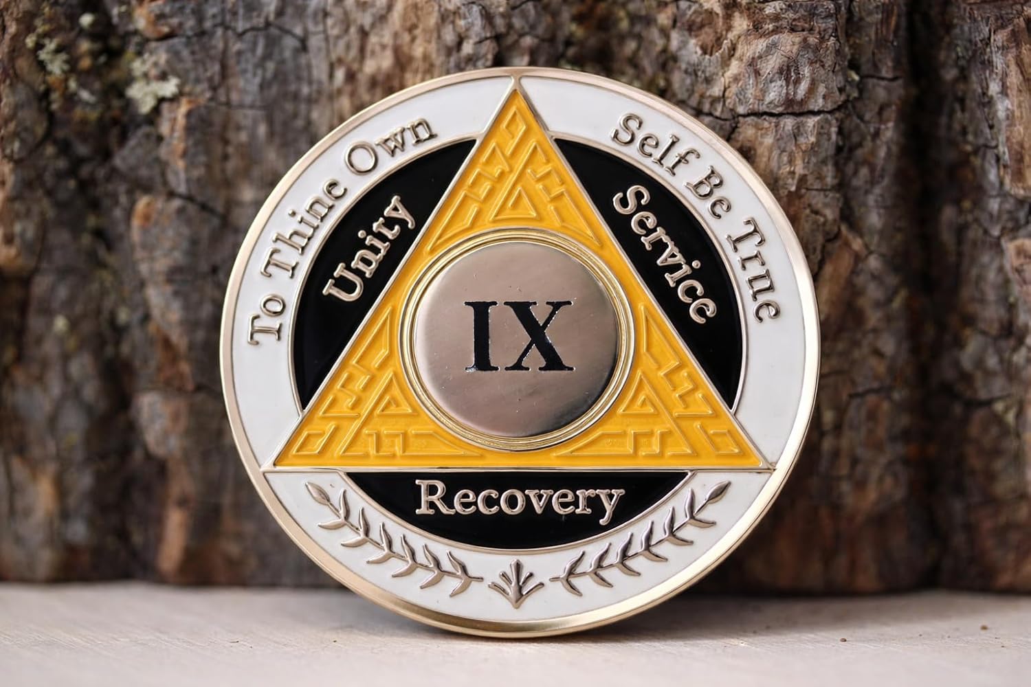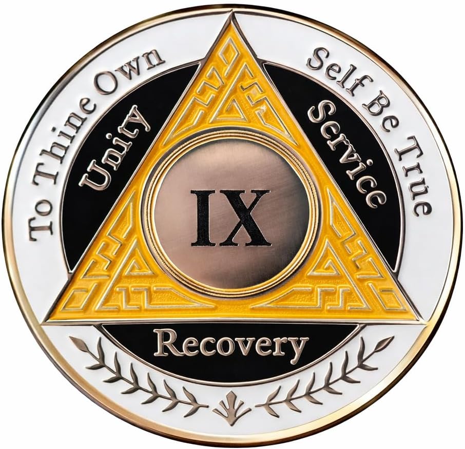 Celebrate your remarkable 9-year milestone in recovery with this beautifully crafted AA coin featuring a striking orange, white, and black color combination. This commemorative token serves as a powerful symbol of your dedication and perseverance on your journey. The tri-color design makes this coin both meaningful and visually distinctive, perfect for carrying as a daily reminder of your achievement or displaying alongside other recovery milestones. Each coin is thoughtfully designed to honor this significant accomplishment in your sobriety journey. The durable construction ensures this meaningful memento will continue to inspire and motivate you for years to come. A cherished keepsake that represents strength, hope, and commitment to your ongoing recovery path.