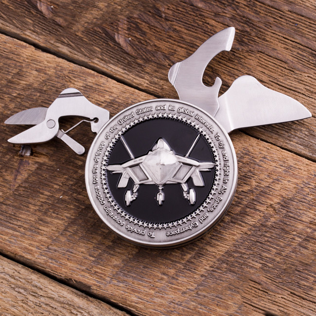This 2″ antique silver Air Force knife and coin features a 3D aircraft and is surrounded by the phrase: “To provide sovereign options for the defense of the United States and its global interests. To fly and fight in Air, Space, and Cyberspace.” The front of the coin asserts, “United States Air Force ABOVE ALL.” This handy multi-tool coin has a 1″ knife, bottle opener, and pair of scissors that fold right into the center of the coin.