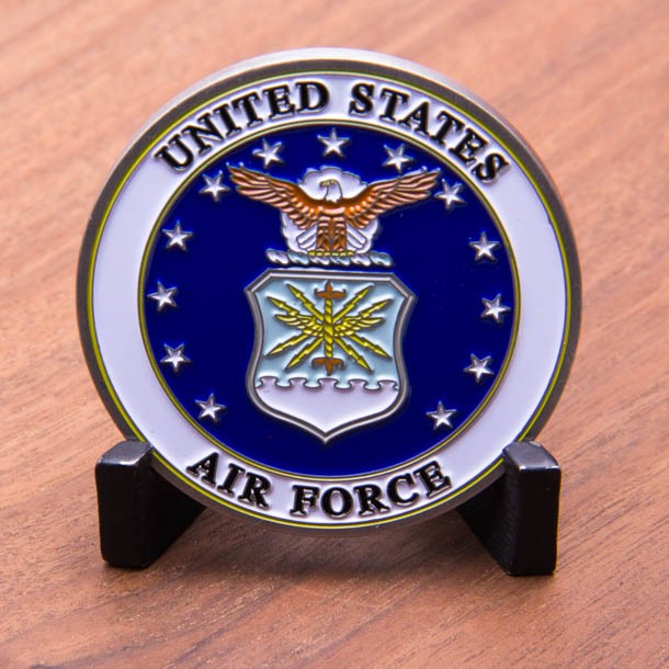 This stunning 1.75″ antique silver challenge coin has a gold swirl cut edge and features the mottos “Uno Ab Alto,” “Above All,” and “Aim High.” The front features a beautiful glittered American flag in full color as well as a proud 3D eagle and Air Force aircraft flying overhead. The back of the coin features the Department of the Air Force Seal in bold color. Fly high with this detailed collectible!