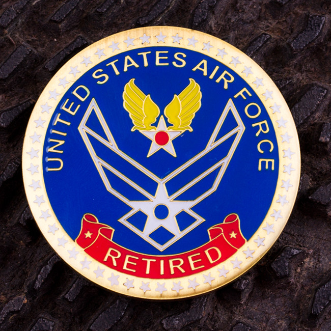 This 1.75″ antique brass challenge coin features centered Air Force logos below the words, “United States Air Force” on a rich blue background, with surrounding stars, and a red banner at the bottom that says, “Retired”. The reverse side of the coin has the words “Above All” above a raised Air Force emblem, as well the words, “Integrity, Service, and Excellence.” This side has a textured background and is surrounded by raised brass stars. Commemorate your Air Force career with this hard-earned challenge coin.