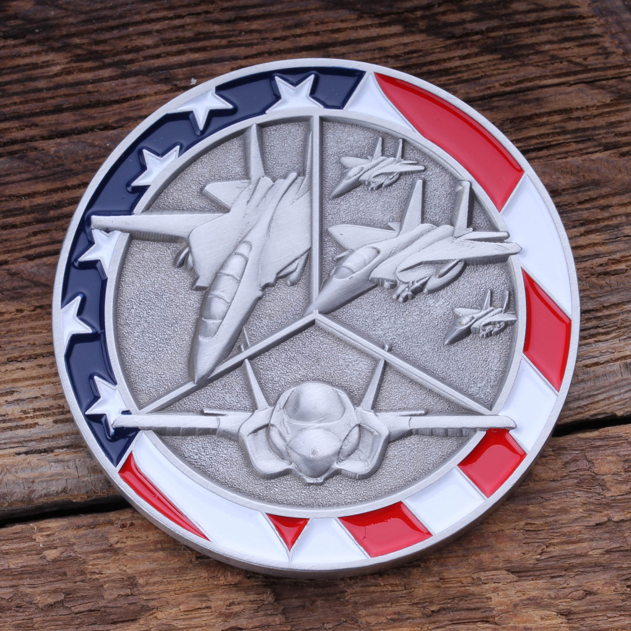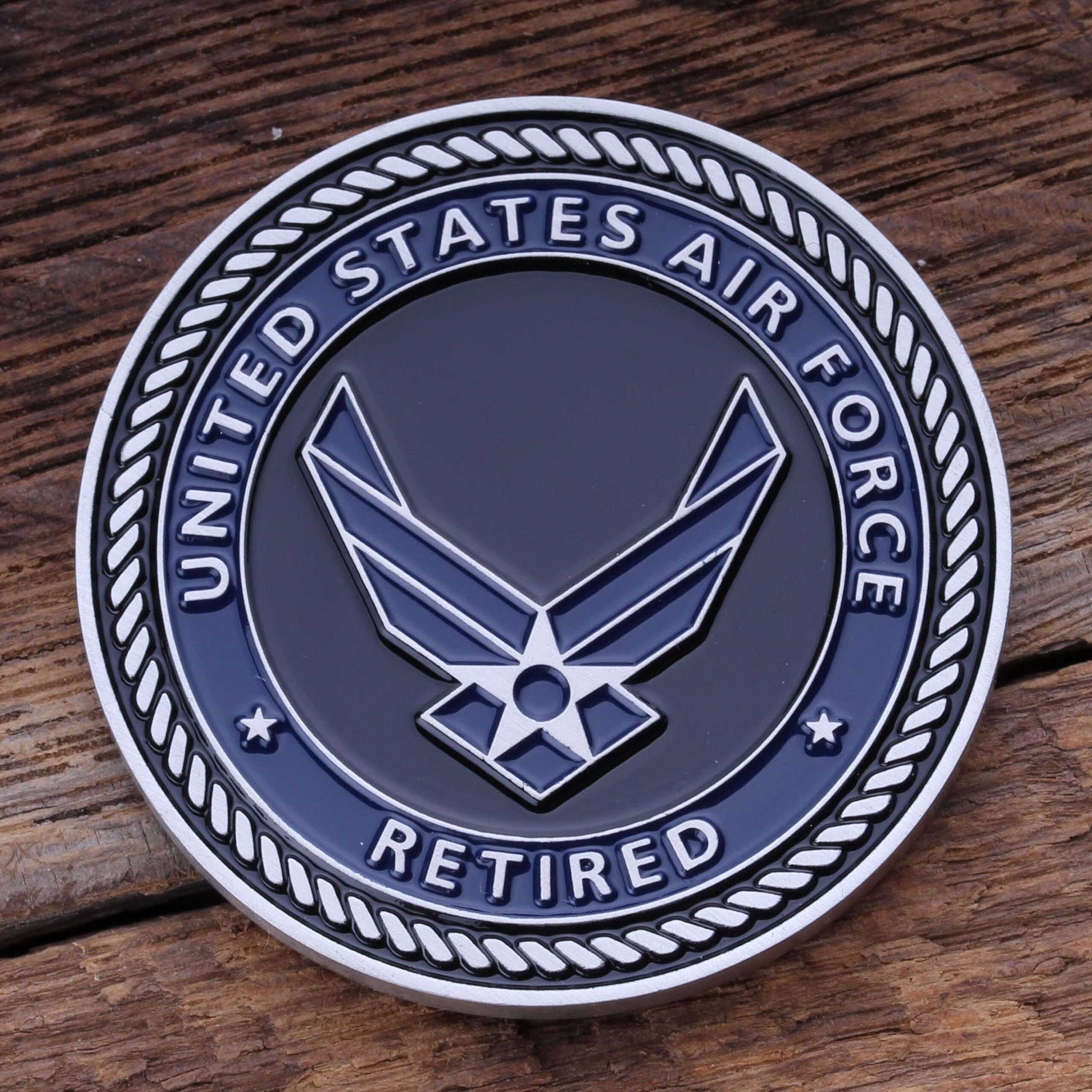 This 1.75″ antique silver challenge coin features the Air Force logo on a black background below the words, “United States Air Force” on a rich blue background, with surrounding stars, and text at the bottom that says, “Retired”. The reverse side of the coin features 3-d images of an F-14 Tomcat, an F-22 Raptor, and three F-15 Eagles in formation. This side has a textured background and is surrounded by an American flag border. Commemorate your Air Force career with this hard-earned challenge coin!