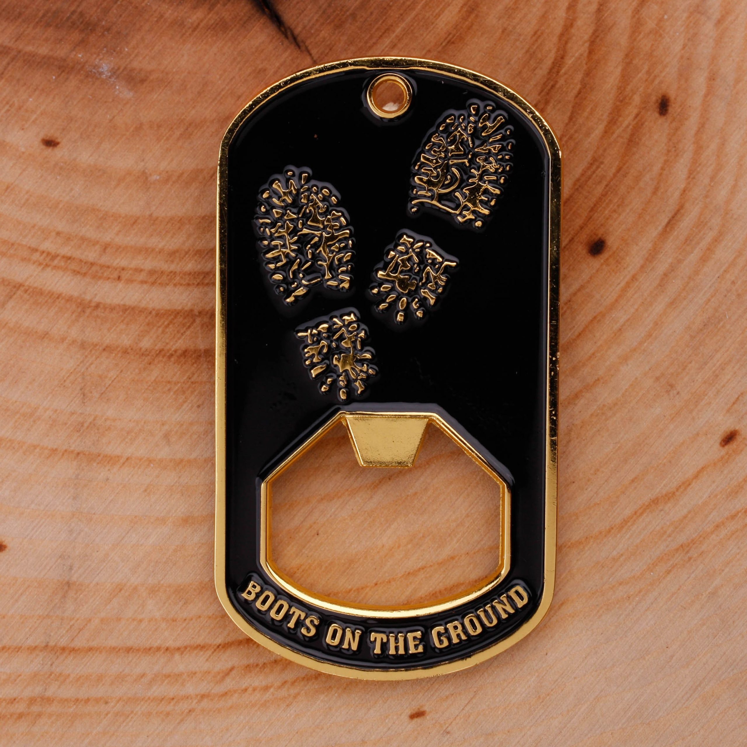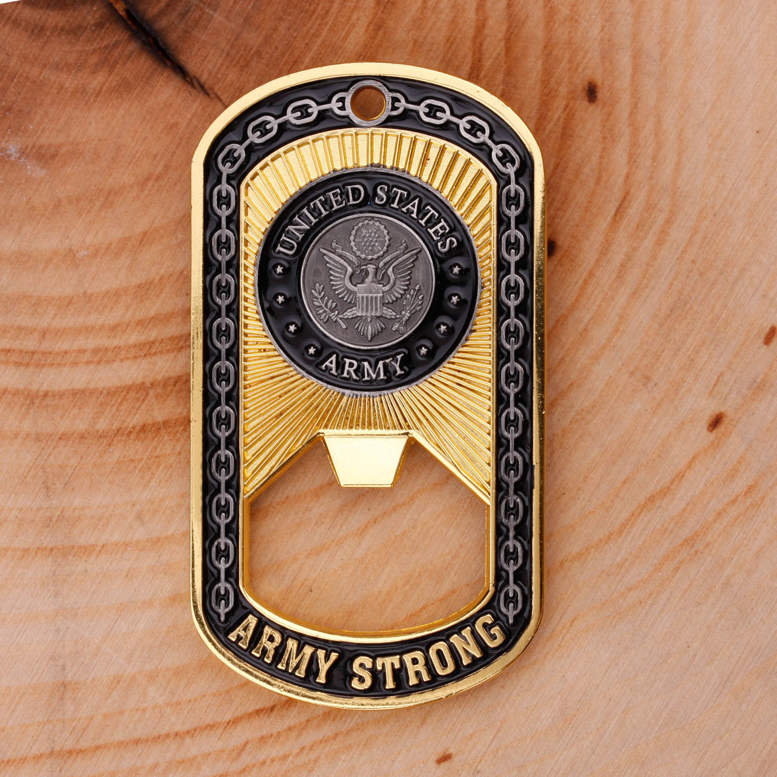 This U.S. Army bottle opener Challenge Coin captures the history and use of military challenge coins, when those caught without their unit’s challenge coin were compelled to buy a round for all their comrades. That military spirit is captured in this boldly detailed and highly practical coin. The front features the U.S. Army Seal with the phrase “Army Strong” below. The reverse has the classic boot printe centered in a dark black enamel with the phrase “Boots On The Ground”. Struck in a brass alloy and finished in shiny gold, this closed-loop bottle opener. This U.S. Army bottle opener challenge coin is 2 ½ inches by 1 ¼ inches.