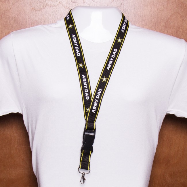 This black, white and gold imprinted polyester lanyard is 1″ in width and approximately 20″ long. It features repeating white and gold Army stars as well as the text, “Army Dad.” Each lanyard comes complete with a sturdy safety buckle, buckle release and metal lobster claw to safely secure your belongings.