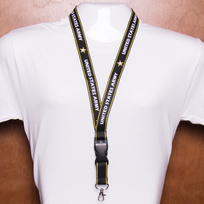 This black, white and gold imprinted polyester U.S. Army lanyard is 1″ in width and approximately 20″ long. It features repeating white and gold Army stars as well as the text, “United States Army.” Each lanyard comes complete with a sturdy safety buckle, buckle release and metal lobster claw to safely secure your belongings.