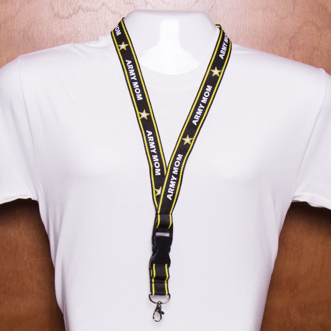 This black, white and gold imprinted polyester lanyard is 1″ in width and approximately 20″ long. It features repeating white and gold Army stars as well as the text, “Army Mom.” Each lanyard comes complete with a sturdy safety buckle, buckle release and metal lobster claw to safely secure your belongings.