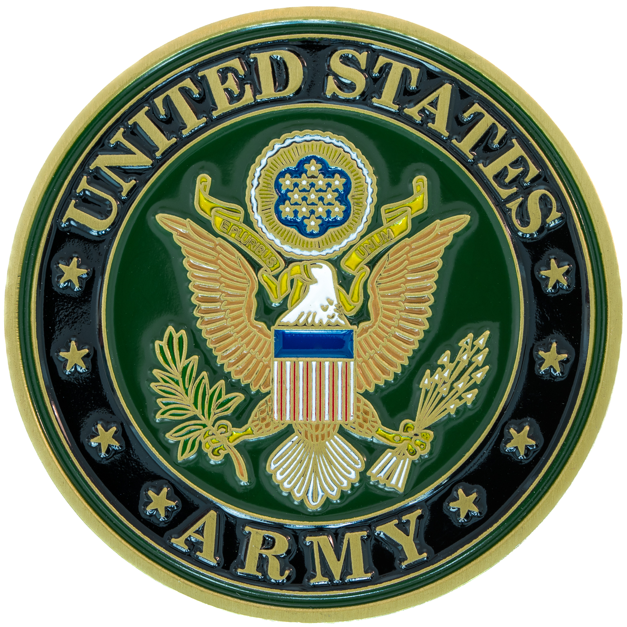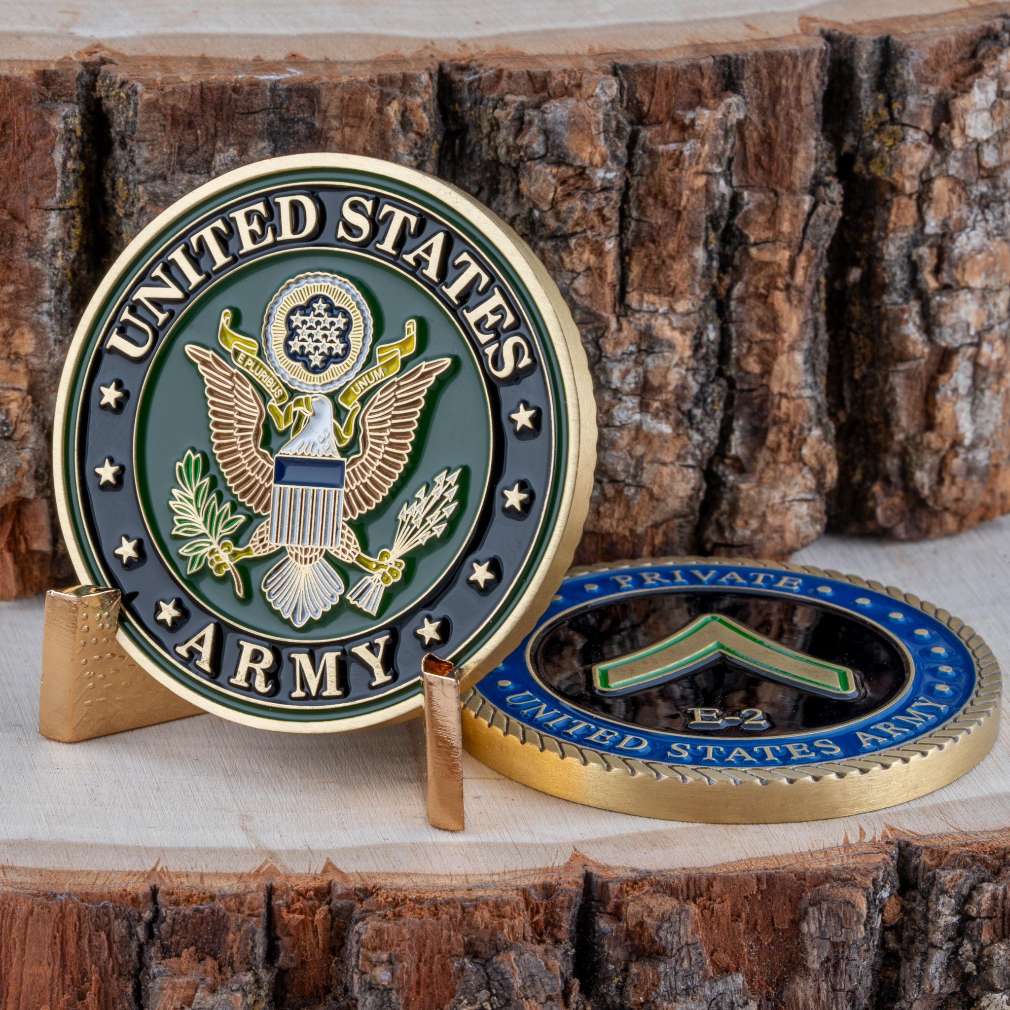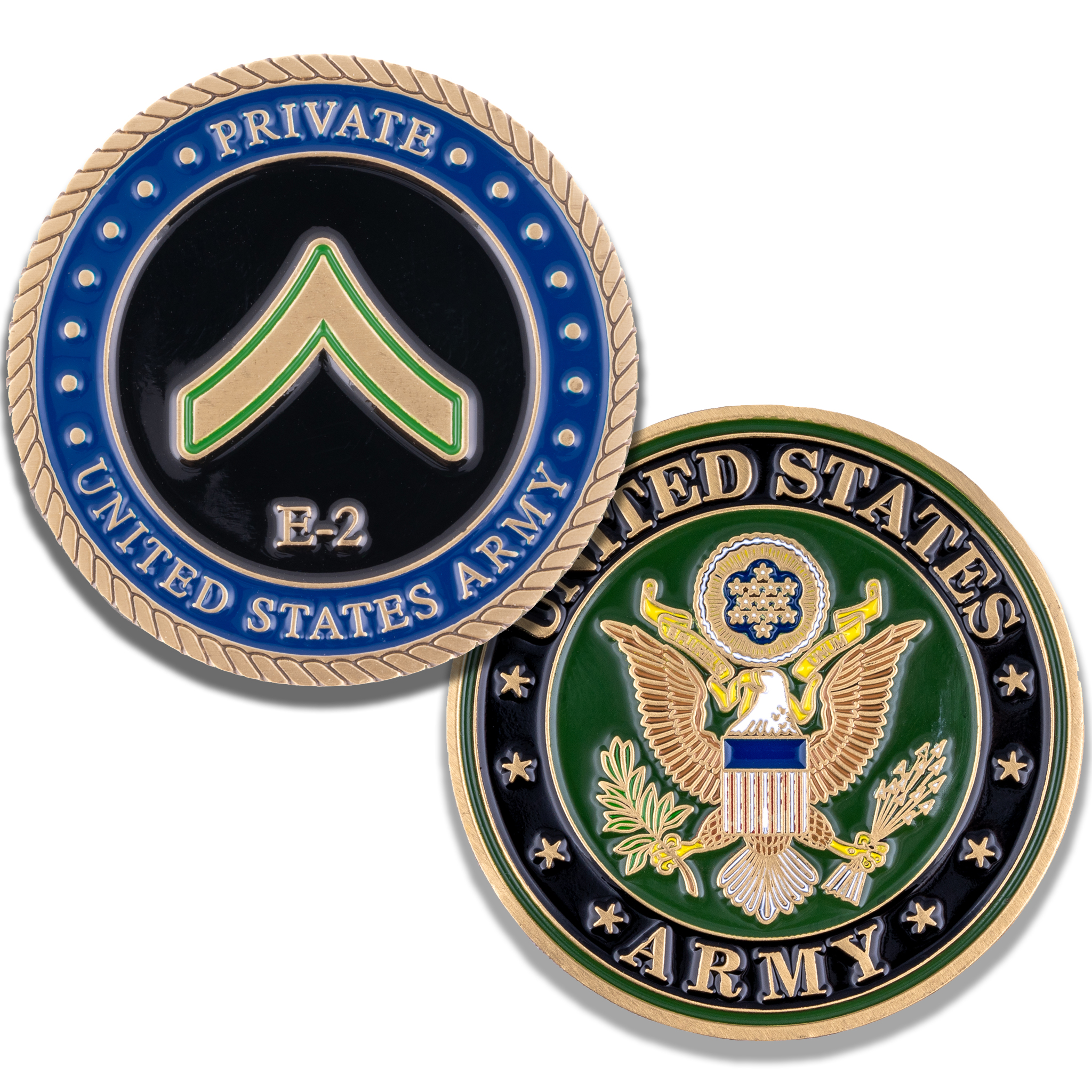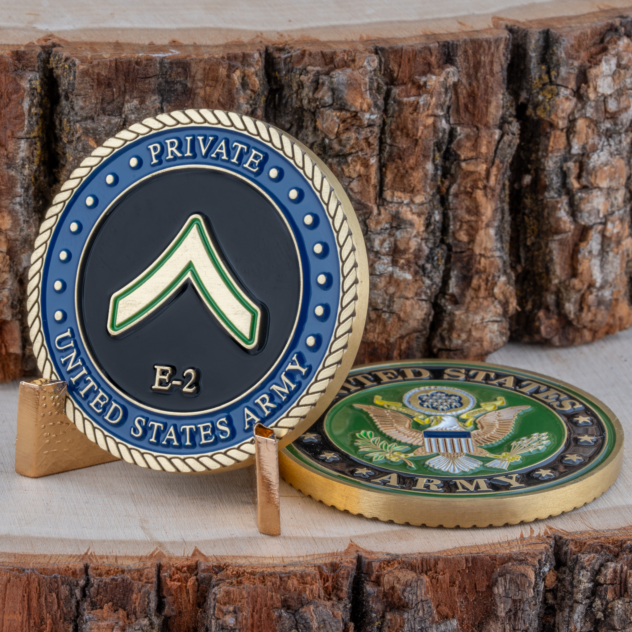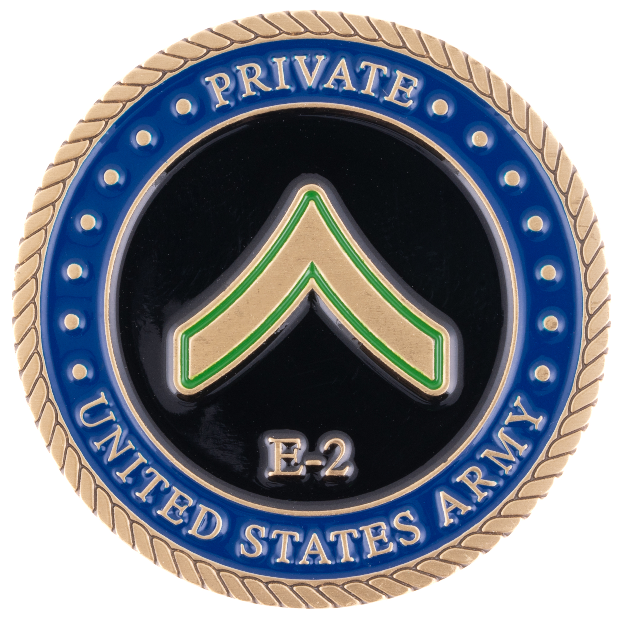This challenge coin is 1.75″ antique brass with a real rope line edge. The front of the coin has a dark blue ring with the words “Private First Class” at the top and “United States Army” at the bottom. The middle of the coin has a black background and features the rank insignia in full color. The reverse side of the coin features the Army Emblem in full color.