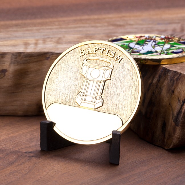 Commemorate a Baptism with this exquisite 1.75″ shiny gold coin. It features beautiful translucent paints that resemble stained glass, and a peaceful white dove in the center. The front side also has a cross cut diamond edge. The reverse side has a raised baptismal font with the word “Baptism” at the top, and a blank area for personalized engraving.