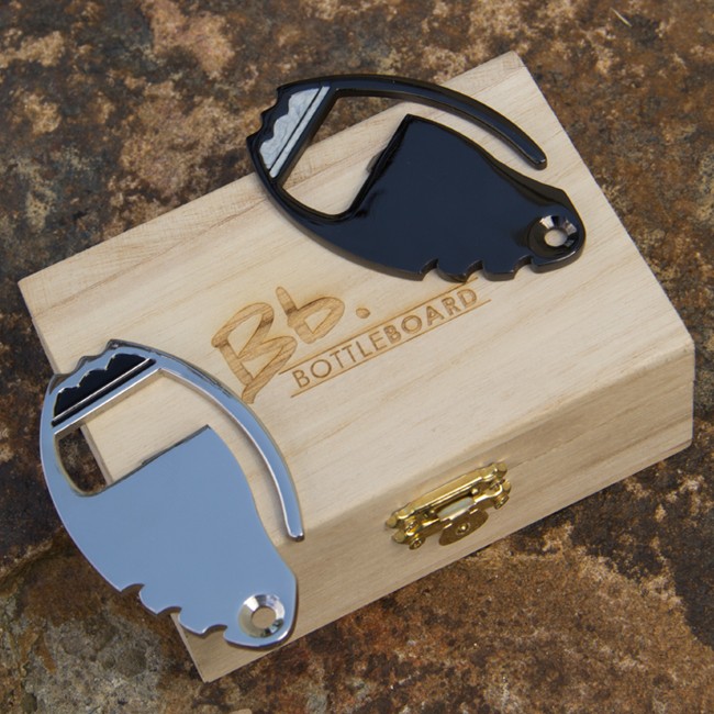 This stylish twist on a multi-function utility tool is fashionable, functional, sleek and durable. At the relatively small 1.75″ w x 3″ h x 4mm thick, its slim design makes it non-intrusive virtually anywhere. The functions of a bottle opener, paracord 550 tightening tool, or even to neatly wrap headphone cords, make life a tad bit simpler. Made from stainless steel, and available in Chrome with Matte Black or Black Nickel with White Pearl, this small pocket-sized utility tool has a reflective surface to use in the unfortunate event of becoming stranded. Add a wooden box for storage or great presentation!