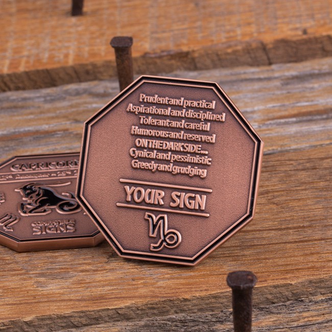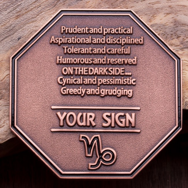 Do you ever question if you will be compatible with a new partner, or why you don’t get along with certain people? The answer may have to do with your astrological sign. Introducing a unique series of collectible coins that feature amazing facets of the Zodiac. These 2″ antique copper Capricorn coins are octagon in shape and raised areas of metal allow for key design elements to be paint filled with black. The front sides feature the zodiac iconography along with compatible signs. The backsides of these Capricorn themed gifts display the sign’s strengths and weaknesses, as well as the sign’s own symbol. Order your own sign, and your significant other’s sign.