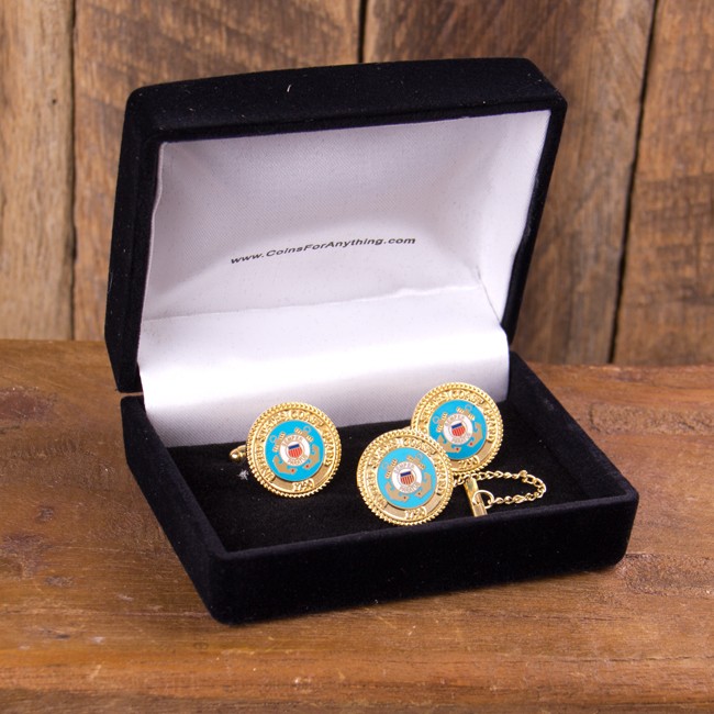 This set includes a set of 0.75″ shiny gold cufflinks and a tie-tack to match. Each piece features the Coast Guard emblem in full color. The set comes in a beautiful black velvet box that is perfect for storage or presentation. A great way to wear your pride for the United States Coast Guard!