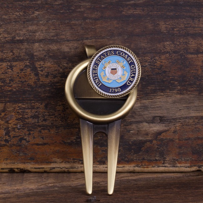 A divot tool is used to fix the indention made after a ball hits the green, and a ball marker is used to reserve a ball’s position. This set includes a 3” x 1.35” durable antique brass divot tool with an attached clip for easy carrying, and two golf ball coin markers featuring the United States Coast Guard Emblem in full color. The golf coin markers are magnetic and fit perfectly by attraction into the divot tool. This is a perfect Coast Guard retirement gift or gift for ANY golfer that supports the U.S. Coast Guard!