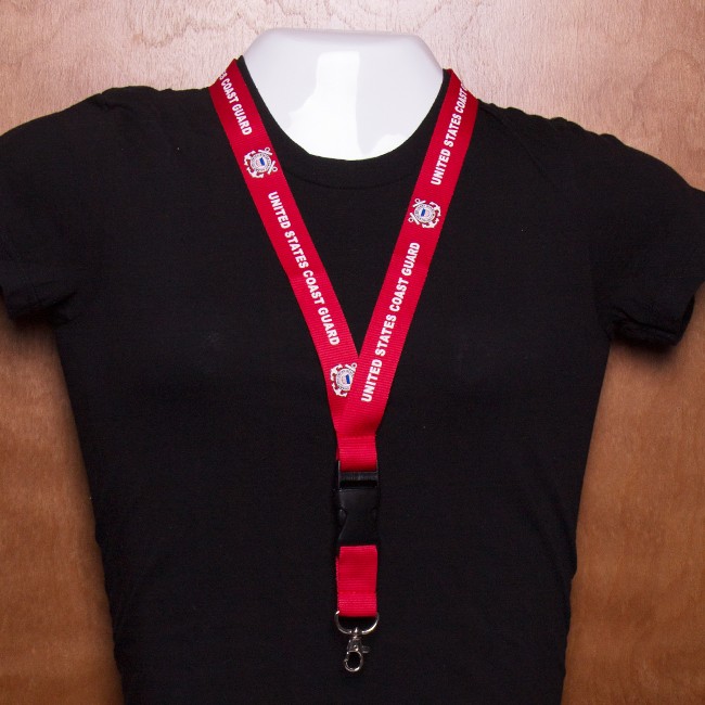 This red and white imprinted polyester U.S. Coast Guard lanyard is 1″ in width and approximately 20″ long. It features repeating Coast Guard emblems as well as the text, “United States Coast Guard.” Each Coast Guard lanyard comes complete with a sturdy safety buckle, buckle release and metal lobster claw to safely secure your belongings.