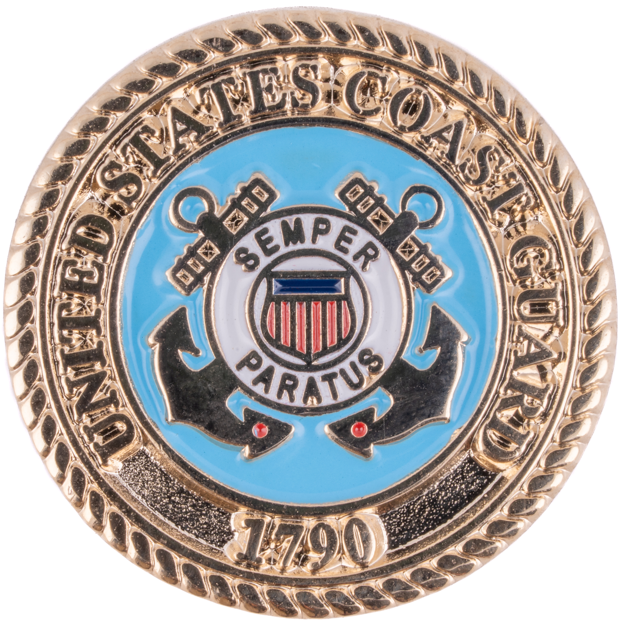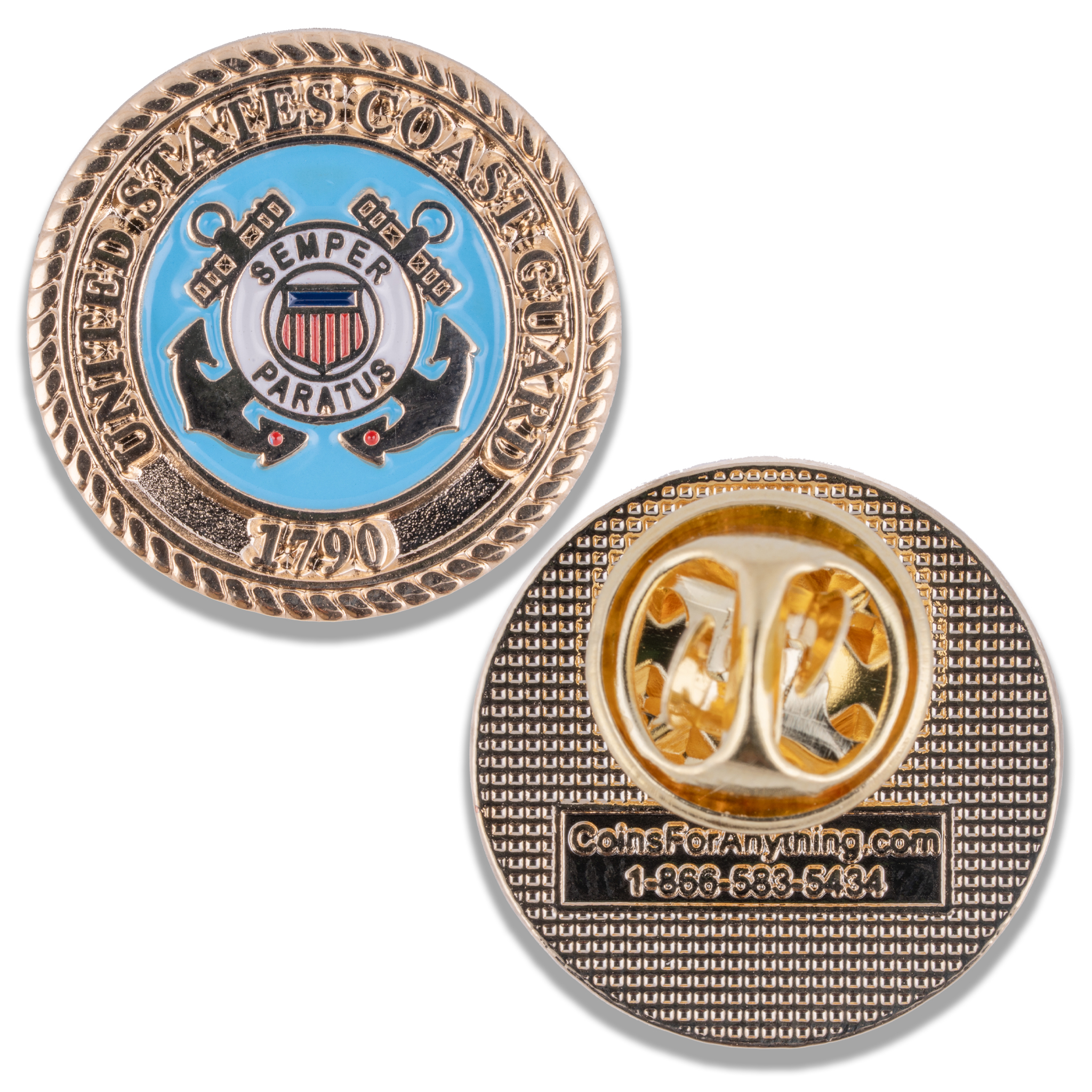 This 0.75″ shiny gold lapel pin features the Coast Guard emblem in full color, surrounded by a stylized rope line border, and comes complete with a butterfly clutch backing. Makes a great gift for any supporter of the U.S. Coast Guard!
