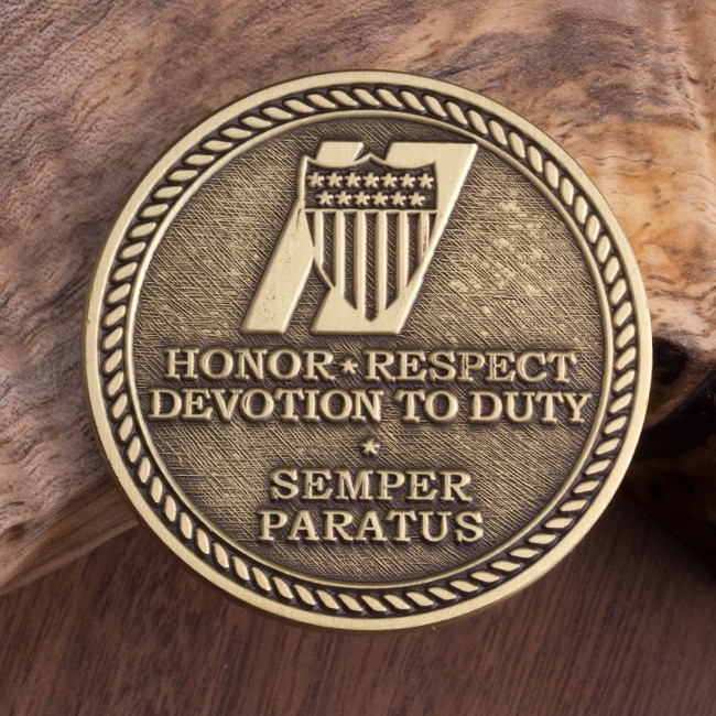 This 1.75″ antique brass challenge coin features the Department of the Coast Guard Emblem in full color, with a surrounding rope line and a red banner at the bottom that states, “Retired.” The reverse side of the coin has the words: “Honor ★ Respect ★ Devotion to Duty” as well as the Coast Guard motto, “Semper Paratus” meaning “Always Ready.” Commemorate your Coast Guard career with this hard-earned challenge coin!