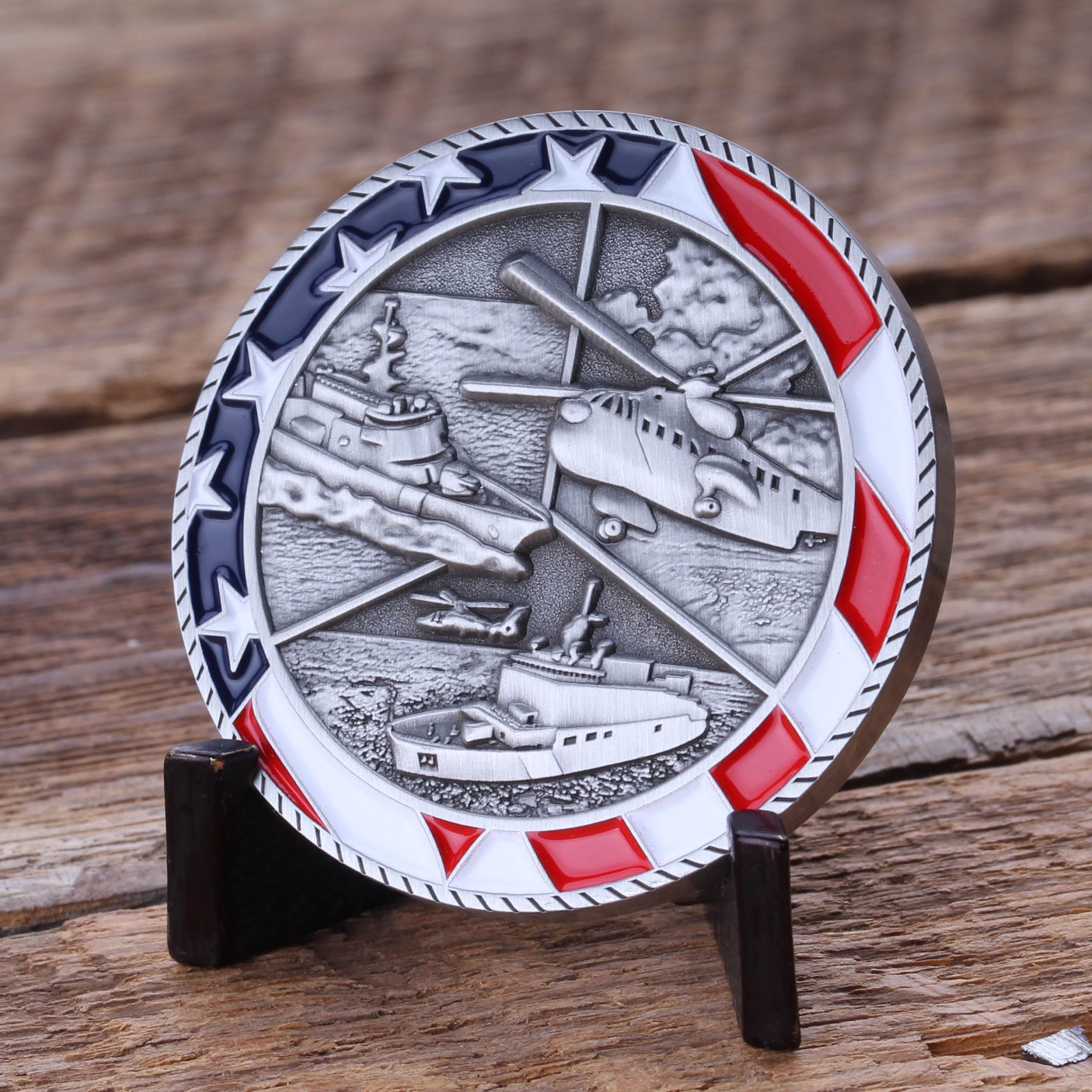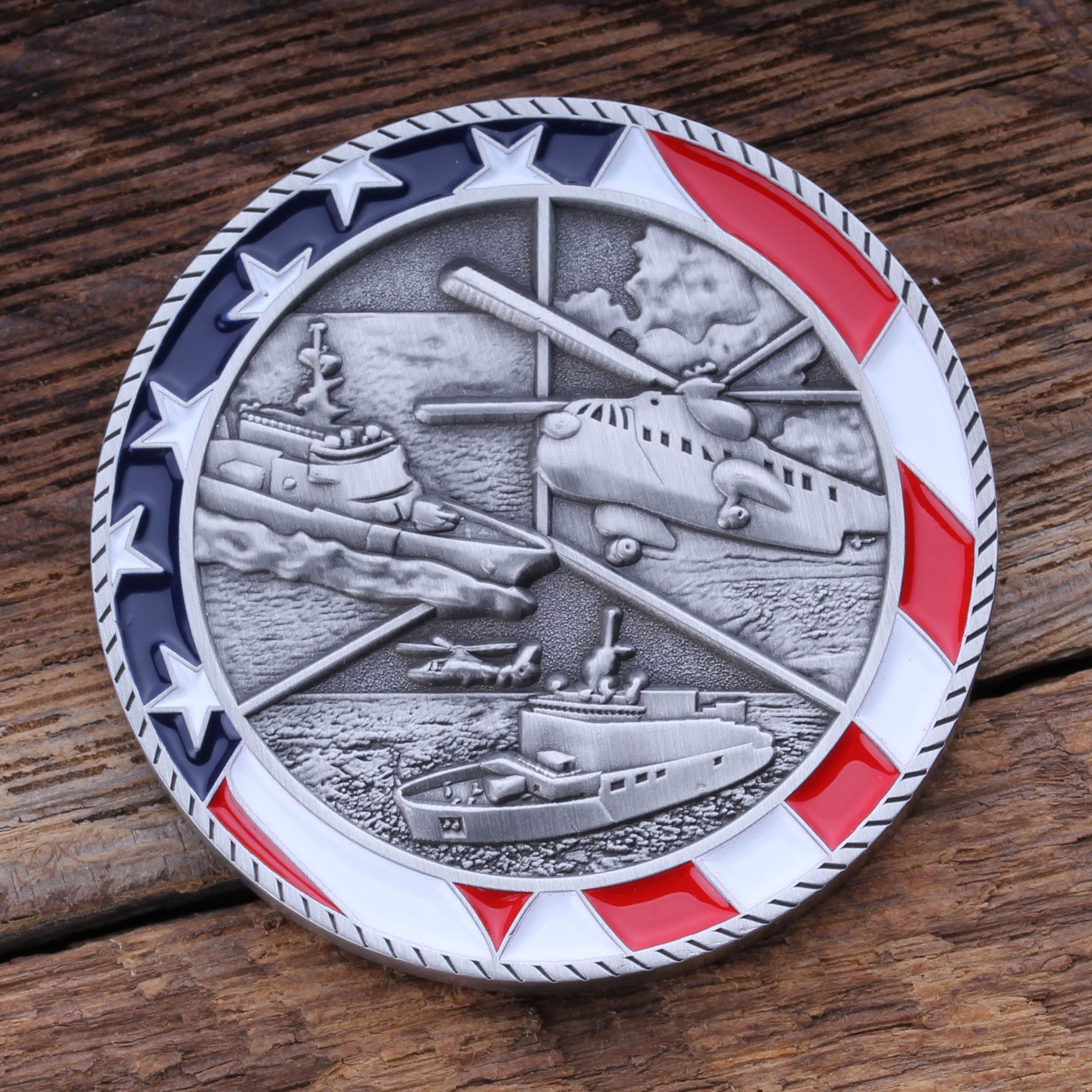 This 1.75″ antique silver challenge coin features the United States Coast Guard Emblem in color, with a surrounding rope line and text encircling the shield that states, “United States Coast Guard Retired” on a red background. The emblem is set against a light blue background to create a stunning contrast. The reverse side of the coin features the icebreaker CGC Healy, an MH-65D Dolphin short range recovery helicopter, the USCGC Argus (currently under construction), and the historical HH-3F “Pelican” Search and Rescue helicopter, all set against a textured background and bordered by a patriotic flag inlay that is finished off with a rope edge. Commemorate your Coast Guard career with this hard-earned challenge coin!