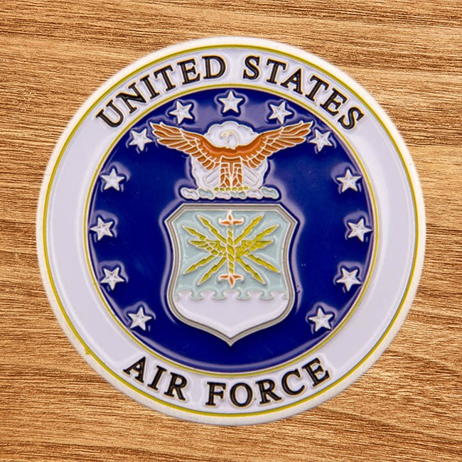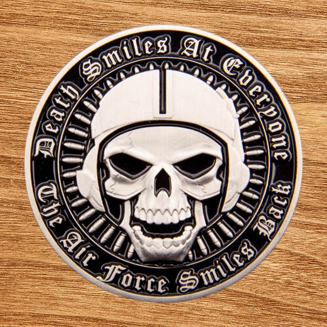 “Death Smiles at Everyone…The Air Force Smiles Back” is asserted on this menacing 1.75″ antique silver Air Force coin. The front of the coin features a 3D skull wearing an Air Force cover, surrounded by bullets and a black background. The reverse side of the coin has the Air Force emblem in detailed raised metal, the words “United States Air Force.” Smile in the face of death with this detailed USAF challenge coin!